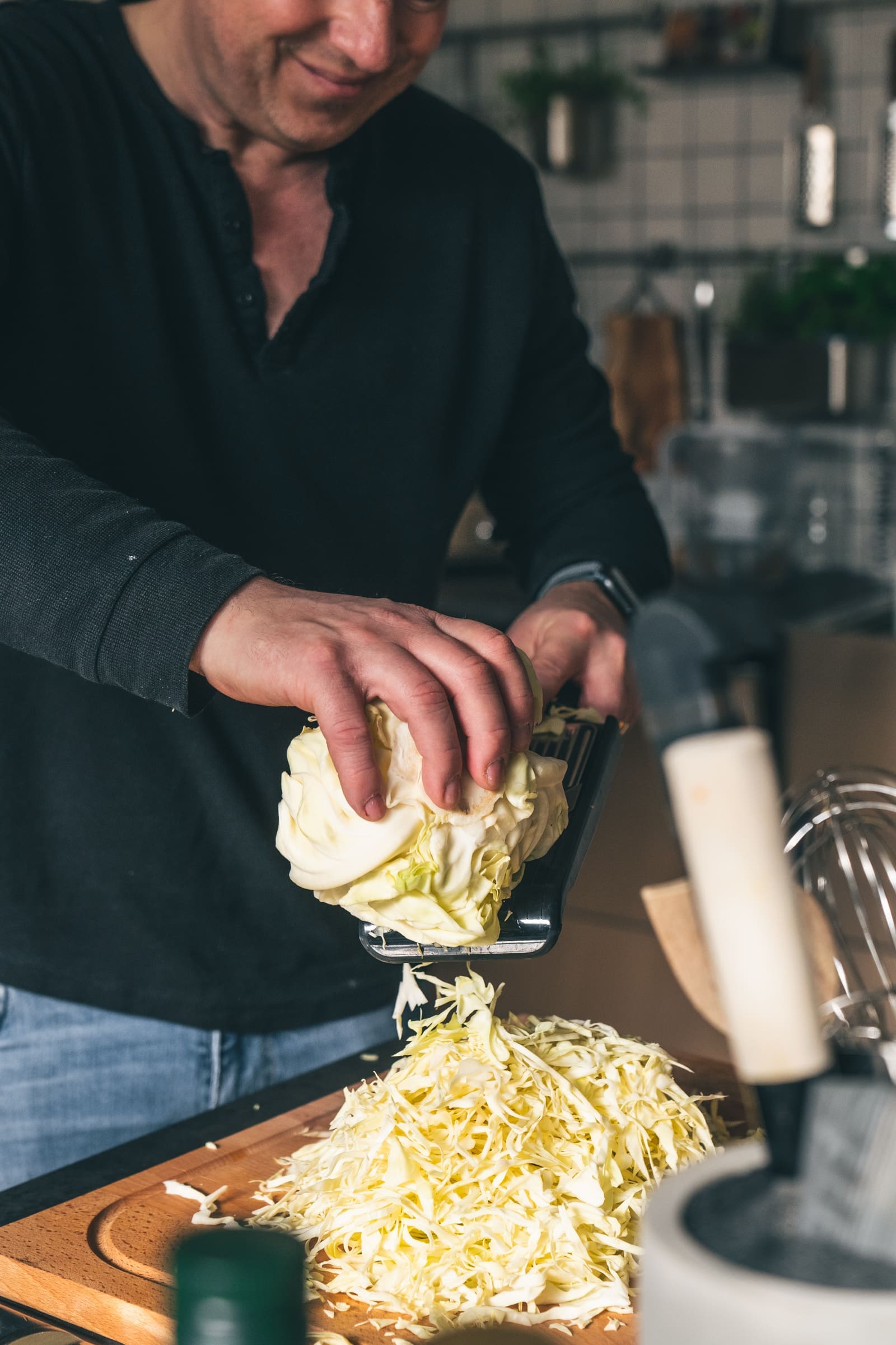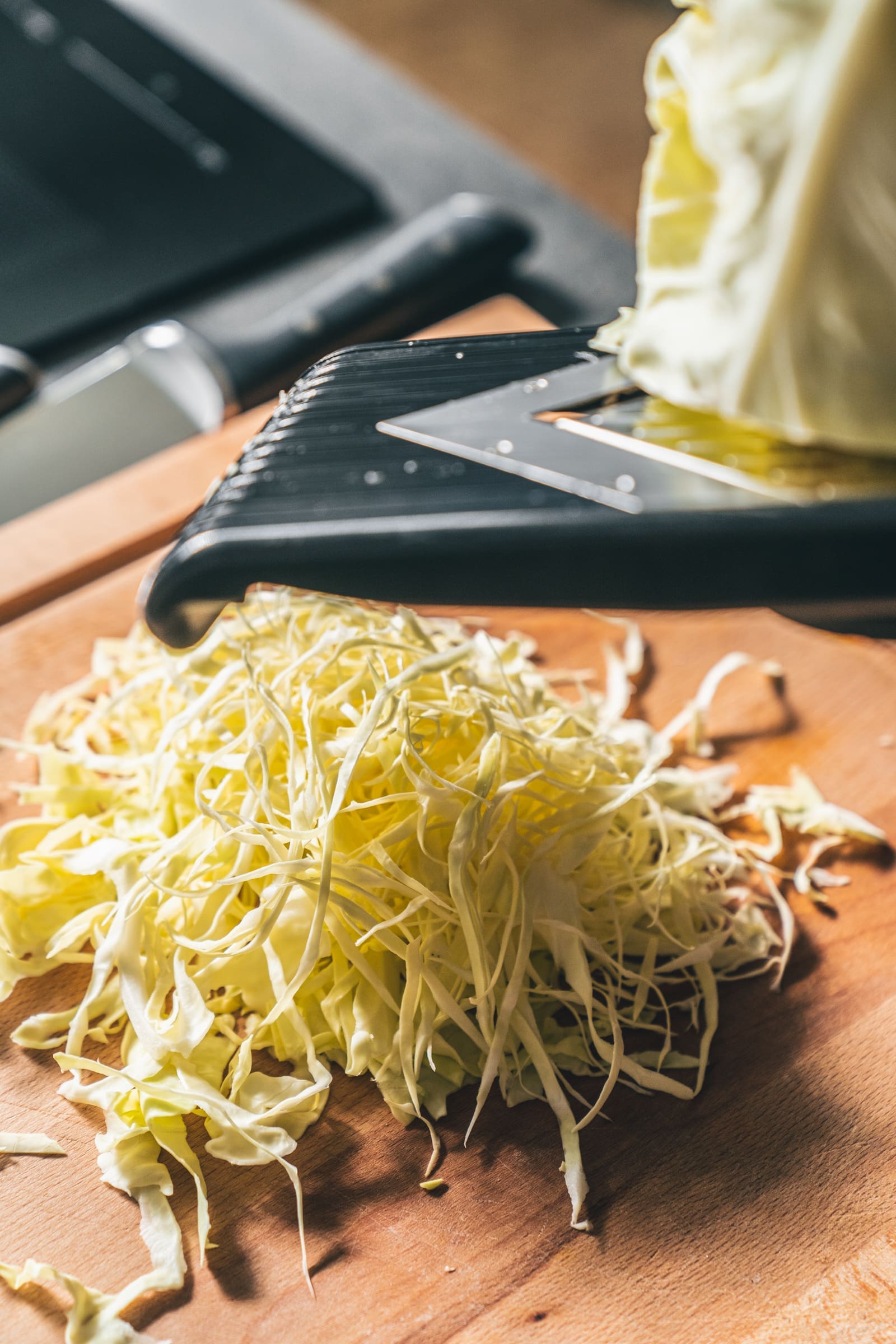1. Schneidet den Spitzkohl mit einem Messer in feine Streifen oder reibt ihn über einen V-Hobel. Gebt den Kohl in eine Schüssel, verteilt das Salz darüber und knetet den Salat mit den Händen einmal gründlich durch und stellt ihn zur Seite.