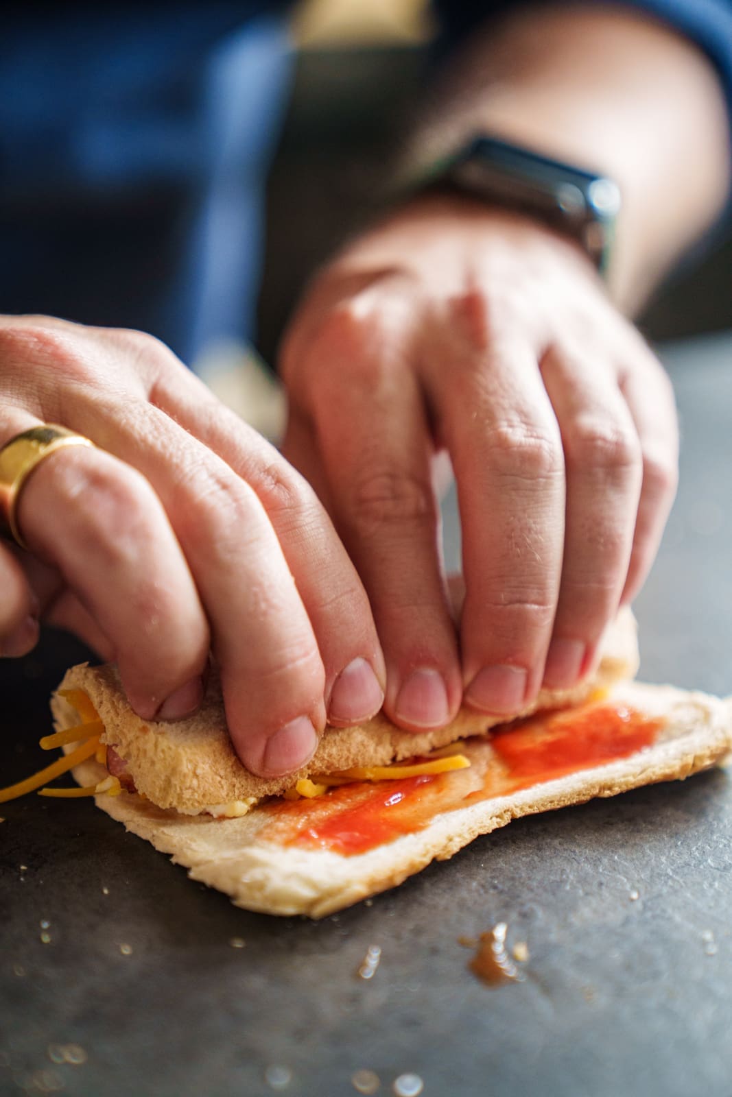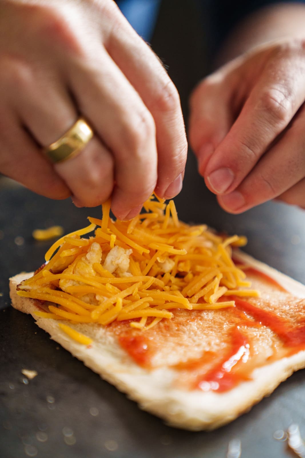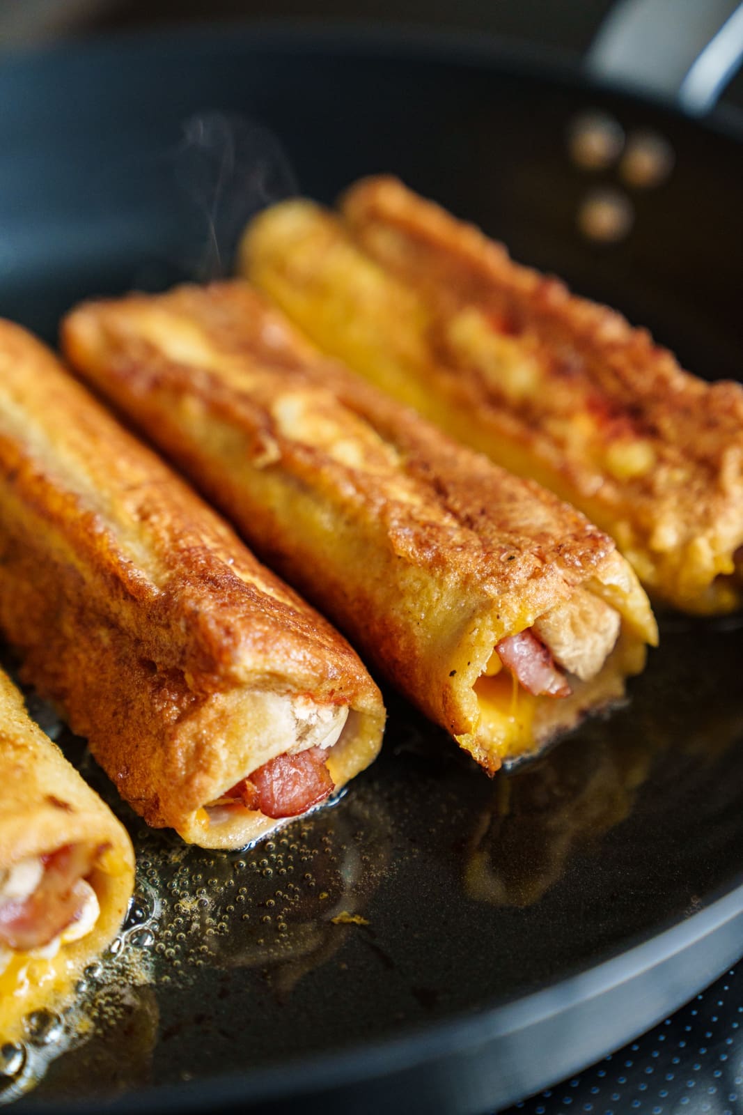 - Rollt mit einem Nudelholz die Toastscheiben platt aus, bestreicht sie mit Ketchup und legt je 2 Scheiben Bacon auf ein oberes Ende der Scheibe. Setzt etwas Rührei darauf und verteilt Cheddar darüber. Rollt nun von der belegten Seite her die gefüllte Toastscheibe eng zusammen und tränkt sie rundum mit der Ei-Mischung.