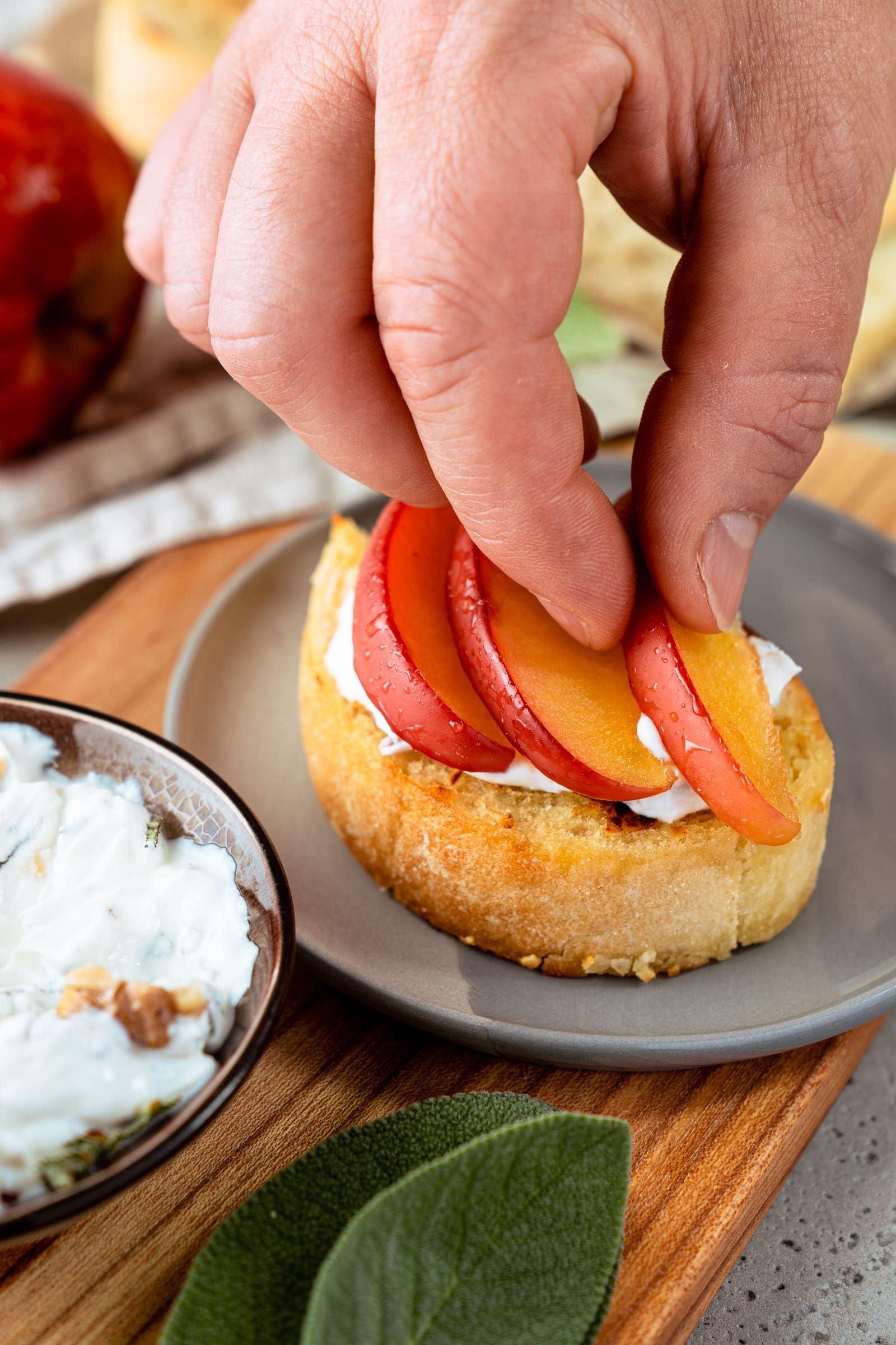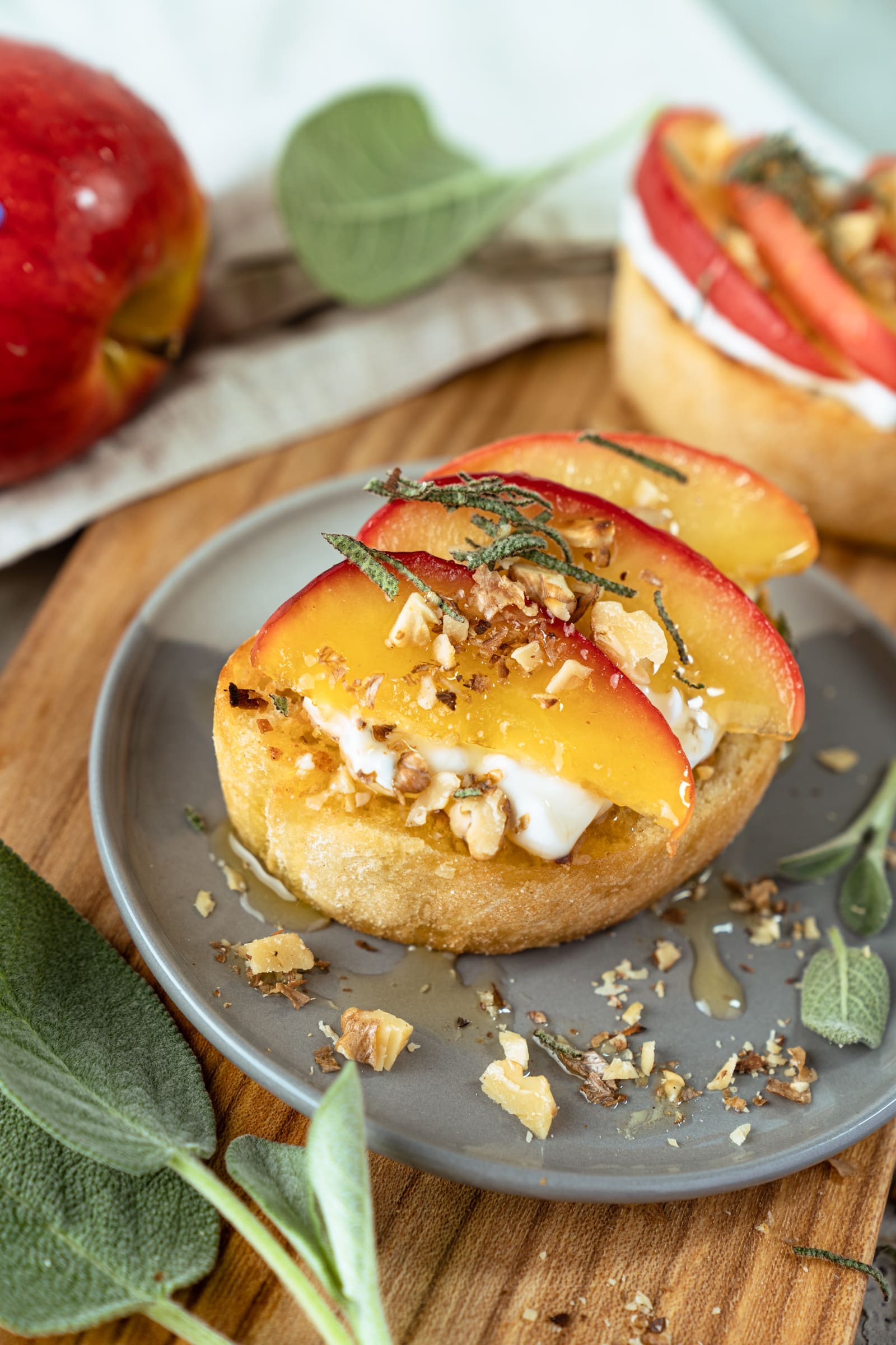 - Das Belegen geht ganz easy. Ihr nehmt eine Scheibe geröstetes Ciabatta, streicht etwas von der Creme darauf, belegt mit 3 Apfelspalten, bestreut mit Walnüssen und etwas Salbeistreifen und fertig ist euer Apfel-Bruschetta.