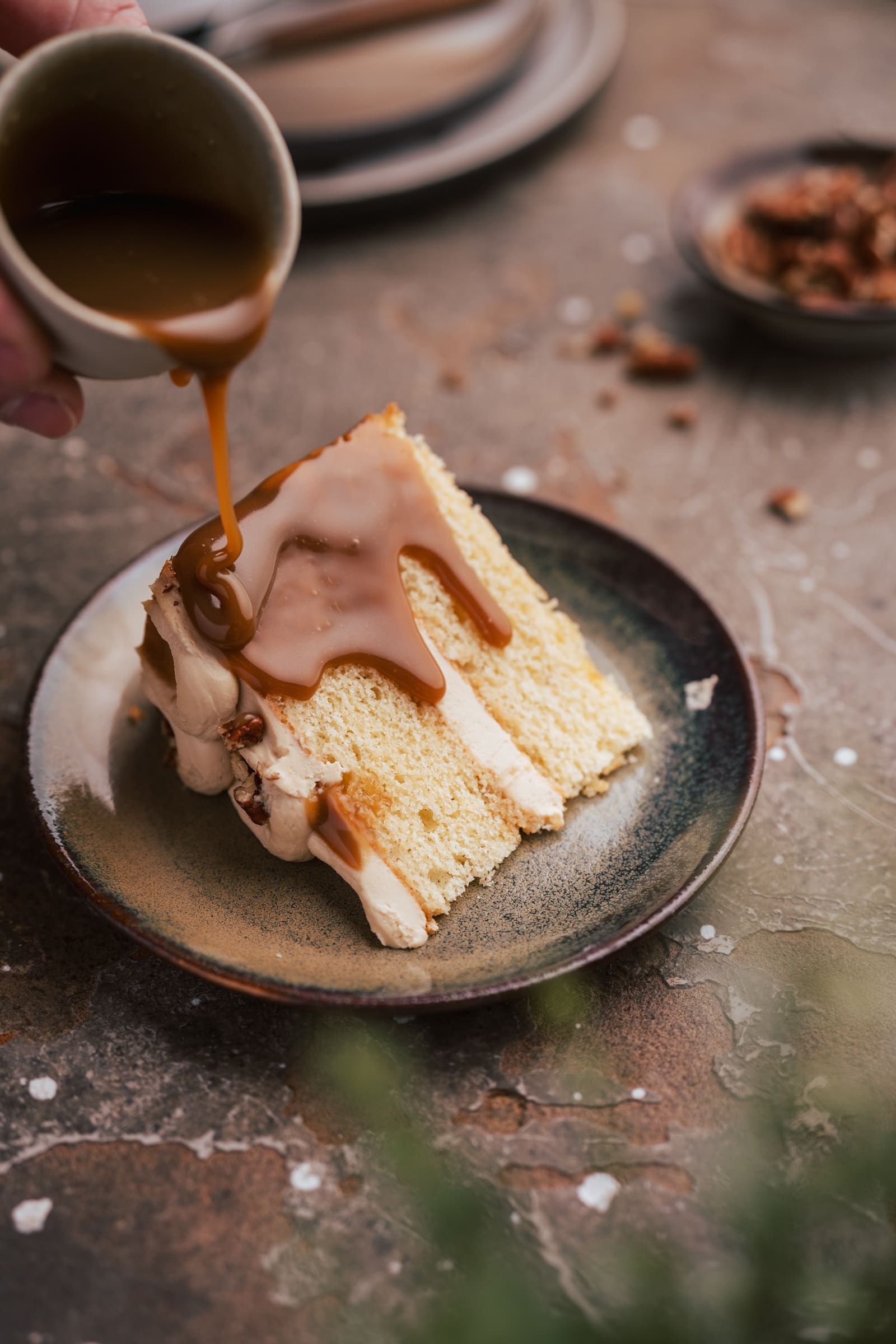 Wenn ihr möchtet, verteilt noch vom Toffee darüber und verziert mit ein paar gebröselten Pekanüssen.