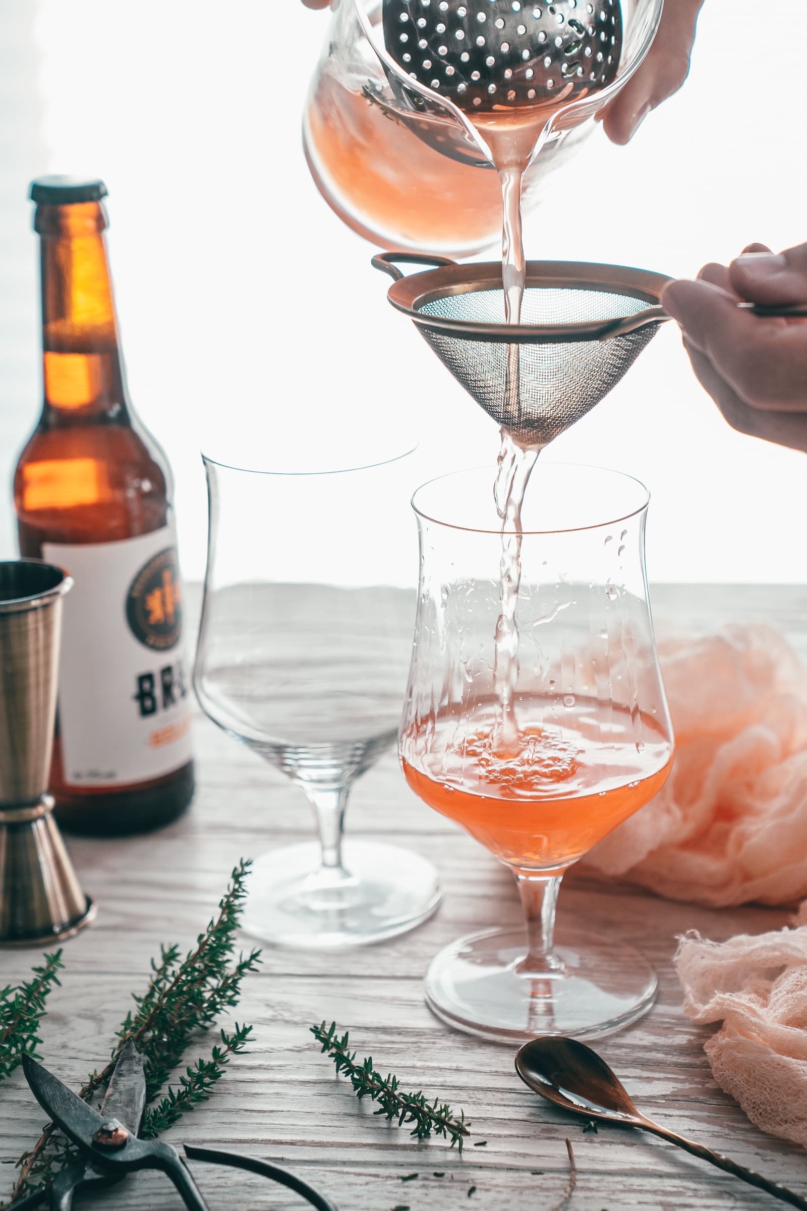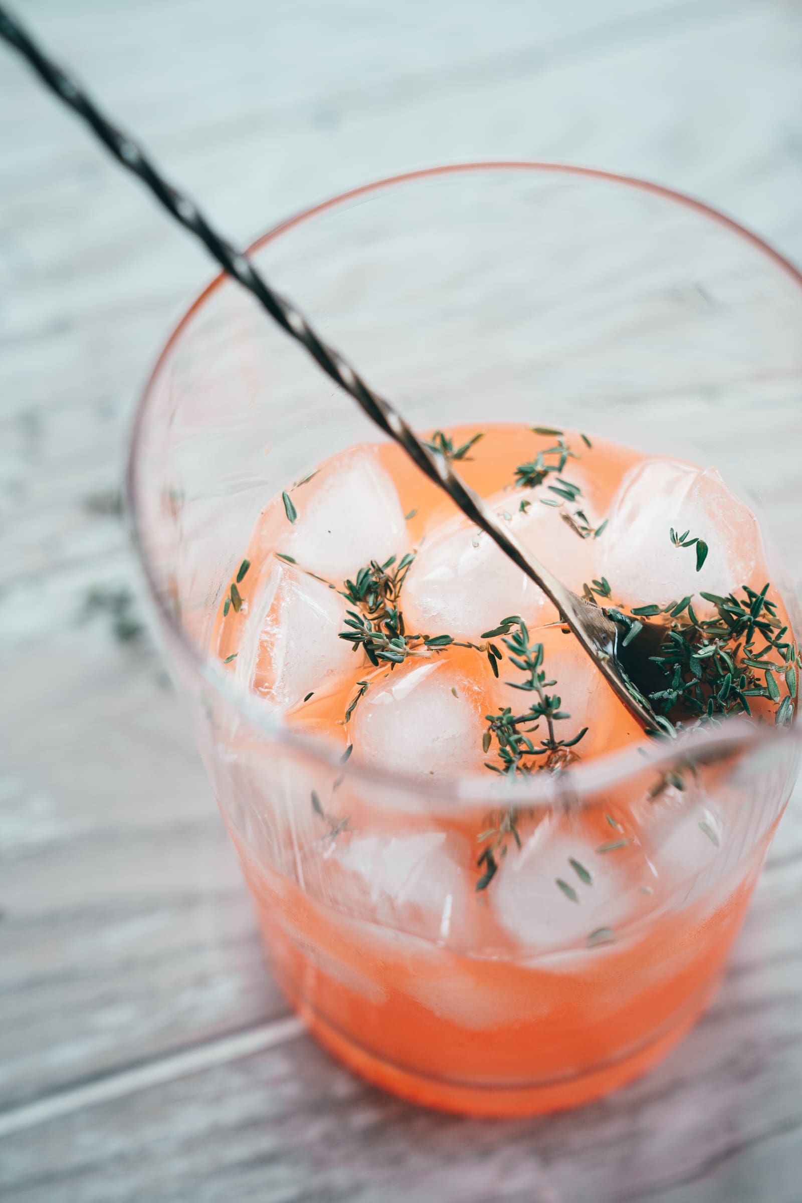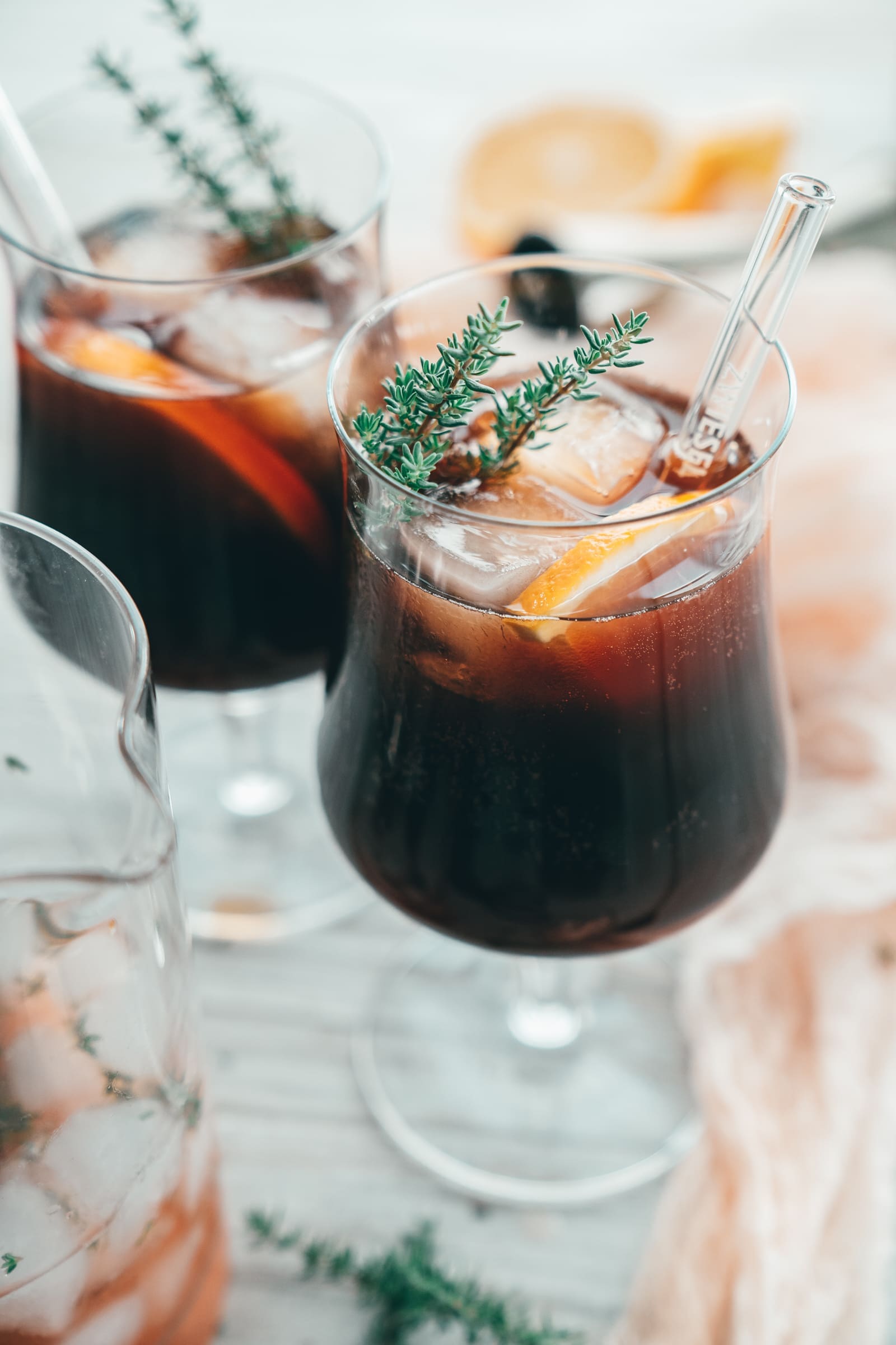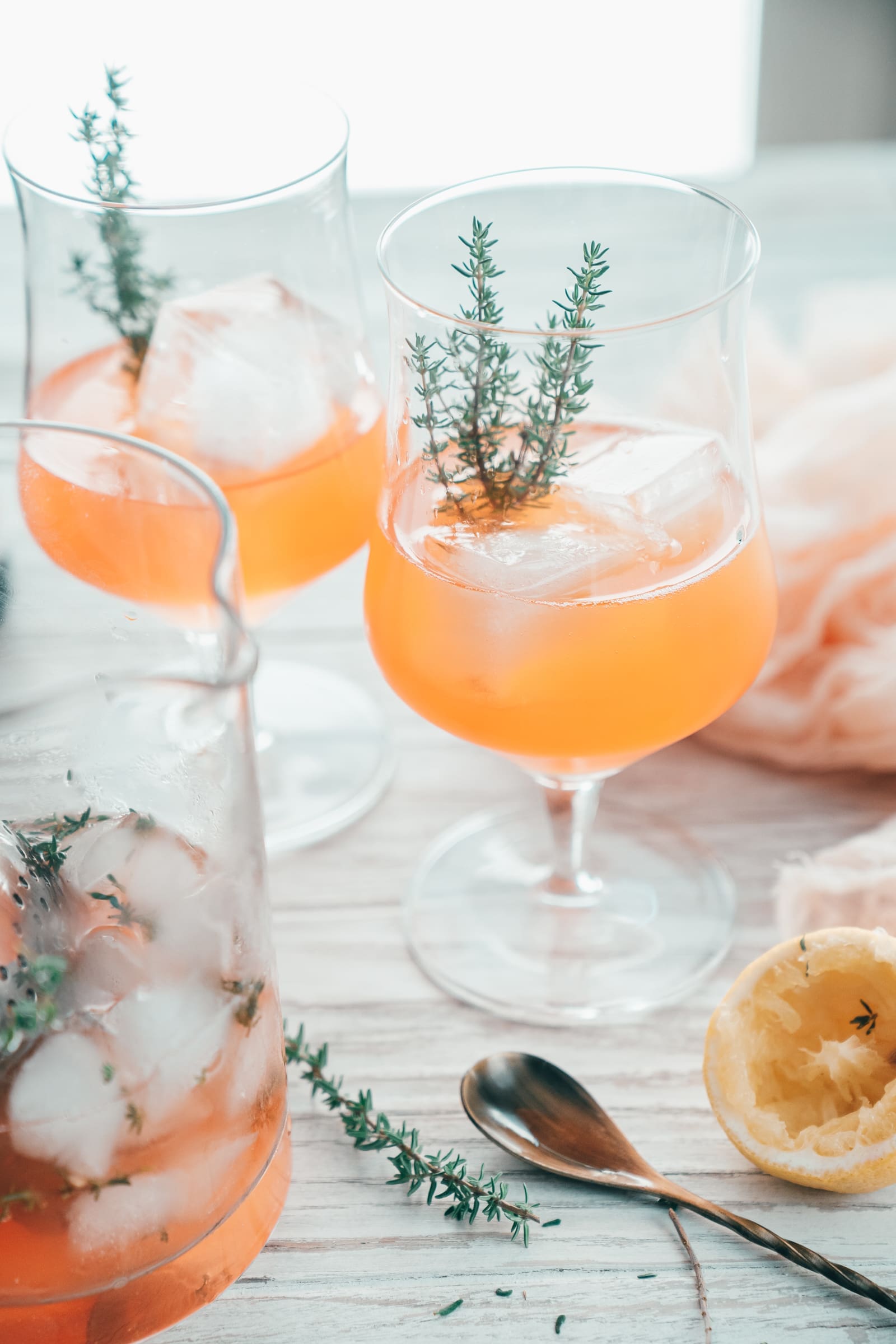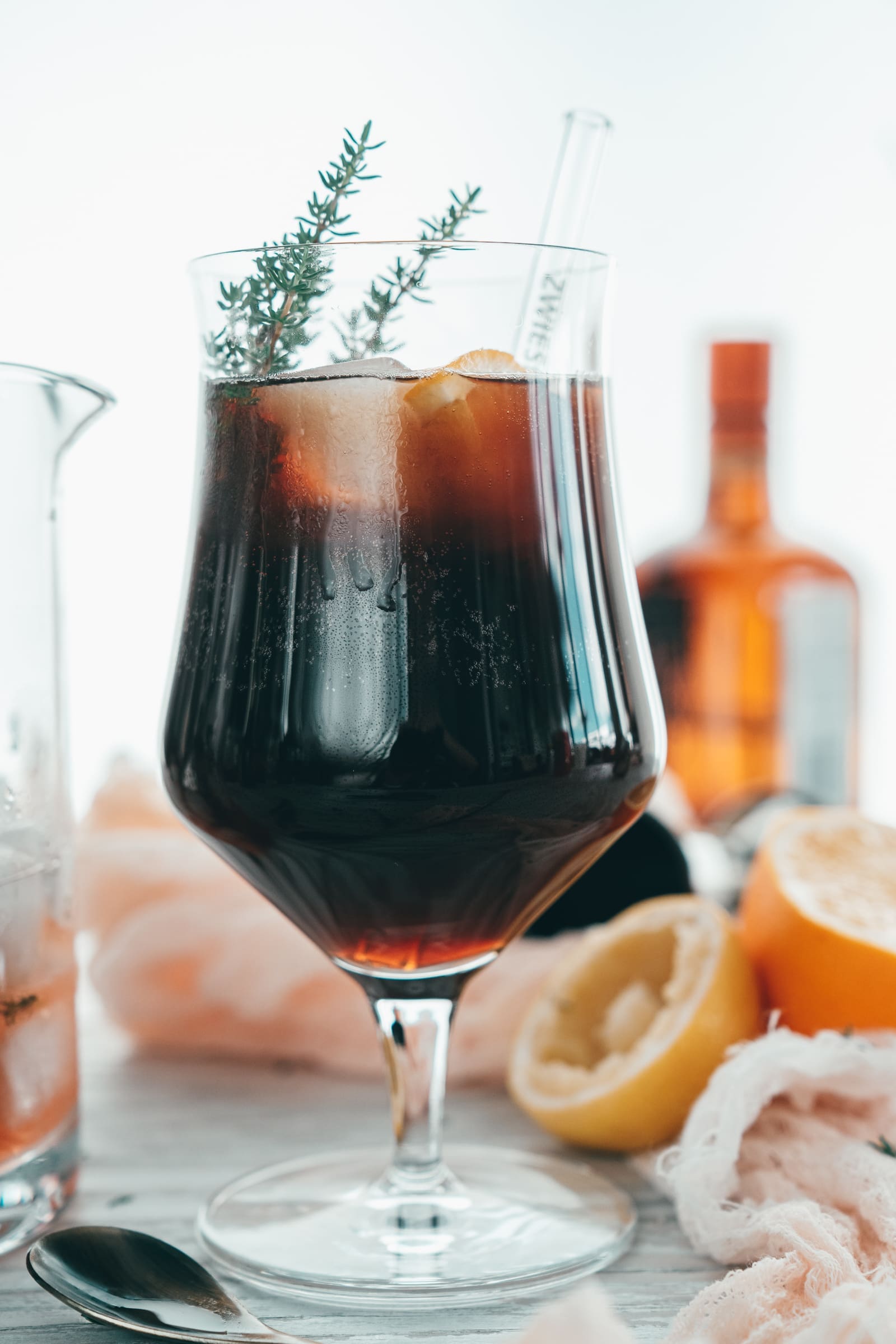 - In zwei bauchige Biergläser gebt ihr je 2-3 Eiswürfel und teilt das Limonadengemisch auf die beiden Gläser auf. Gebt je 1-2 Thymianzweige und eine halbierte Orangenscheibe in das Glas.