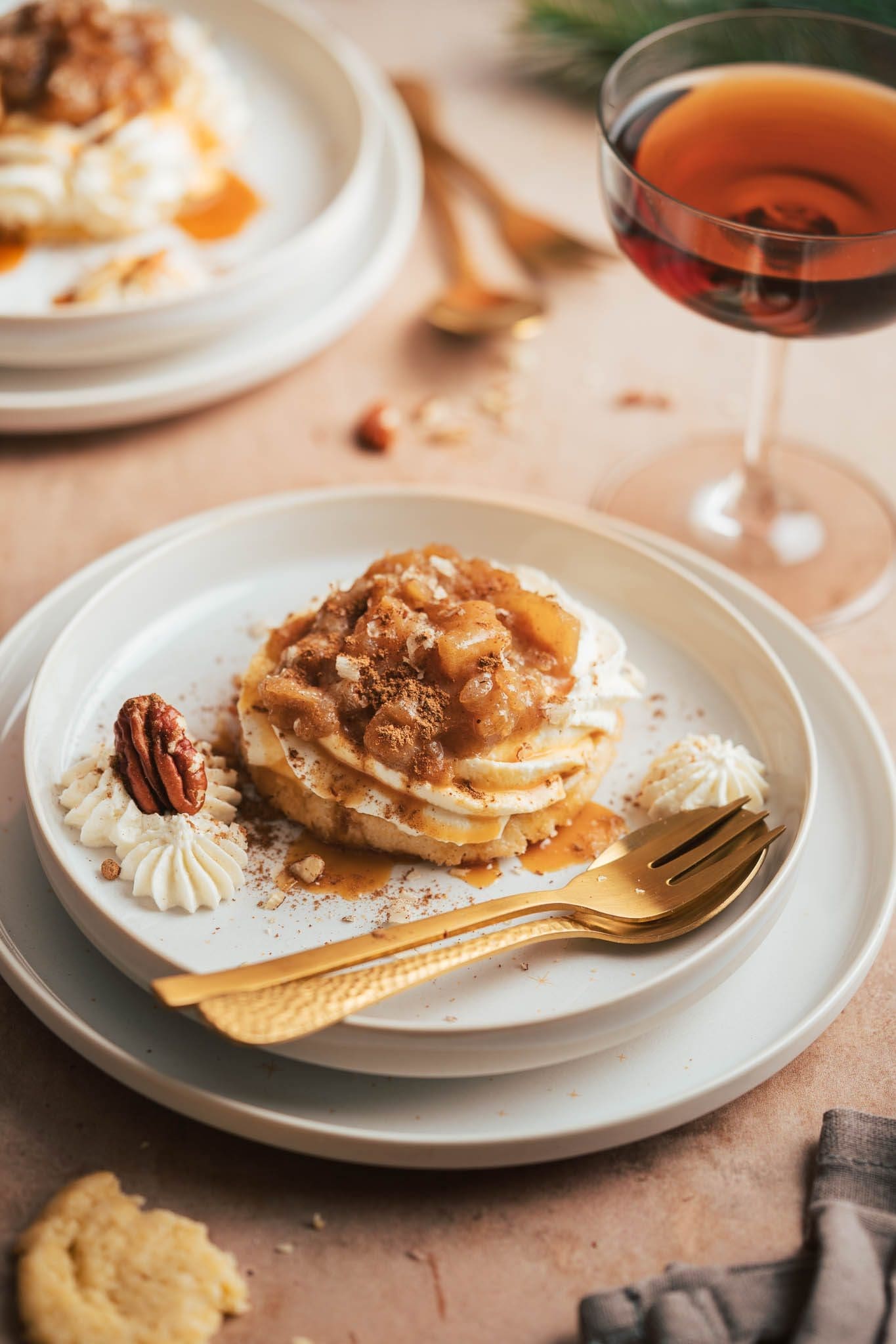 Aber was meint dekonstruiert eigentlich? Das bedeutet, man nimmt sich einzelne Bestandteile eines Gerichtes und baut sie anders und/oder neu zusammen. Wenn wir an Apfelkuchen denken, dann haben wir hier Mürbeteig, eine Apfelmasse, Sahne und Nüsse oder Rosinen. Wir haben also ein Mürbeteigplätzchen gebacken, eine kalte Apfelmasse hergestellt, aus der Sahne wurde eine Frischkäse-Sahne-Creme und die Pekannüsse haben wir über das Dessert gerieben. FERTIG! Unser Highlight an unserem dekonstruierten Apfelkuchen ist, dass ihr alle Komponenten perfekt vorbereiten könnt. Wenn dann aufgetischt werden soll, habt ihr alles schnell zur Hand und könnt das Dessert genießen ohne lange Wartezeiten.