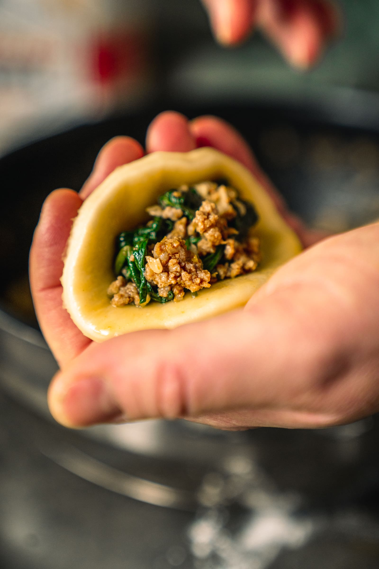 - Nehmt einen Teigkreis in eine Hand und gebt 2-3 TL der Füllung in die Mitte. Klappt den Teig zu einem Halbkreis zusammen und verschließt mit den Fingerspitzen den Rand. Drückt dann noch mit einer Gabel entlang des Rands an, damit er nicht aufgeht.