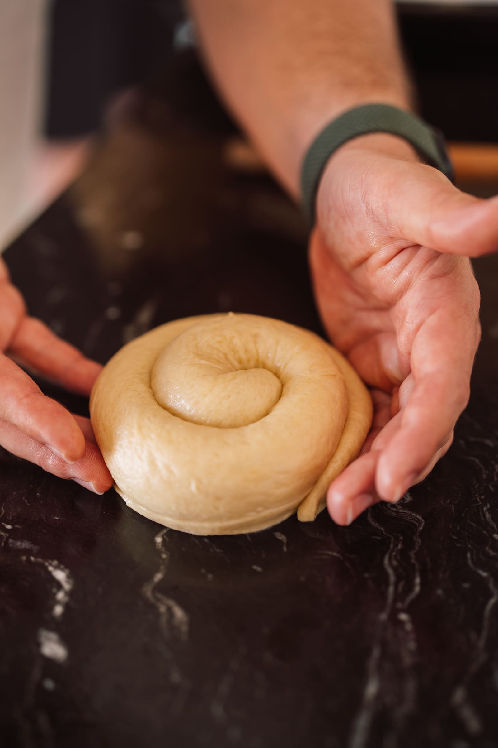 - Rollt die Stränge dann jeweils zu einer Schnecke auf und setzt sie auf ein mit Backpapier ausgelegtes Backblech. Nicht zu dicht, denn sie gehen nochmals für 1 Stunde unter einem Tuch. Sollten sie aber aneinander kommen, ist das auch nicht schlimm. Nach dem Backen könnt ihr sie einfach wieder trennen.