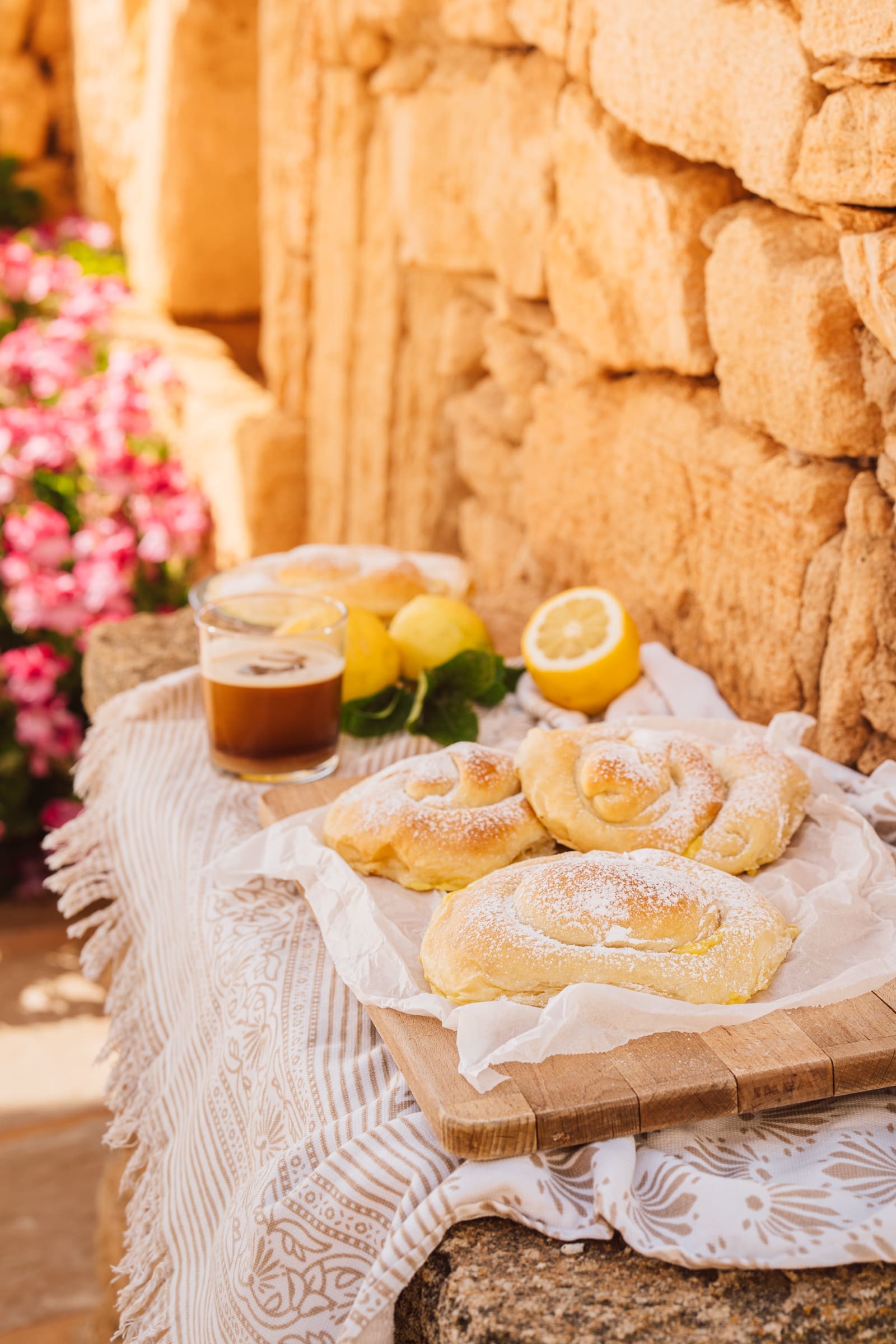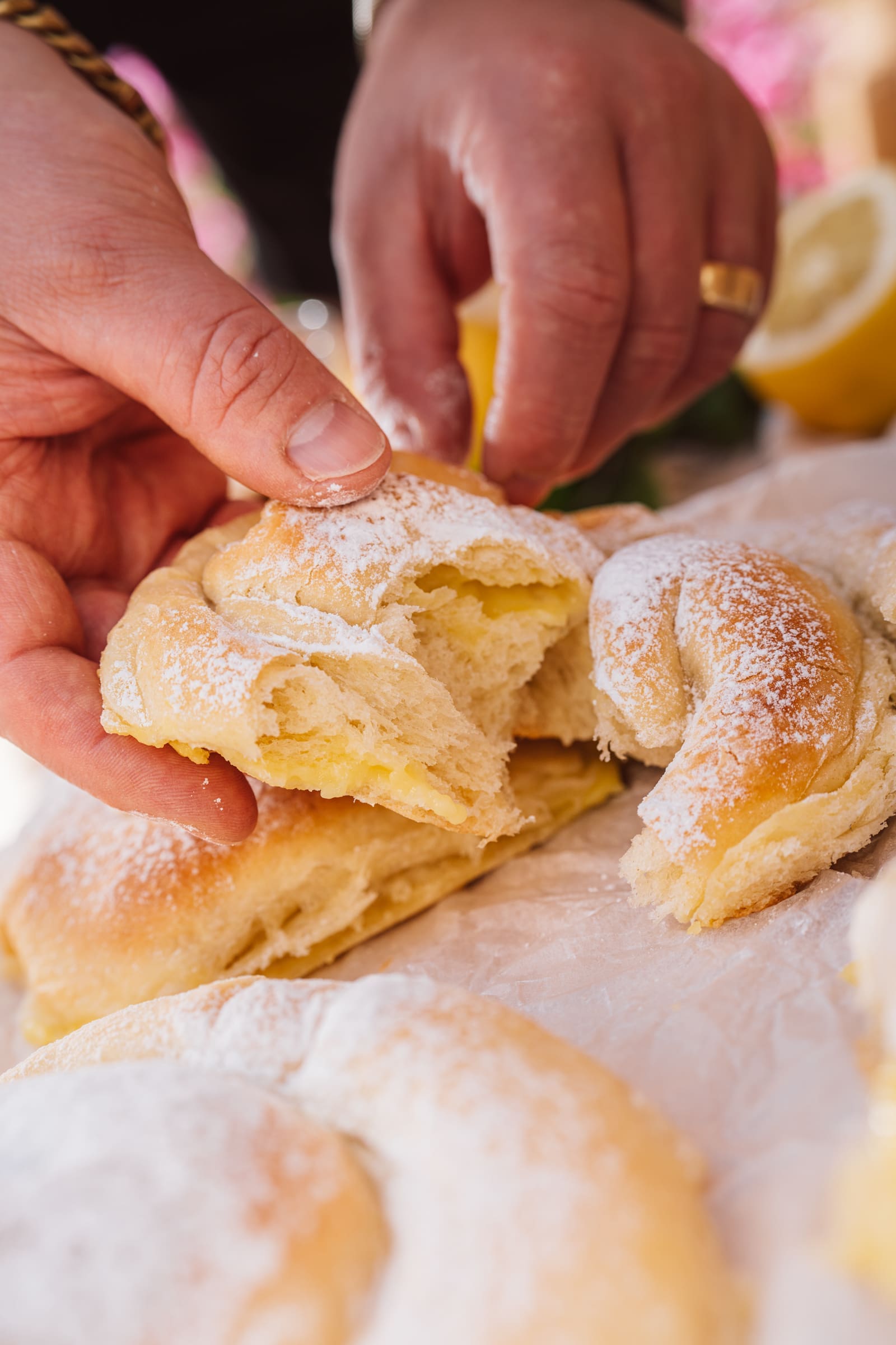 Und auch wenn die einfachste Art gewesen wäre, die Ensaimadas ohne Füllung zu backen, hatten wir da einen anderen Plan. Auch wenn der nicht ganz original ist. In unserem Garten standen zwei schöne und prall gefüllte Zitronenbäume. Die trugen so viele Früchte, dass wir uns jeden Tag hätten Limonade damit machen können, ohne dass aufgefallen wäre, das welche fehlen. Die Zitronen haben wir verwendet, um einen frischen Zitronenpudding zu kochen, den wir als Füllung mit in die Ensaimadas gegeben haben. Wir finden, dass sich unsere ersten Ensaimadas ohne Probleme hätten verkaufen lassen können. Und weil sie so lecker waren, werden wir sie auch zu Hause noch das eine oder andere Mal nachbacken und weitere Füllungen ausprobieren.