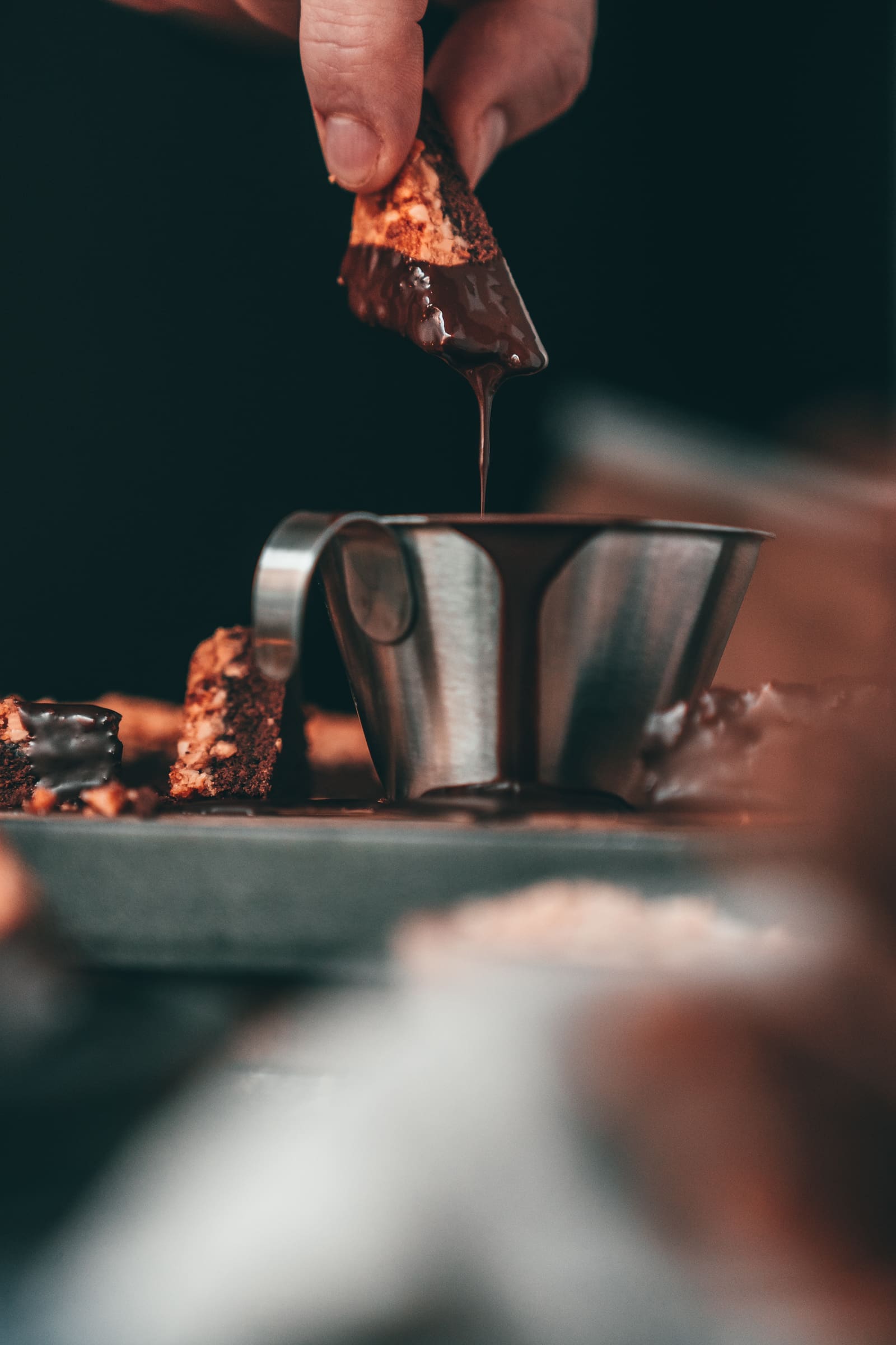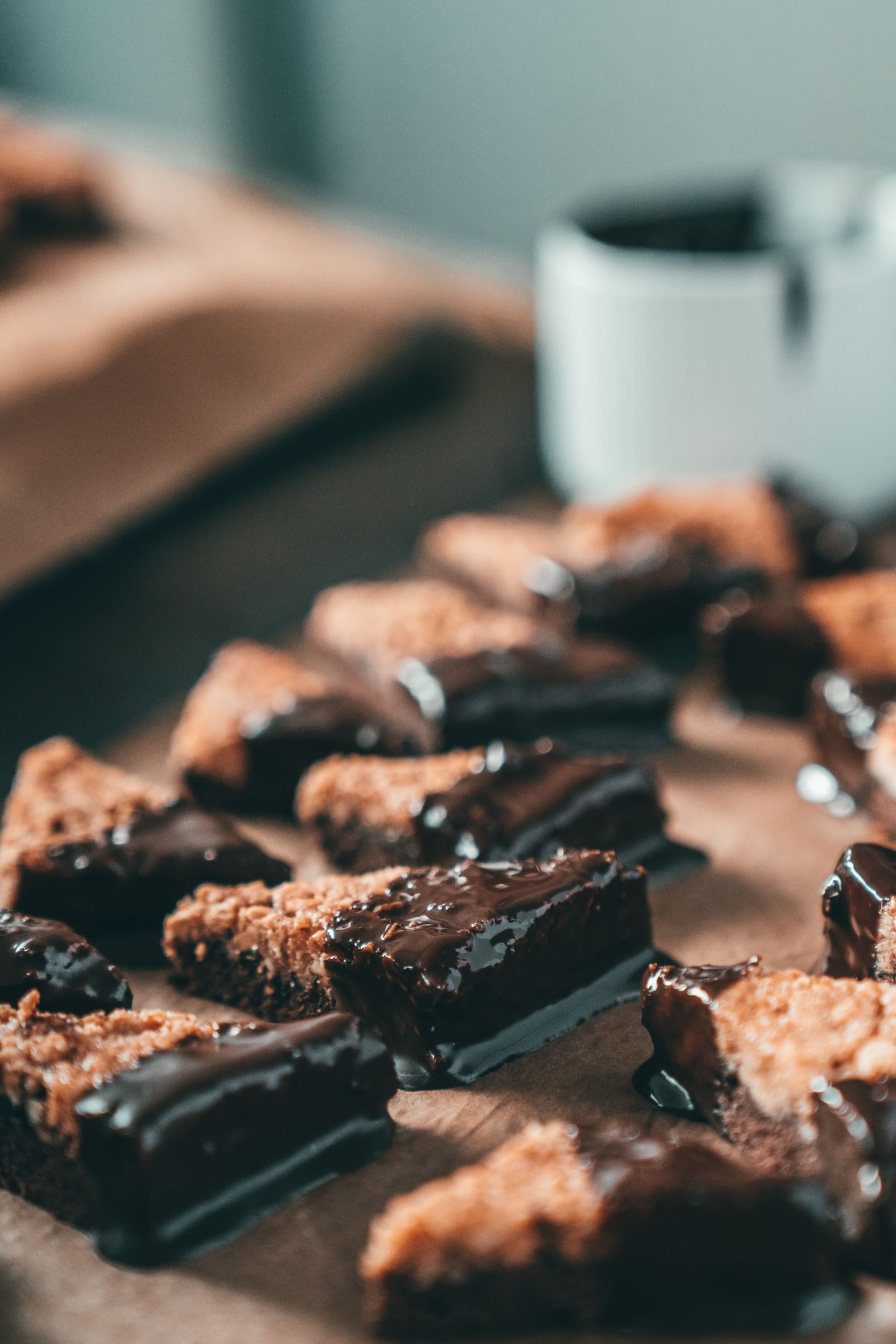 - Während des Auskühlens könnt ihr schon kleine Dreiecke aus dem gebackenen Boden schneiden, die ihr, sobald sie ganz kalt sind, in erhitzter Schokoladenglasur teils eintauchen und auf dem schon benutzten Blatt Backpapier, trockenn lassen könnt.
