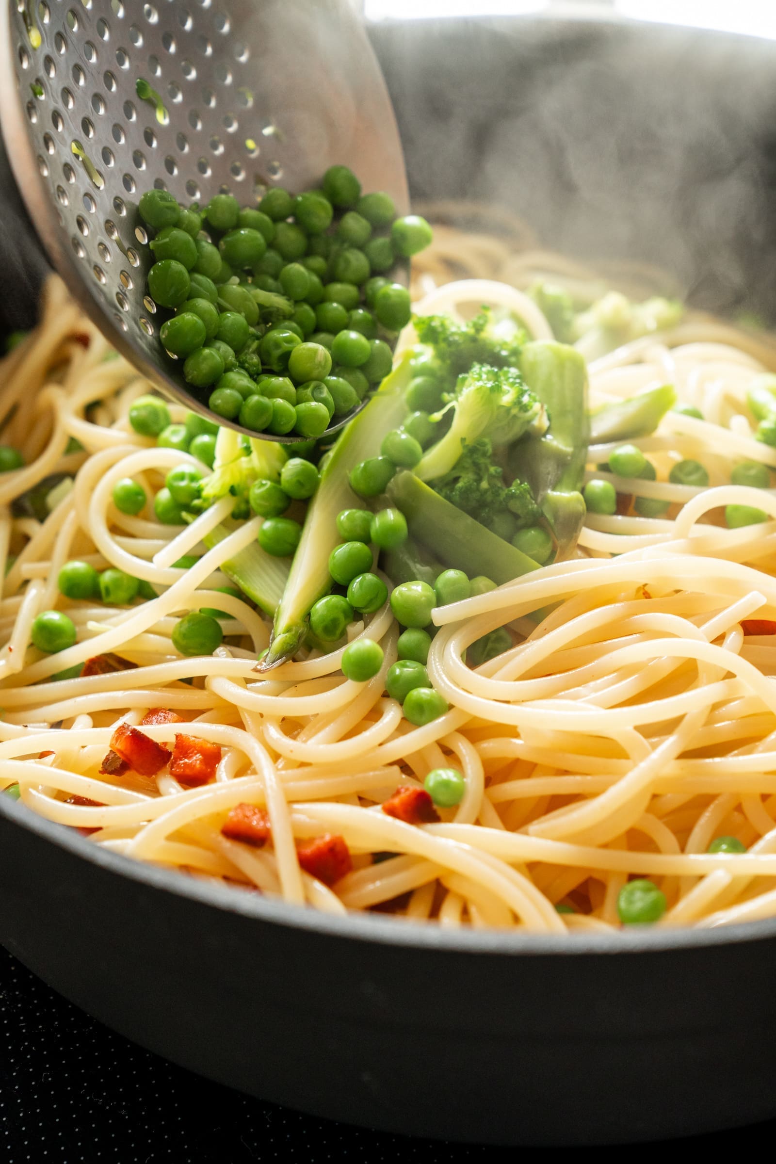 - Ebenfalls gleichzeitig bringt Ihr in einem großen Topf ausreichend gesalzenes Wasser zum Kochen. Kocht die Pasta nun nach Packungsangabe und gebt für die letzten 3 Minuten den Spargel und Broccoli mit ins Nudelwasser. Die Erbsen kommen für die letzten 30 Sekunden dazu.350 g Spaghetti, 125 g grüner Spargel, 125 g Erbsen, 125 g Broccoli