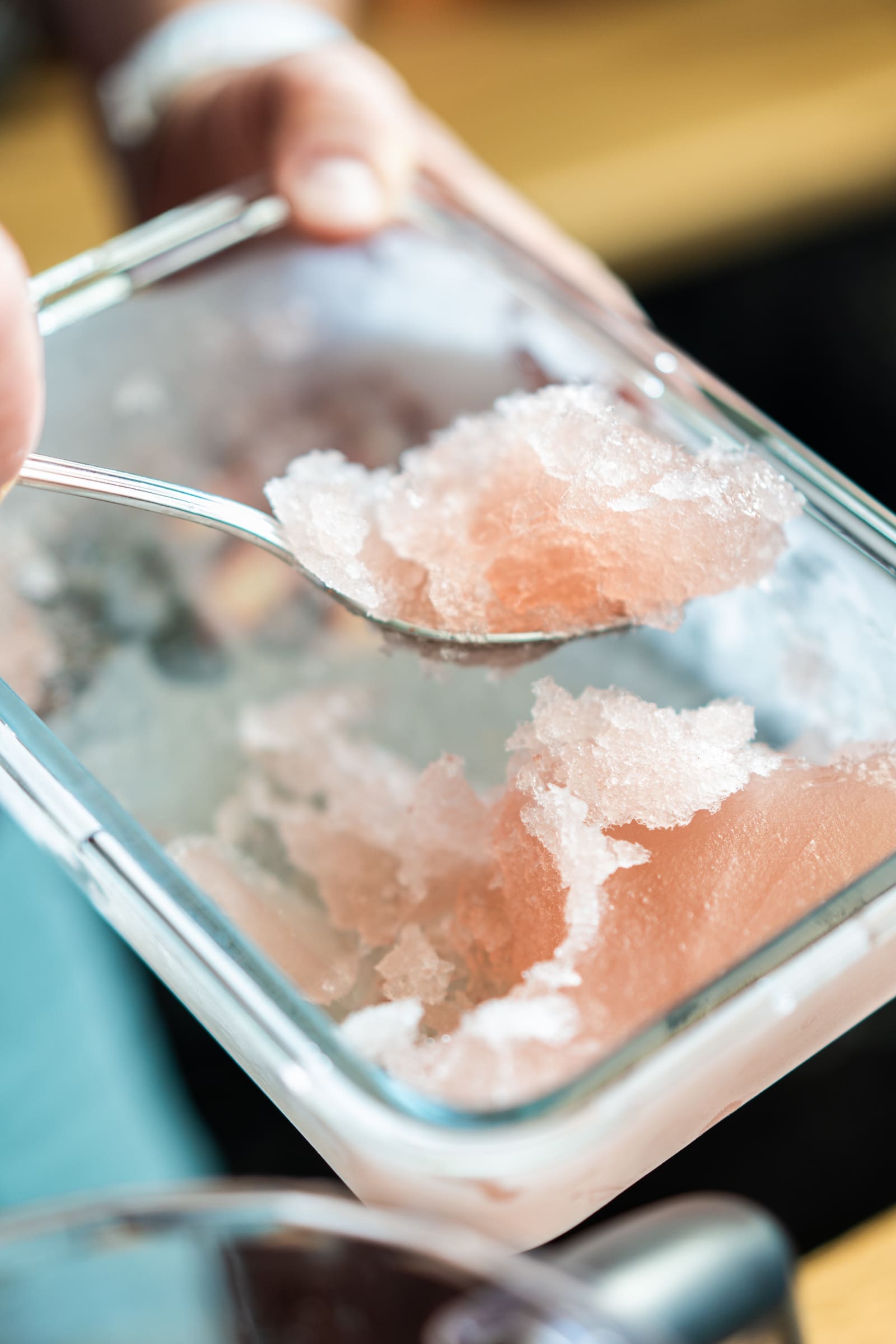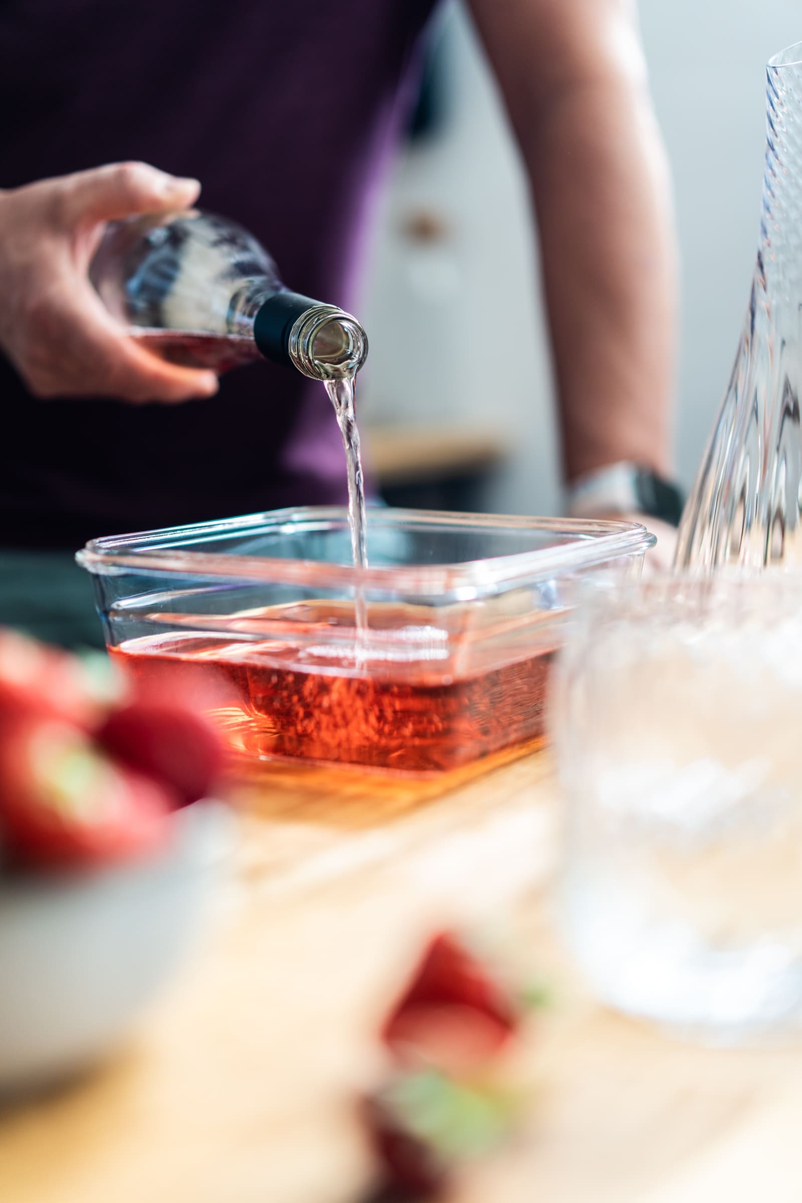 - Schüttet den Roséwein in einen Behälter, den Ihr einfrieren könnt und der den Wein nicht auslaufen lässt. Stellt das Gefäß für mindestens 8 Stunden in den Tiefkühler.