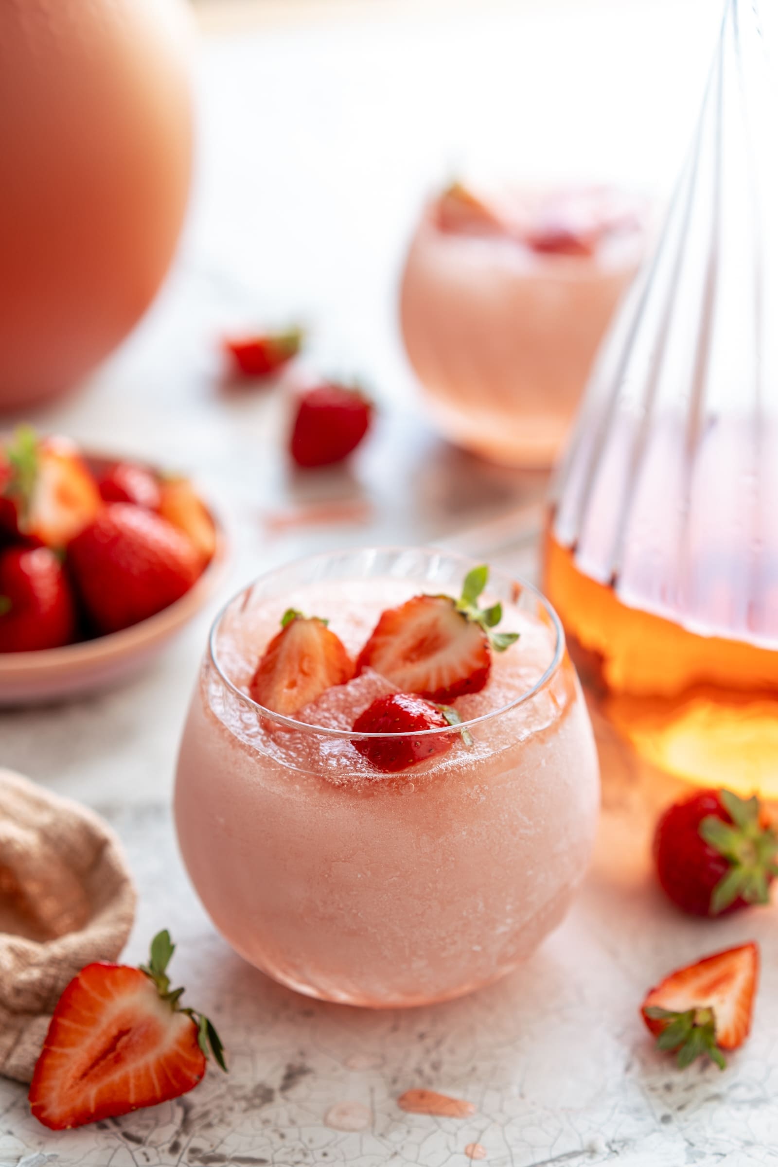 Ab jetzt tatsächlich immer für die nächsten Monate. Das könnt Ihr uns glauben. Und jetzt wisst Ihr auch schon, was eigentlich ein Frosé ist. Hauptsächlich besteht er aus gefrorenem Roséwein. Dazu kommt dann noch ein Sirup Eurer Wahl. War haben uns für die Erdbeere entschieden.