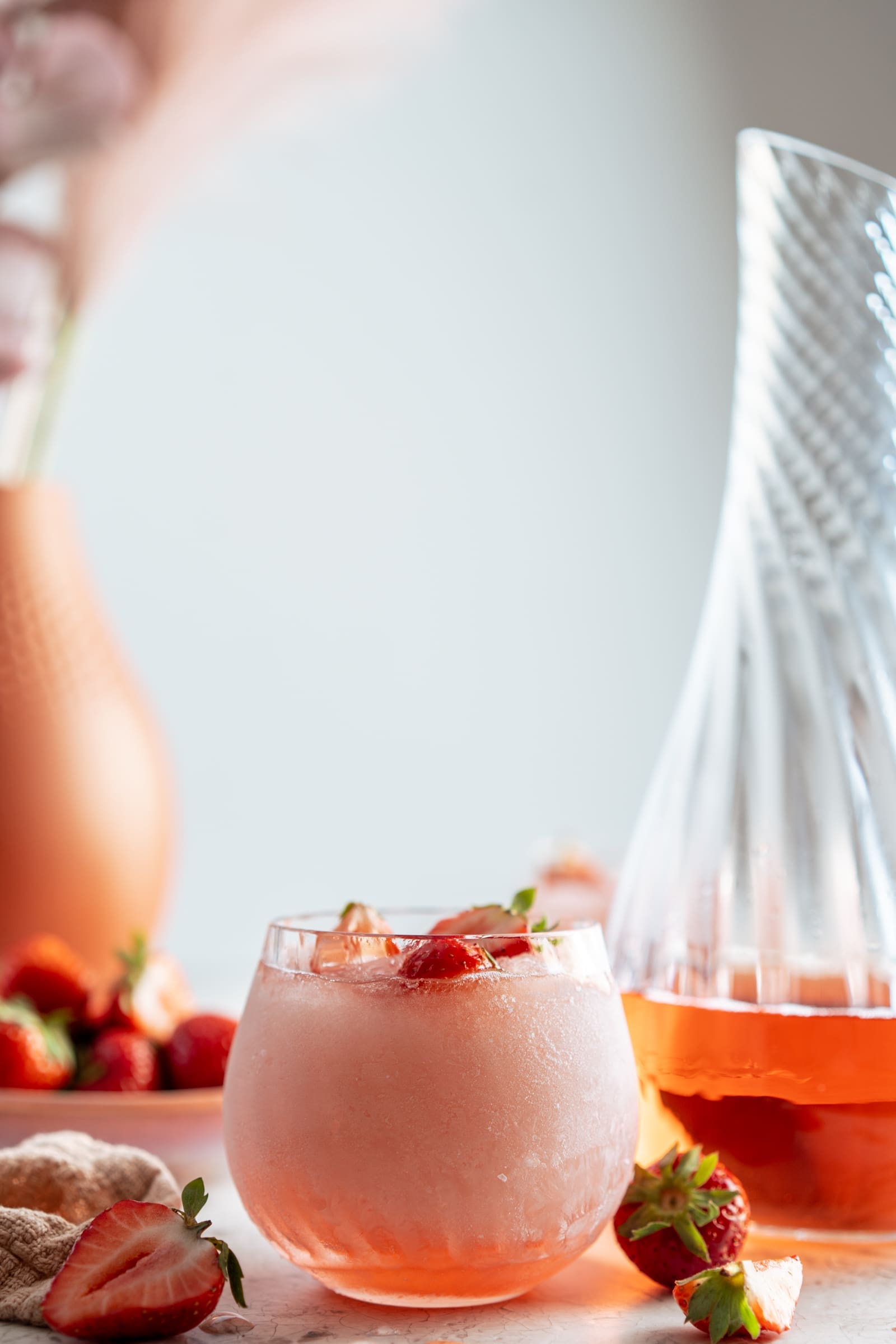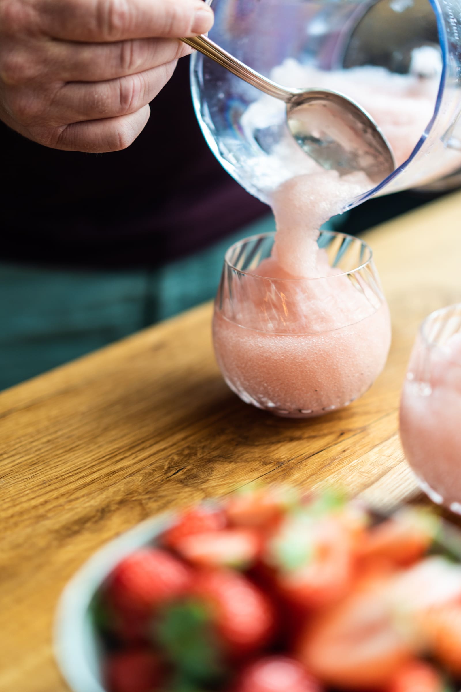 Wir hatten ursprünglich überlegt, unseren Frosé in einem schicken Weinglas zu servieren. Natürlich kam uns dieser Gedanke, denn einen Rosé würden wir ja auch daraus trinken. Aber weil ein Frosé optisch ja eher einer Margarita oder einem Daiquiri ähnelt, fanden wir das gar nicht mehr so passend. Wir haben uns bei den neuen 2022er Neuheiten von Zwiesel Glas umgeschaut und fanden die unglaublich schön gedrehten Linien der Kollektion Manoa einfach so passend, dass wir nicht lange darüber diskutieren mussten.