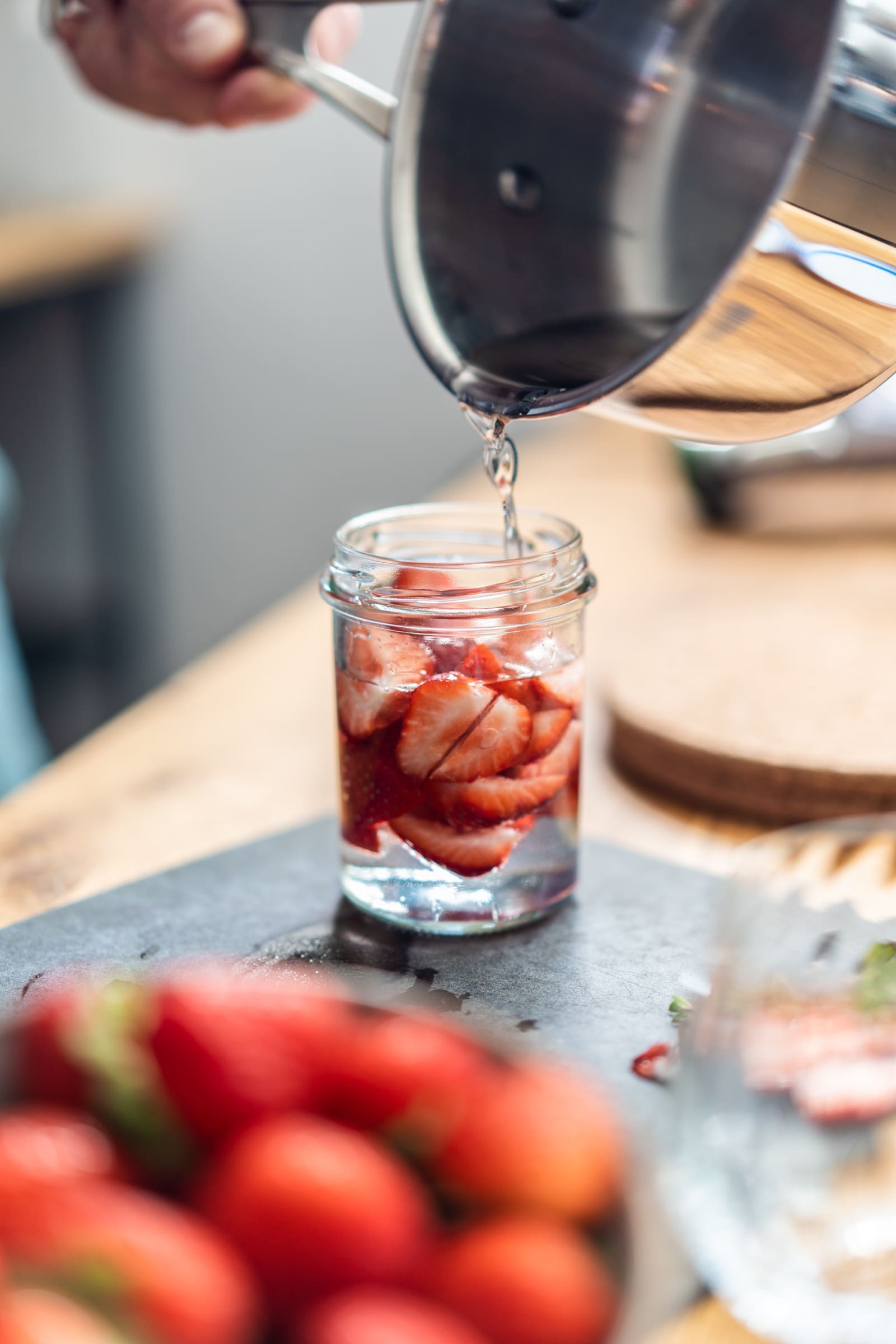 - Kocht in einem kleinen Topf den Zucker mit dem Wasser unter Rühren auf und lasst den Sirup für ca. 4-5 Minuten köcheln. Nehmt den Topf vom Herd und gießt den Sirup über die Früchte ins Glas. Verschließt es sofort und lasst es so lange im Kühlschrank ziehen, bis der Rosé fertig gefroren ist.
