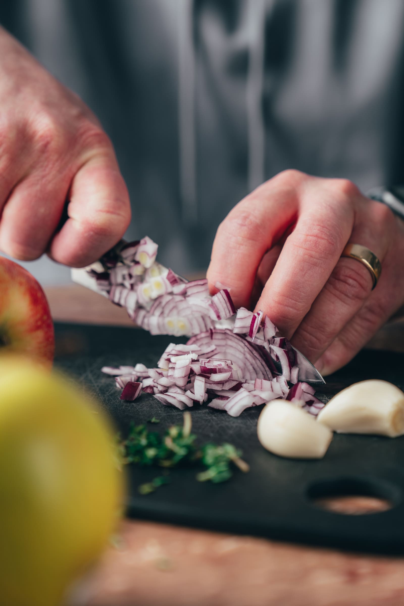 - Wascht euren Granny Smith, entkernt ihn und scheidet eine Hälfte davon in Würfel. Auch die Zwiebel und Knoblauchzehen schneidet ihr in Würfel.