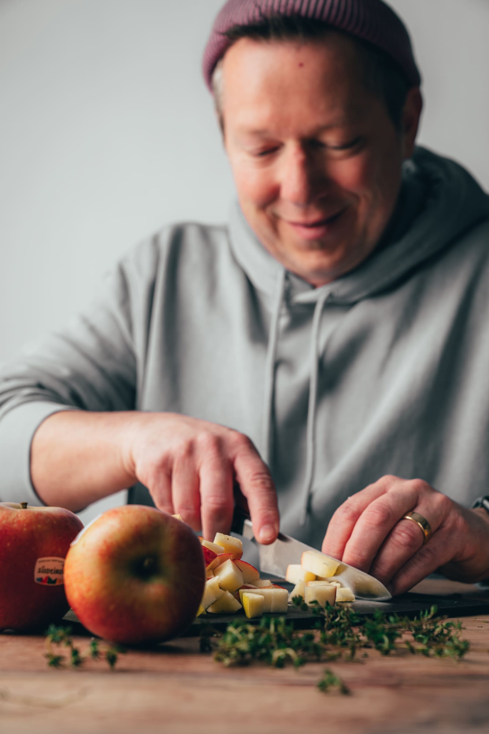 Wir haben uns für gleich zwei Sorten entschieden. Generell solltet ihr einen eher säuerlichen wählen und er darf auch gerne aromatisch sein, denn gegen das Aroma der Leber soll er defitniv ebenbürtig sein. Die Entscheidung hier mit 2 Sorten zu arbeiten, hat etwas mit der Festigkeit der Äpfel zu tun. Der Braeburn ist schön fest im Fruchtfleisch und sorgt für einen tollen Biss und der zartschmelzende Granny Smith verbindet sich optimal mit unserer Pastete.
