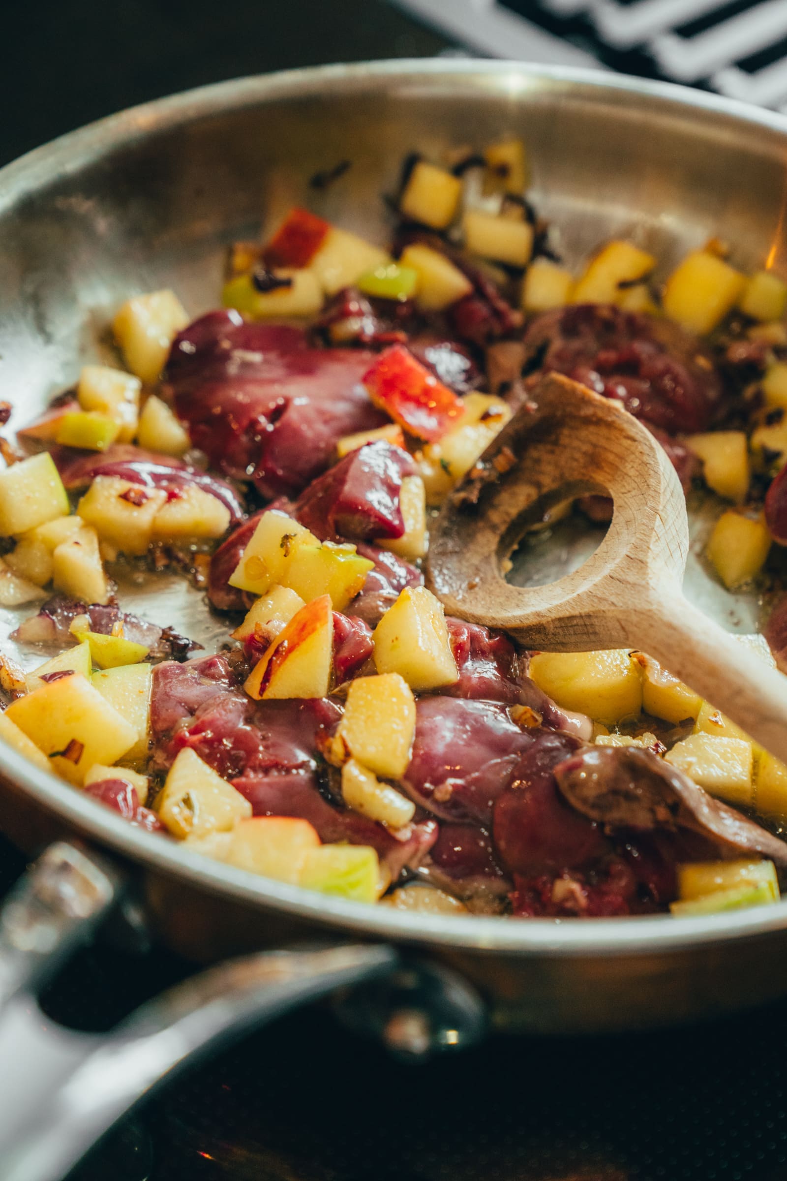 - Erhitzt nun eine Pfanne und bratet zunächst die Zwiebel und die Knoblauzehen mit etwas Olivenöl an. Gebt dann die Apfelwürfel und Thymian dazu und röstet auch diese. Dann kommt die Leber dazu. Röstet sie schön an, so dass sich auf dem Boden Röstrückstände bilden.