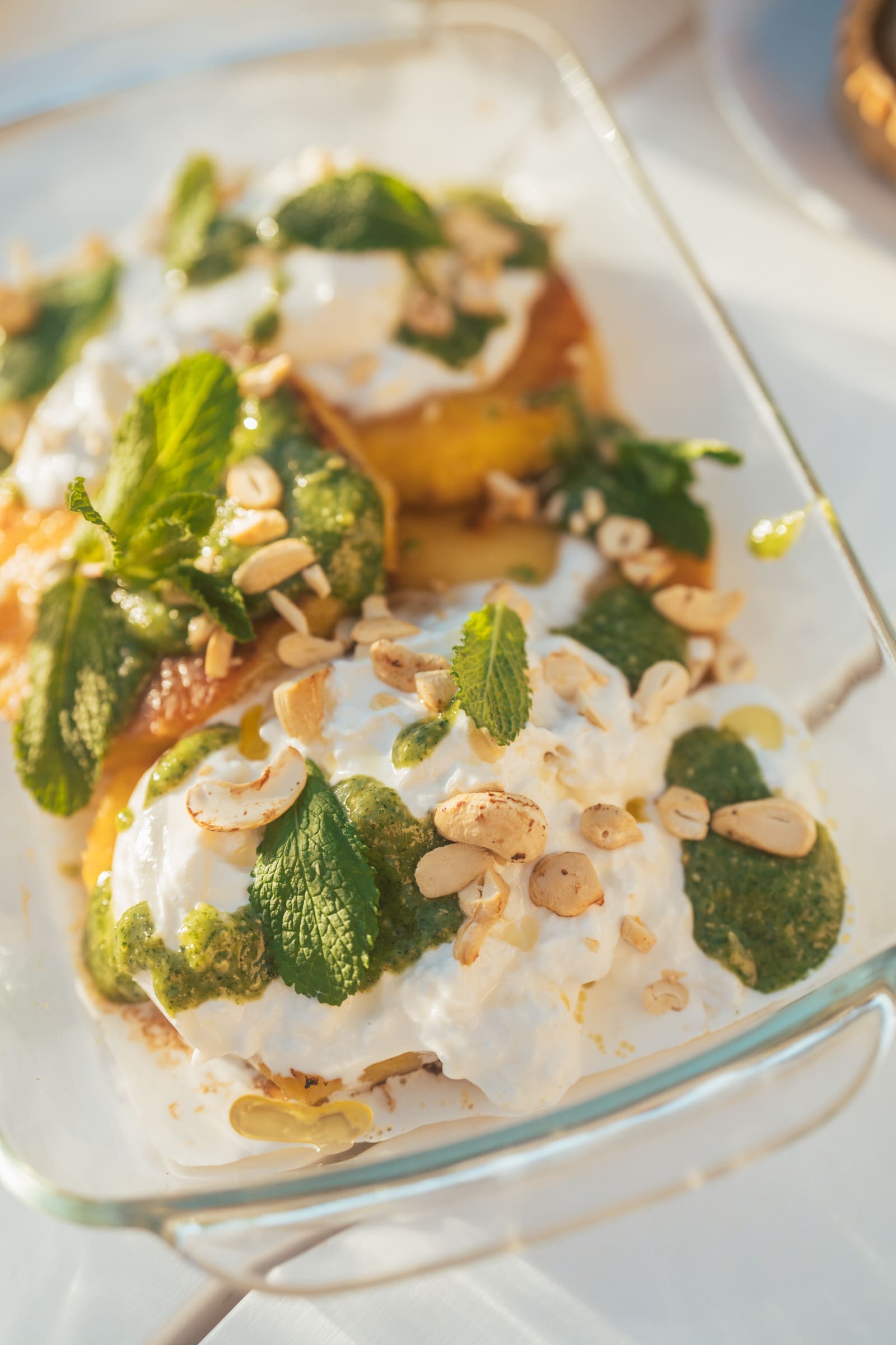 - Drapiert nun die Burrata darauf und gebt vom Pesto darüber. Mit angeröstete Cashew und Minzblättchen könnt ihr das Ganze zum Anrichten dekorieren.