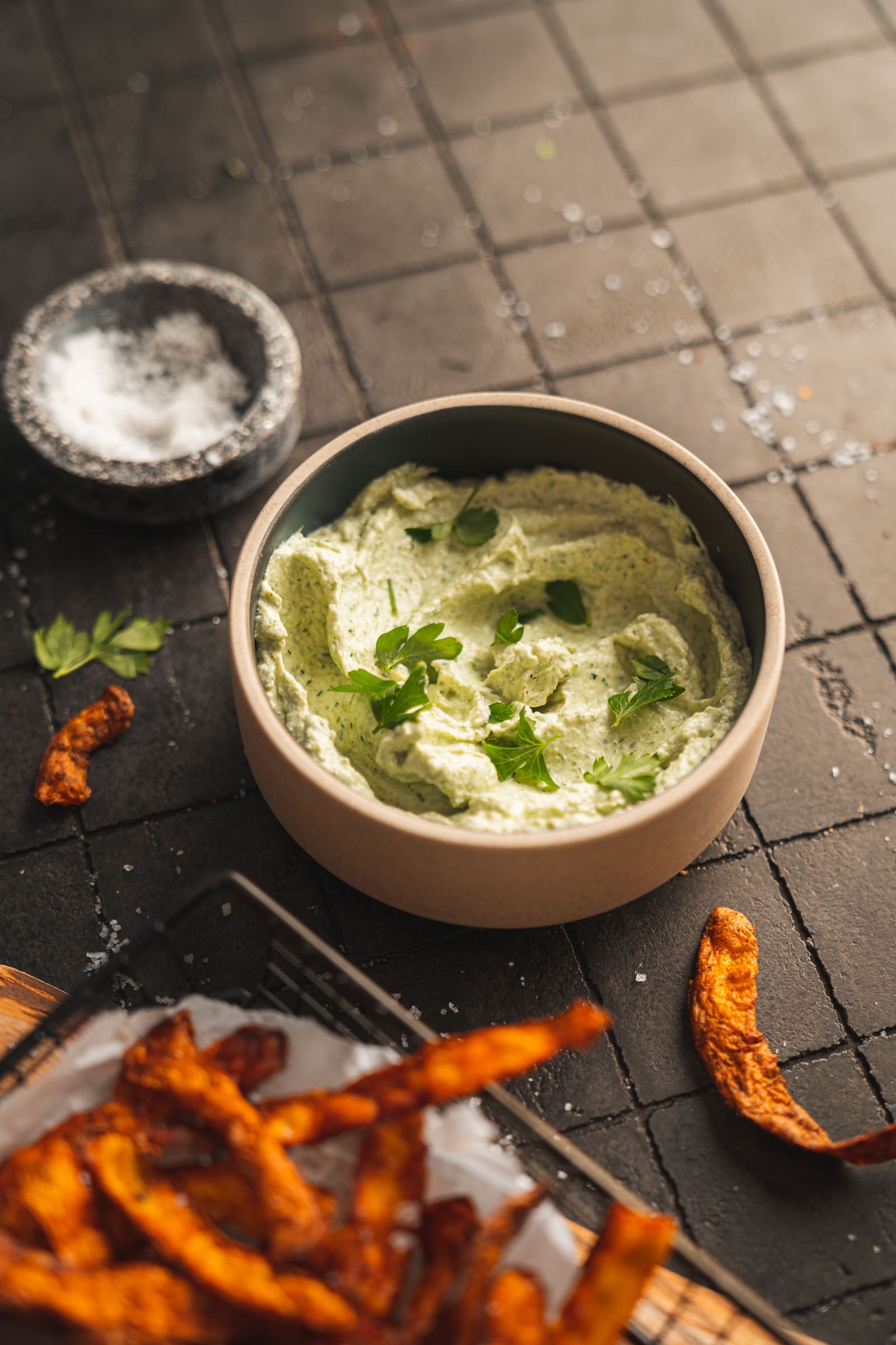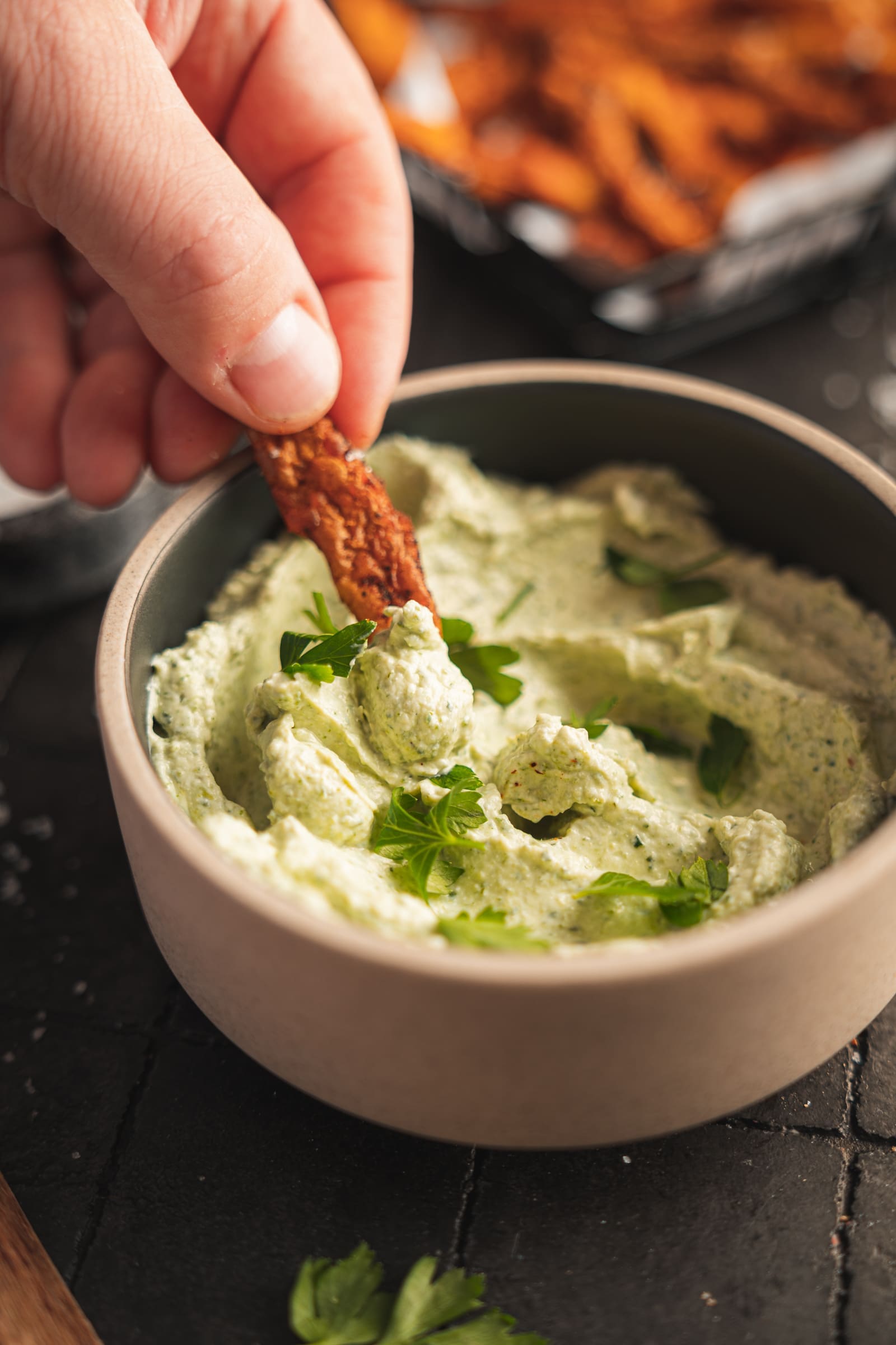 Chips & Dip aus Kartoffelschalen und Möhrengrün