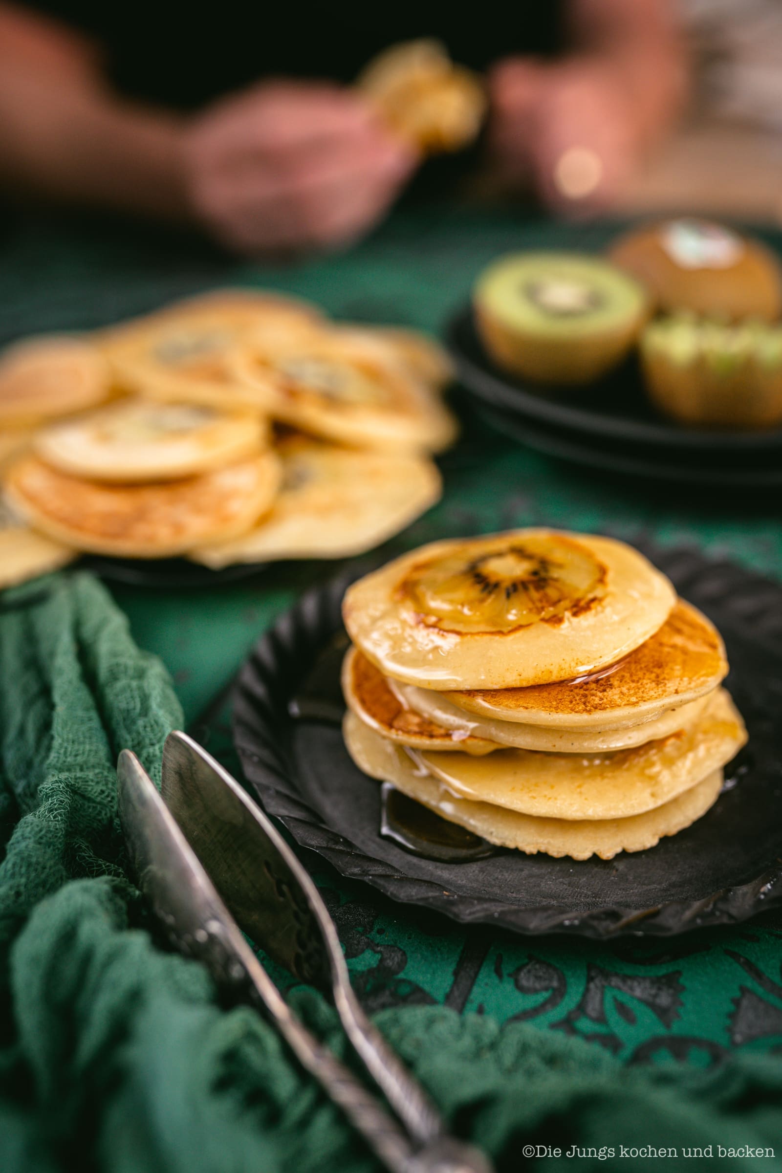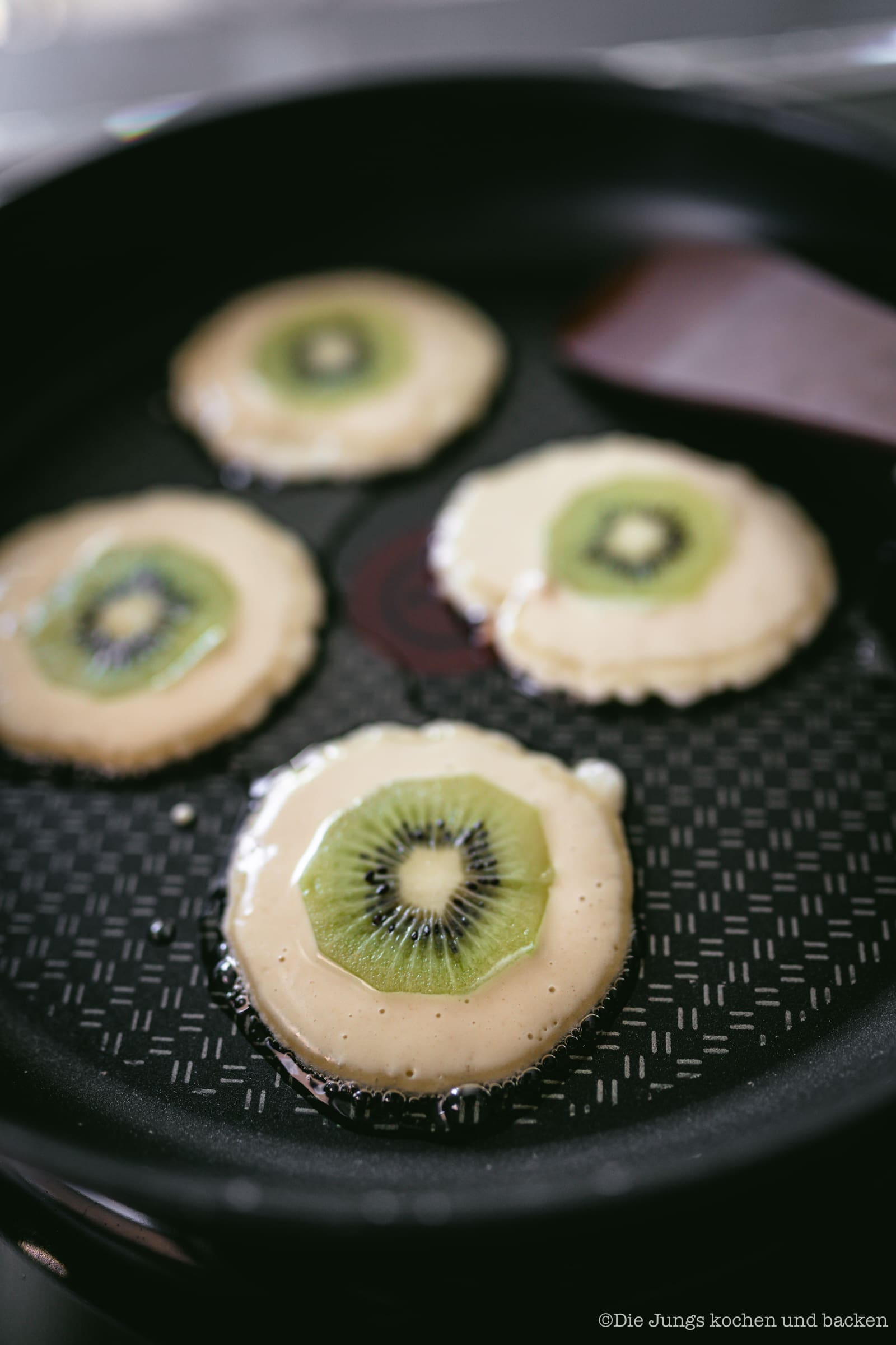 Also hab ich Torsten einfach machen lassen und selbst dann alles brav abgemessen und abgewogen. Schließlich sollt ihr auch in den Genuss von genial guten Pfannkuchen kommen. Dann einfach eine Green Kiwi schälen und in Scheiben auf den Teig in der Pfanne geben. Als Frühstück mögen wir die Pfannkuchen dann bewußt etwas kleiner, denn dann kann man sie auch wunderbar noch zwischendurch” snacken”.
