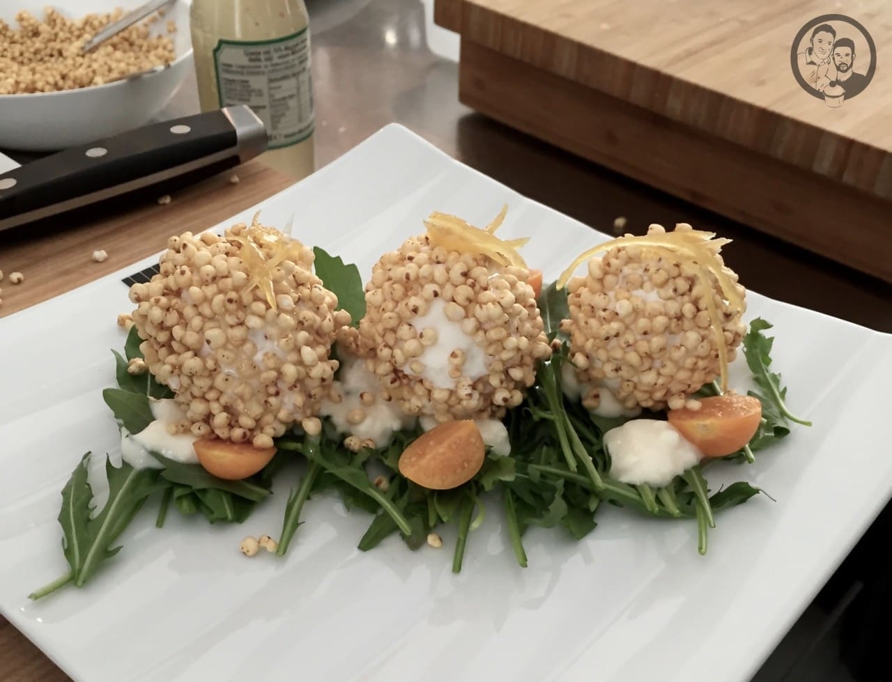 - Legt auf jeden der mit Rucola vorbereiteten Teller 3 Kugeln. Gebt die Pysalishälften und -viertel dazu und toppt das Frozen Yoghurt mit den Zitronenzesten.