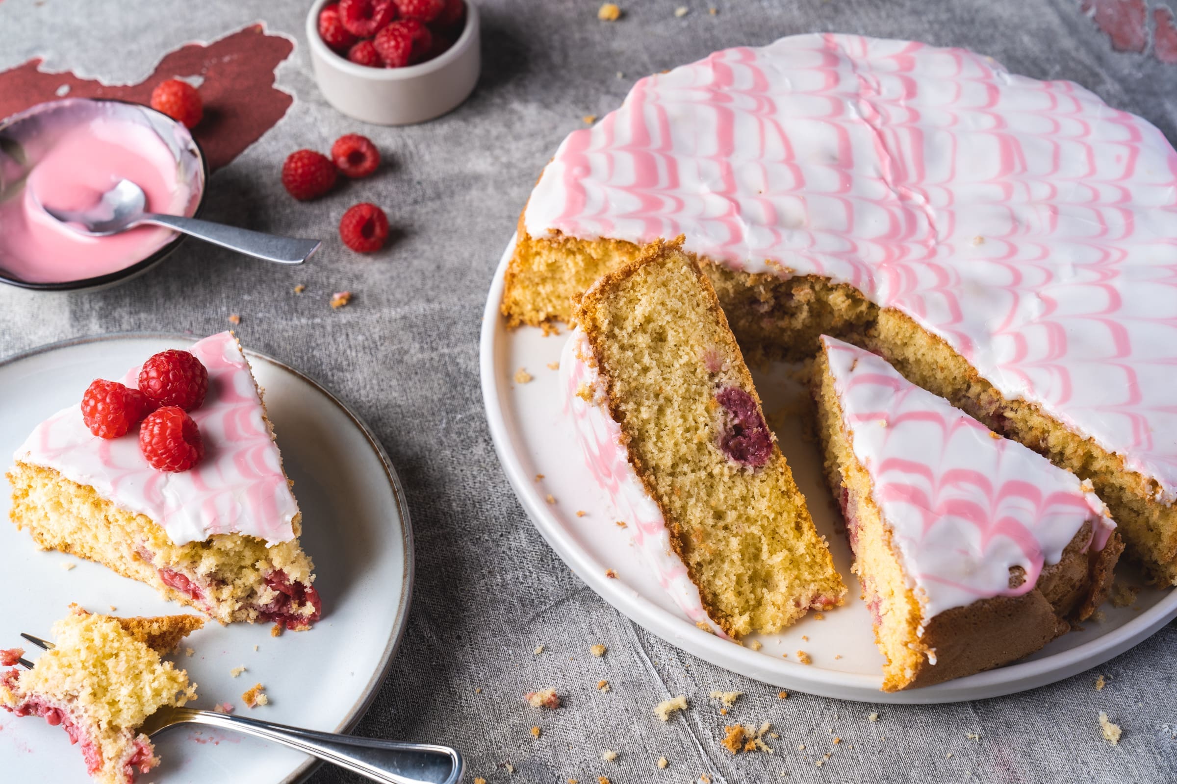 - Lasst den Guss trocknen und freut euch auf einen leckeren, luftigen und saftigen Kuchen mit Himbeeren.