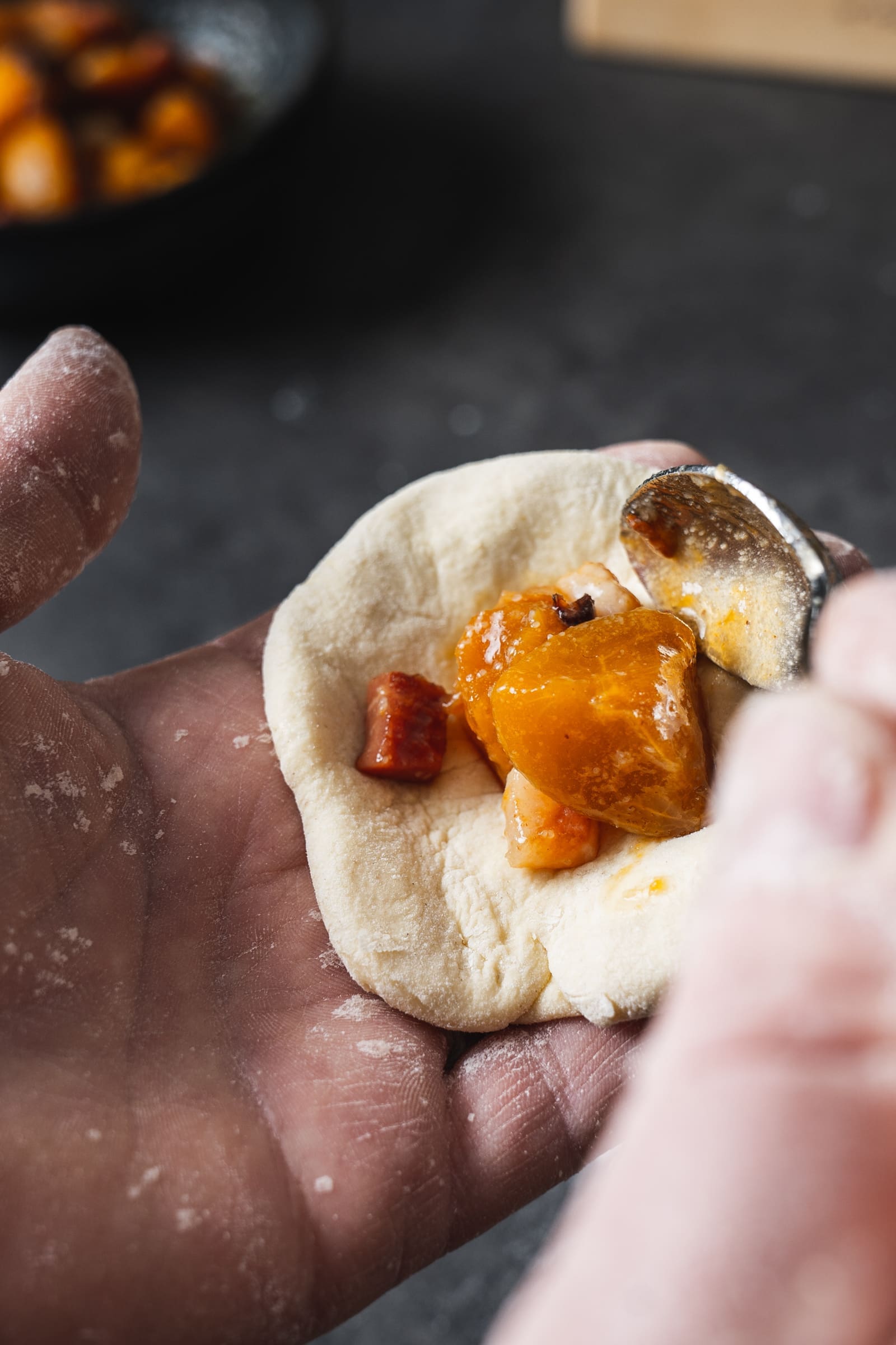 - Teilt den Teig nun in 12 gleichgroße Teile. Drückt den Teig in einer Handfläche mit den Fingern aus, so dass 1 TL der Füllung in die Mitte passt und ihr den Knödel rundherum mit dem überstehenden Teig verschließen könnt. Legt den Knödel zur Seite und bereitet die übrigen genauso zu.