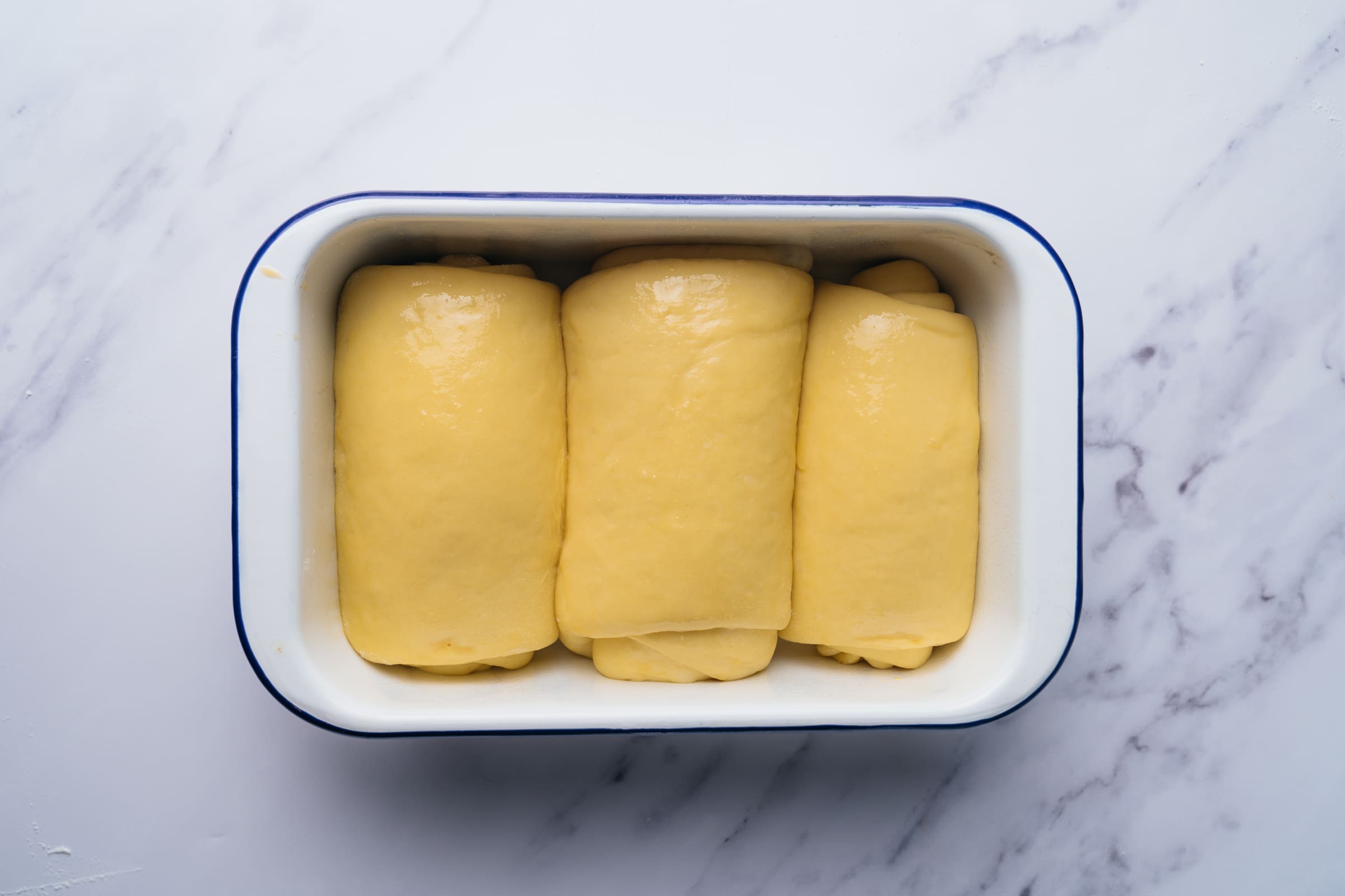 - Nun rollt den Teig auf und legt ihn mit der Naht nach unten, das macht ihr nun mit 2 weiteren Kugeln und danach befüllt ihr mit den 3 letzten Teigkugeln die zweite Backform.