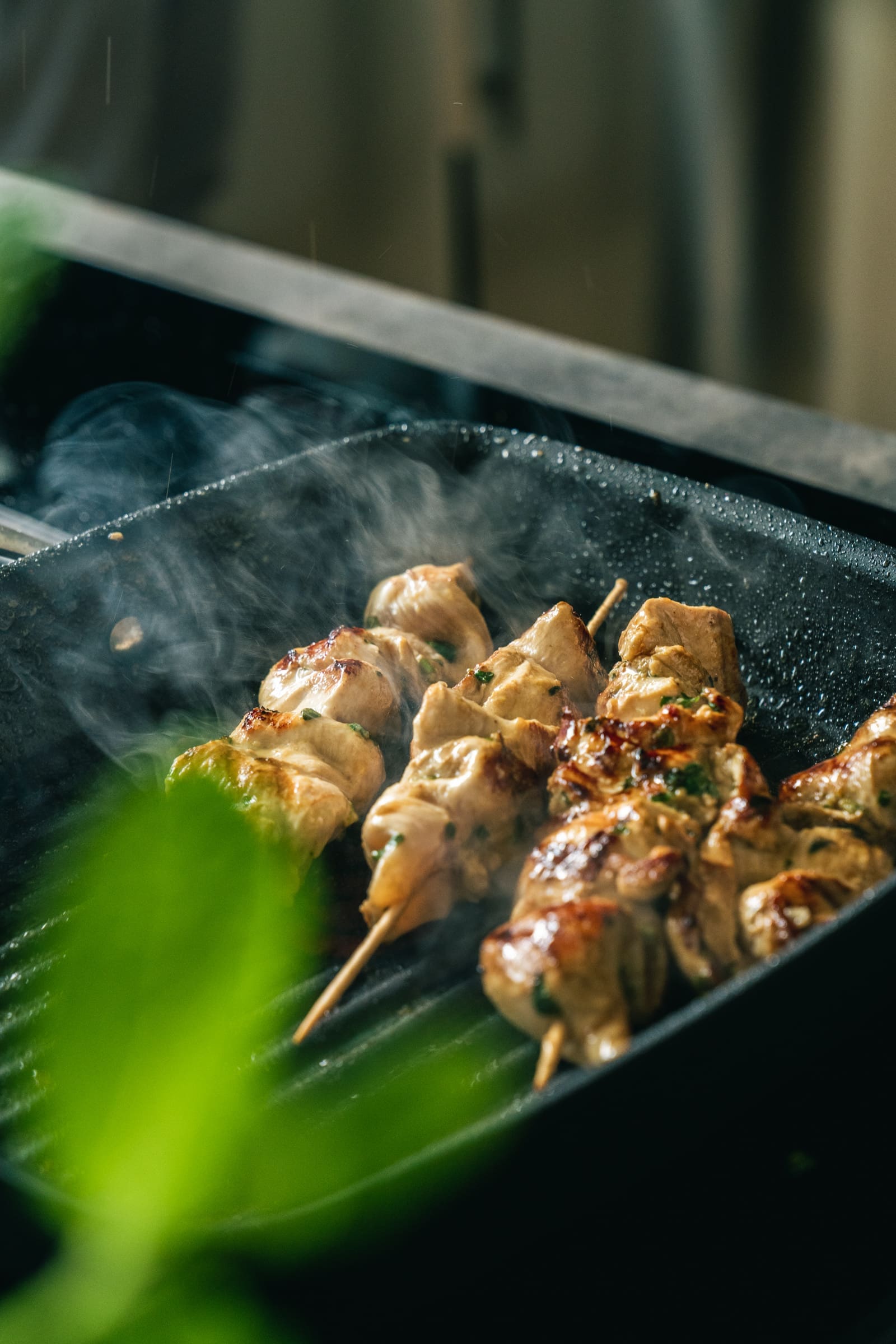 - Heizt eure Grillpanne oder euren Grill auf mittelhohe Hitze und grillt die Spieße für insgesamt ca. 10 Minuten von beiden Seiten gar. Alternativ könnt ihr sie auch im Backofen bei 140 °C gar ziehen.