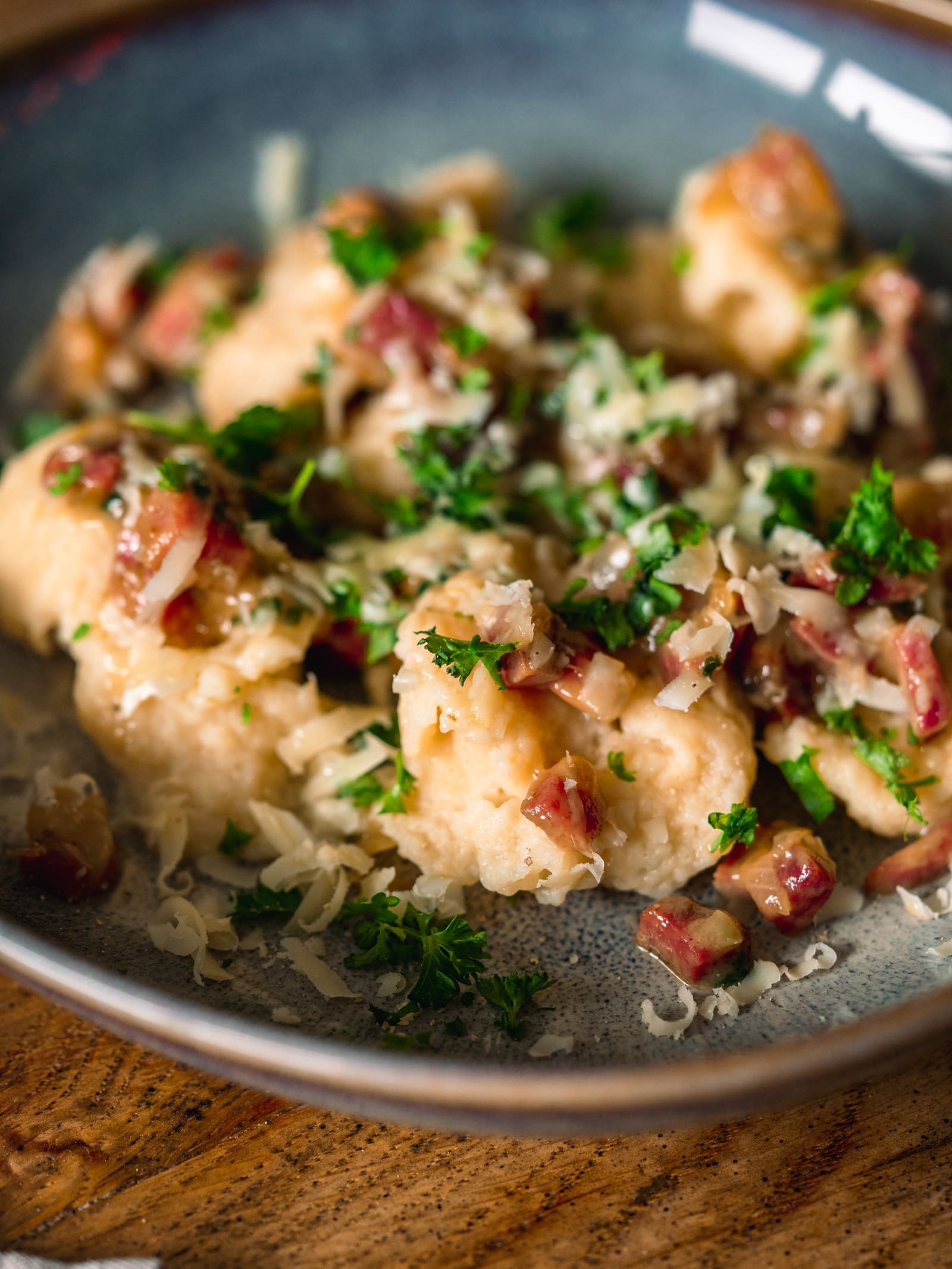 - Mehlknödel auf einen Teller geben, Sauce darüber, Parmesan darüber reiben und mit etwas Petersilie dekorieren. Guten Appetit!