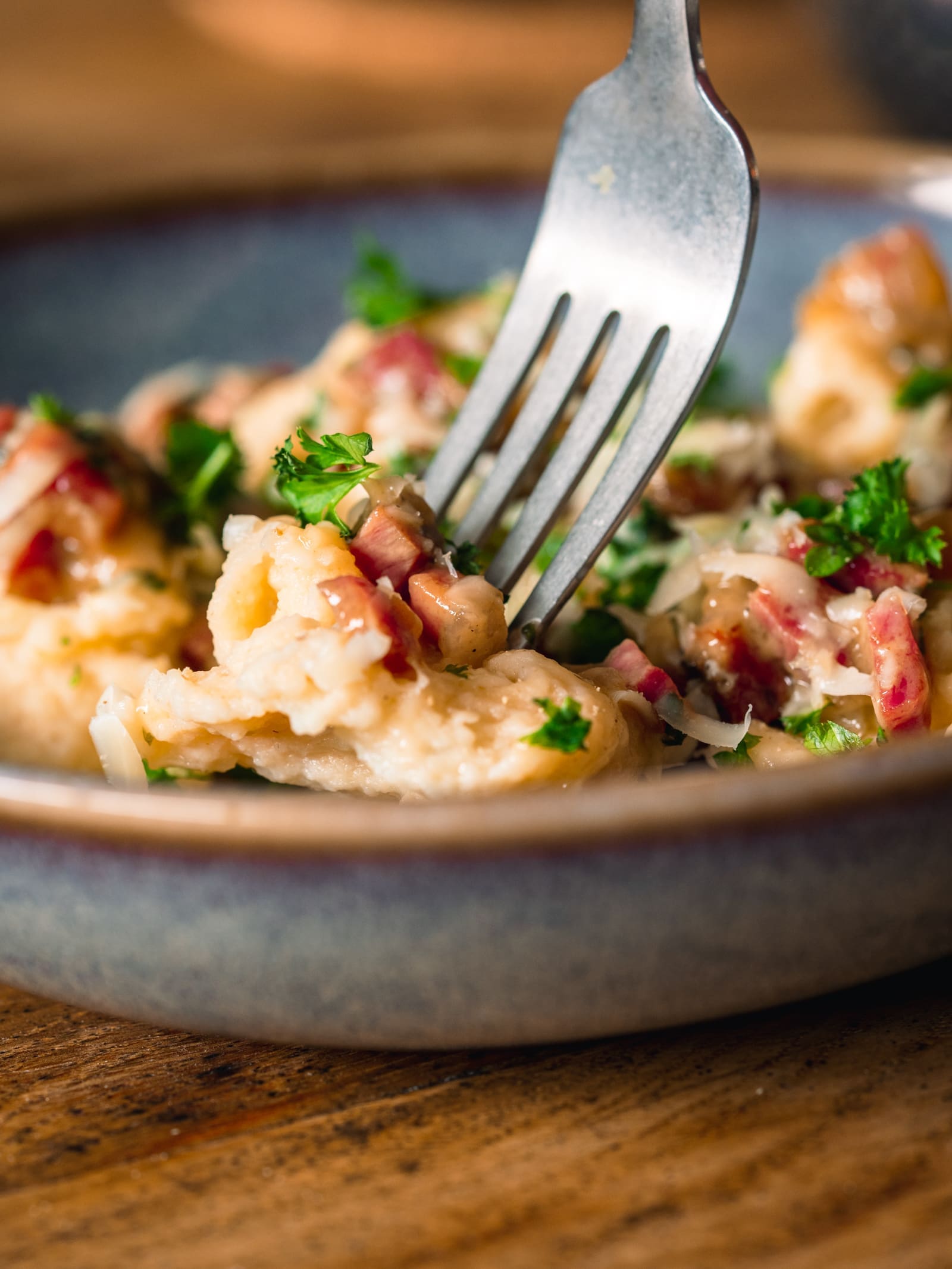 Jetzt hatten wir aber noch ein weiteres Problem und das ist auch der Grund, warum es dieses Rezept bisher noch nie auf dem Blog gab. So wie wir es klassisch früher in der Familie gegessen haben, kann ich das hier nicht zeigen. Wenn ihr genau wissen möchtet, wovon ich rede dann hört euch einfach die 4. Folge {37:00} an. Aber für uns war sofort klar, wir müssen eine Form von Deluxe Version der Mehlknödel erstellen. Ich sag mal so – Zwiebel, Speck, Butter und ein bisschen Käse haben das Gericht wirklich aufs nächste Level gebracht.