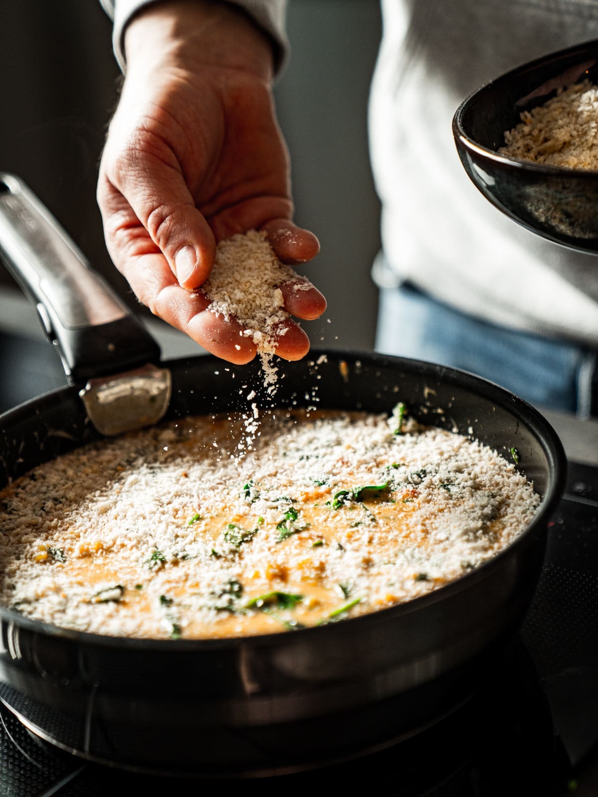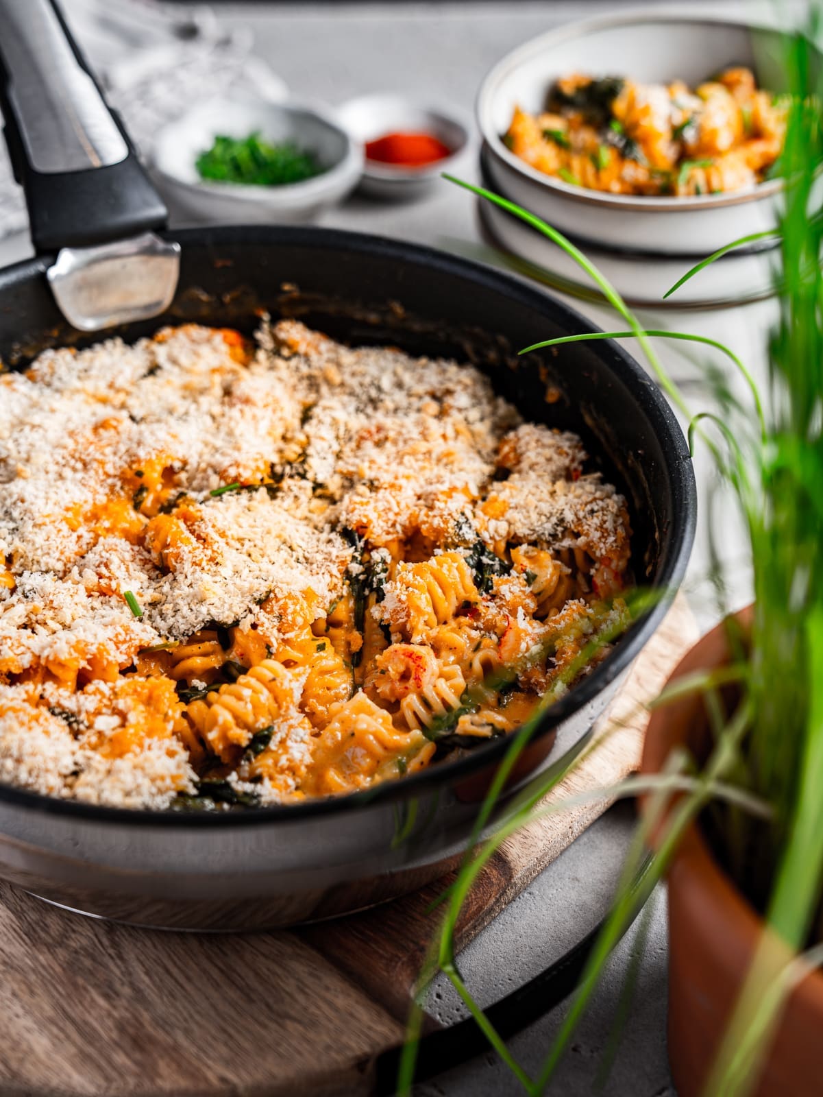 - Nun kommt das Schnittlauf und der Spinat dazu, bevor ihr die Krustentiere, die Nudeln und den Cheddar unterrührt. Mit Panko bestreuen und für 15 Minuten im Ofen garen lassen.1½ TL Schnittlauch, 100 g Blattspinat, 160 g Flusskrebse, 75 g Nordseekrabben, 300 g Nudeln, 100 g Cheddar, 1 EL Panko