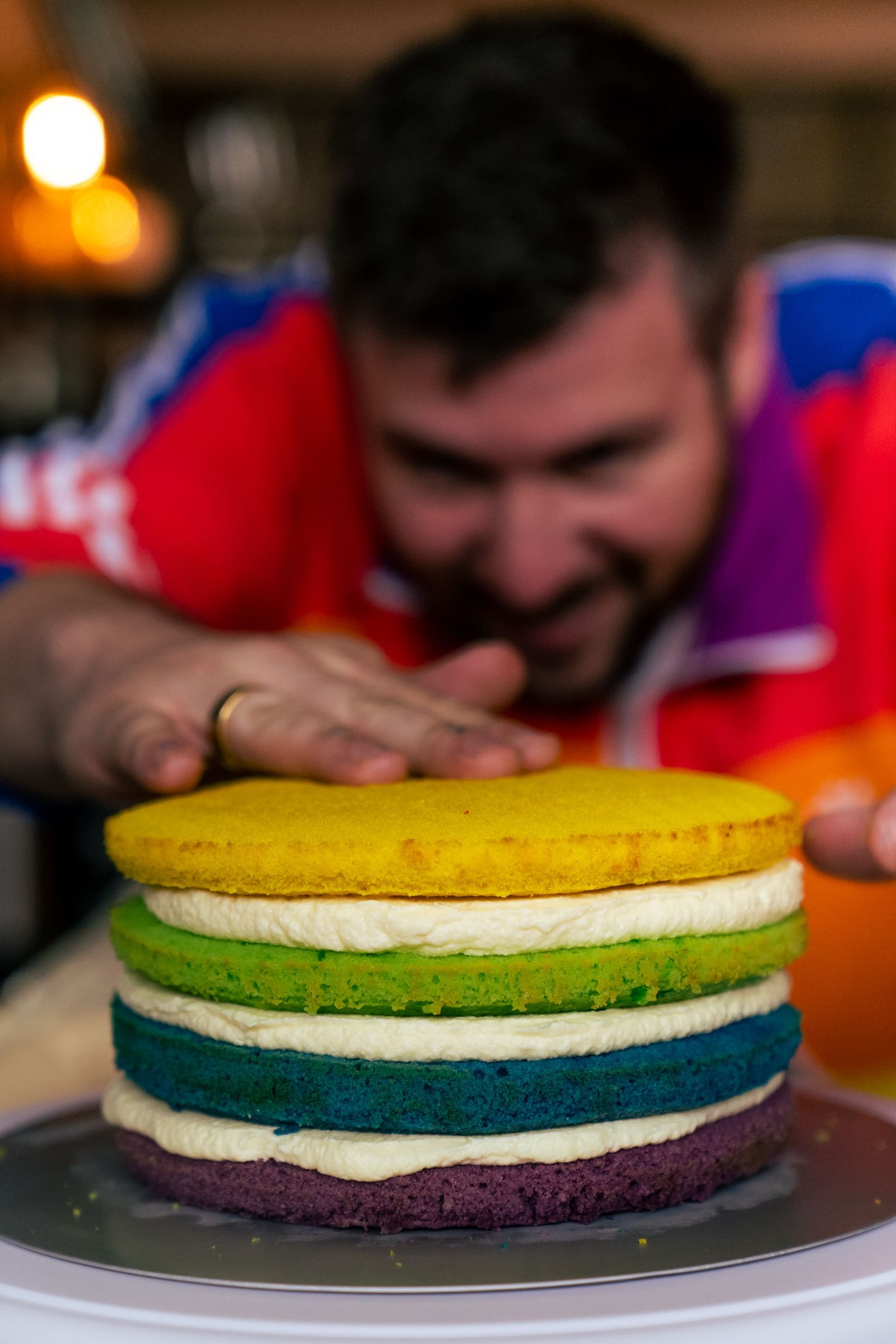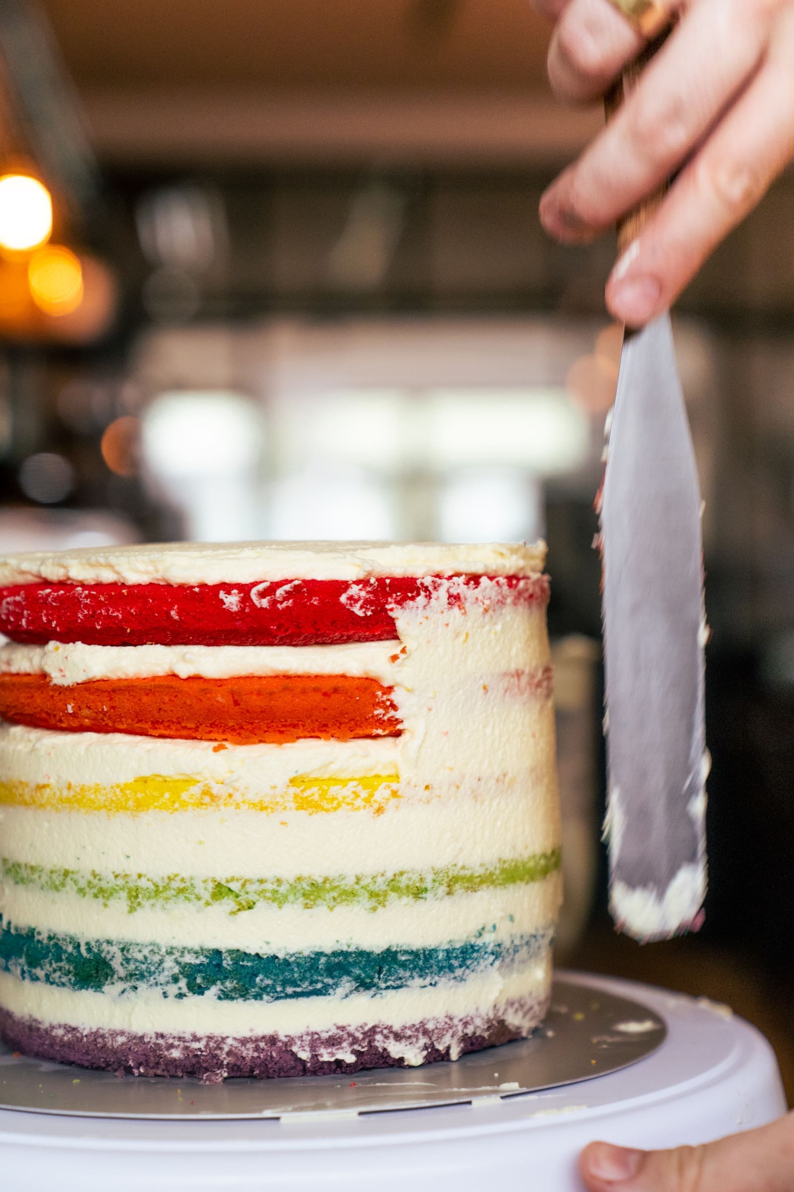 - Nehmt den 1. Boden, gebt etwas Creme darauf, streicht sie glatt und setzt den nächsten darauf. Macht das mit den restlichen Böden und streicht die Torte außen mit der überschüssigen Creme ein wenig ein, so dass noch die Farben durch scheinen.