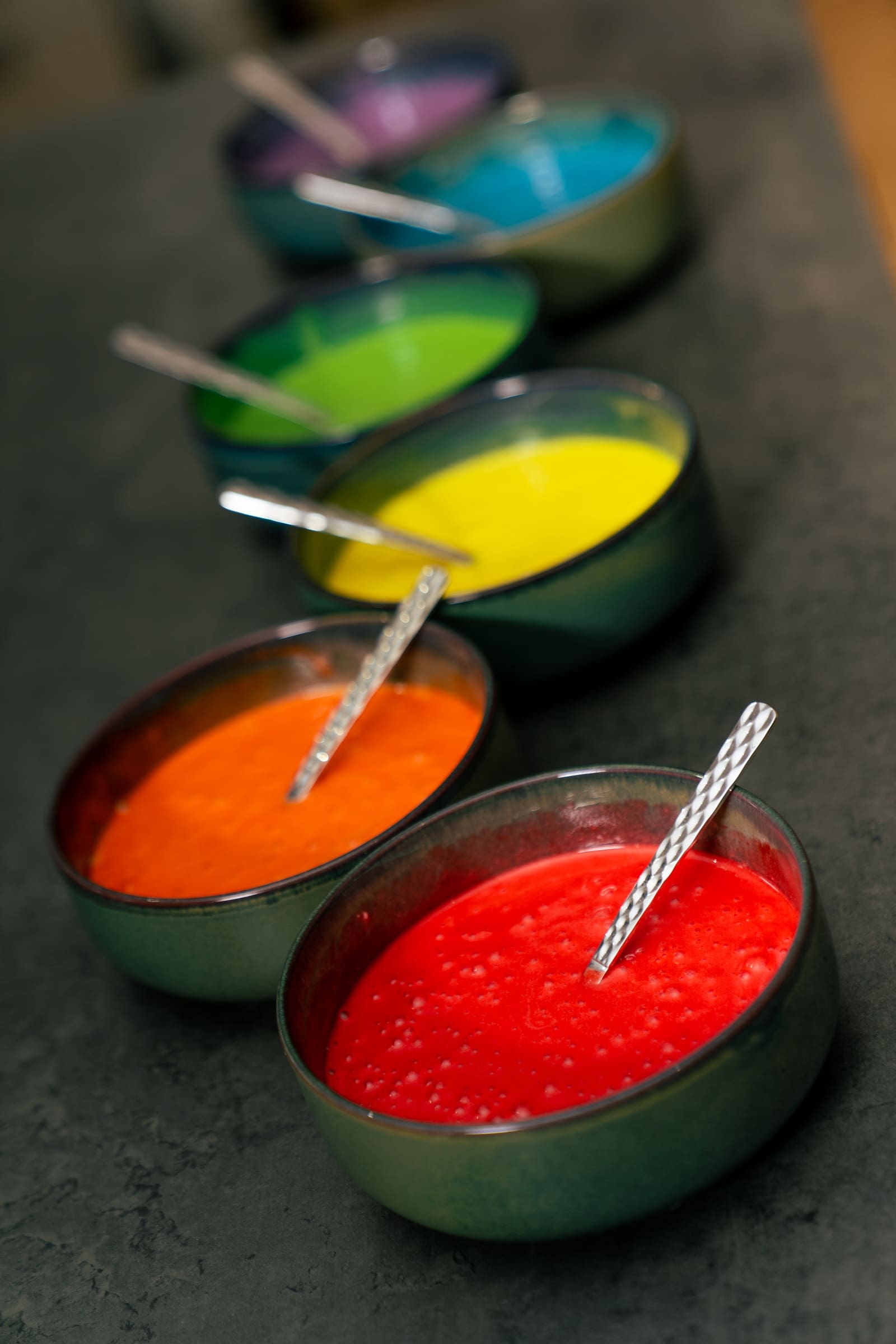 - Teilt den Teig in 6 gleiche Teile und färbt jeden in der jeweiligen Farbe (achtet auf die Anleitung auf der Verpackung).