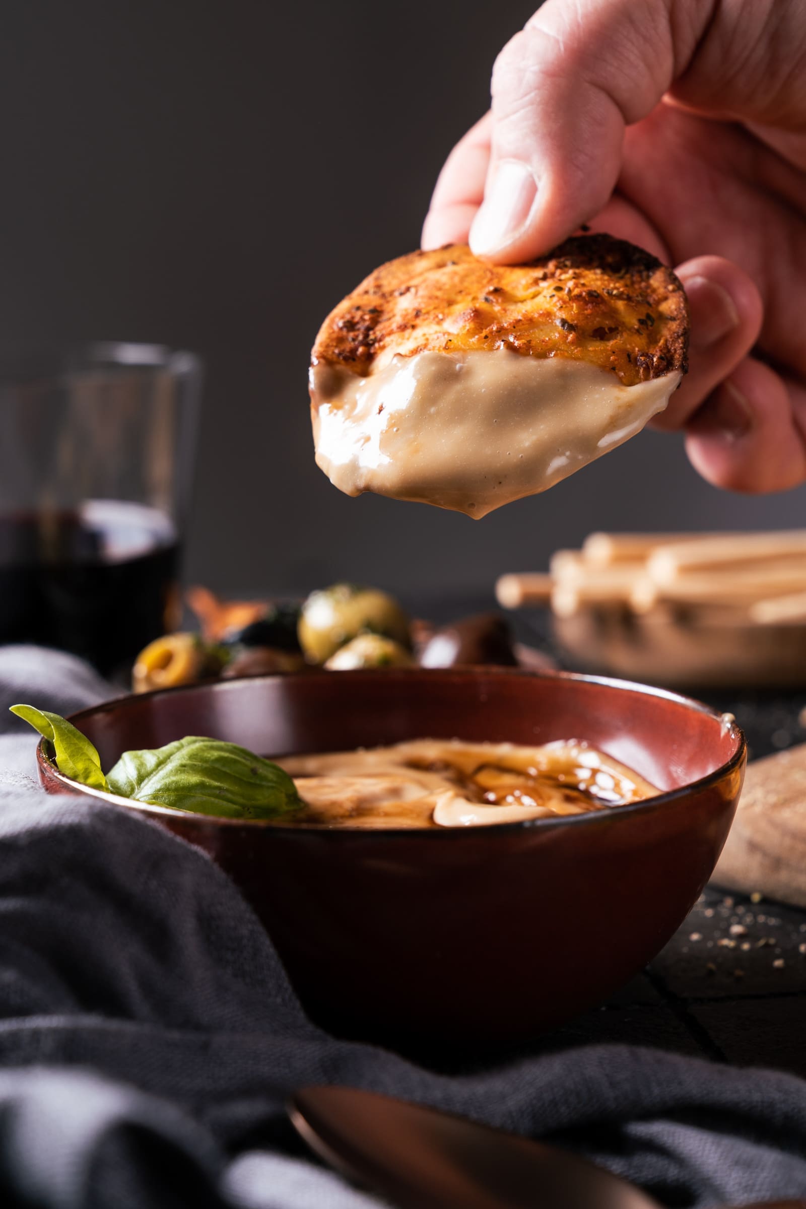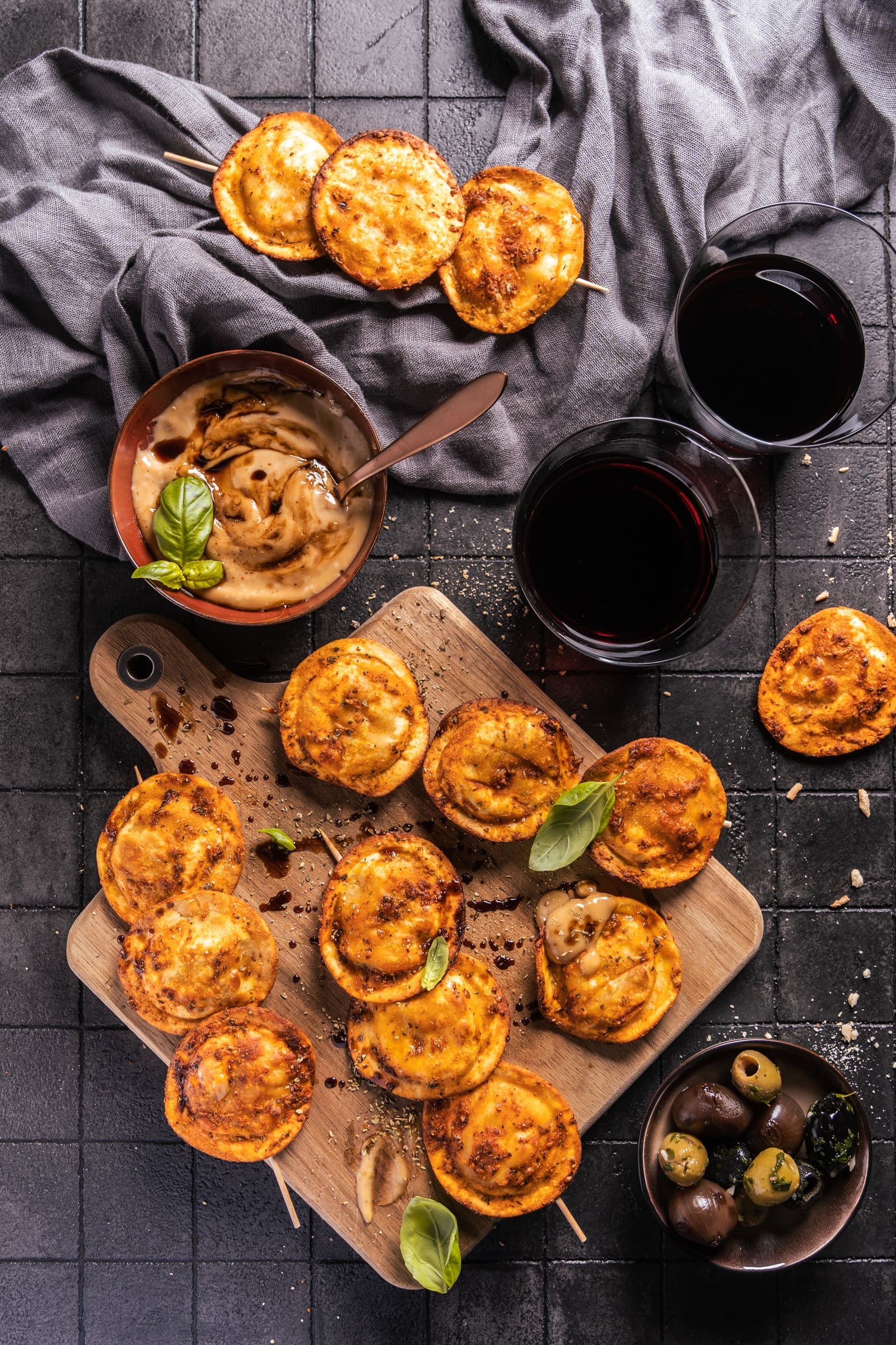 Ihr kennt doch bestimmt schon längst, den aktuellen Trend, aus gekochten und dann gewürzten Penne oder Rigatoni, eine Art Chips in der Heißluftfritteuse oder im Heißluftofen zu machen. Und diese Idee haben wir als Grundlage für unsere gewählt. Aber wir haben uns gedacht, dass auch eine Ravioli sehr gut als Chips funktionieren könnte. Also haben wir uns an die Rezeptplanung begeben. Grundsätzlich relativ einfach, denn wie würde man Chips schon würzen?! Auf jeden Fall mit viel Paprika, Salz und damit sie auch einen Hauch von Italien bekommen, ein wenig Oregano – fertig sind die Ravioli-Chip … es geht so flott. Aber da fehlt ja noch unser Hauptdarsteller. Der Testa Rossa. Den haben wir dazu verwendet, um meinen Lieblingsdipp zu machen eine Aioli. Aber einfach einmal anders. Nicht mit der Säure von Zitrone gewürzt, sondern mit dem süß-säuerlichen Aroma dieses komplexen Balsamicos verfeinert.