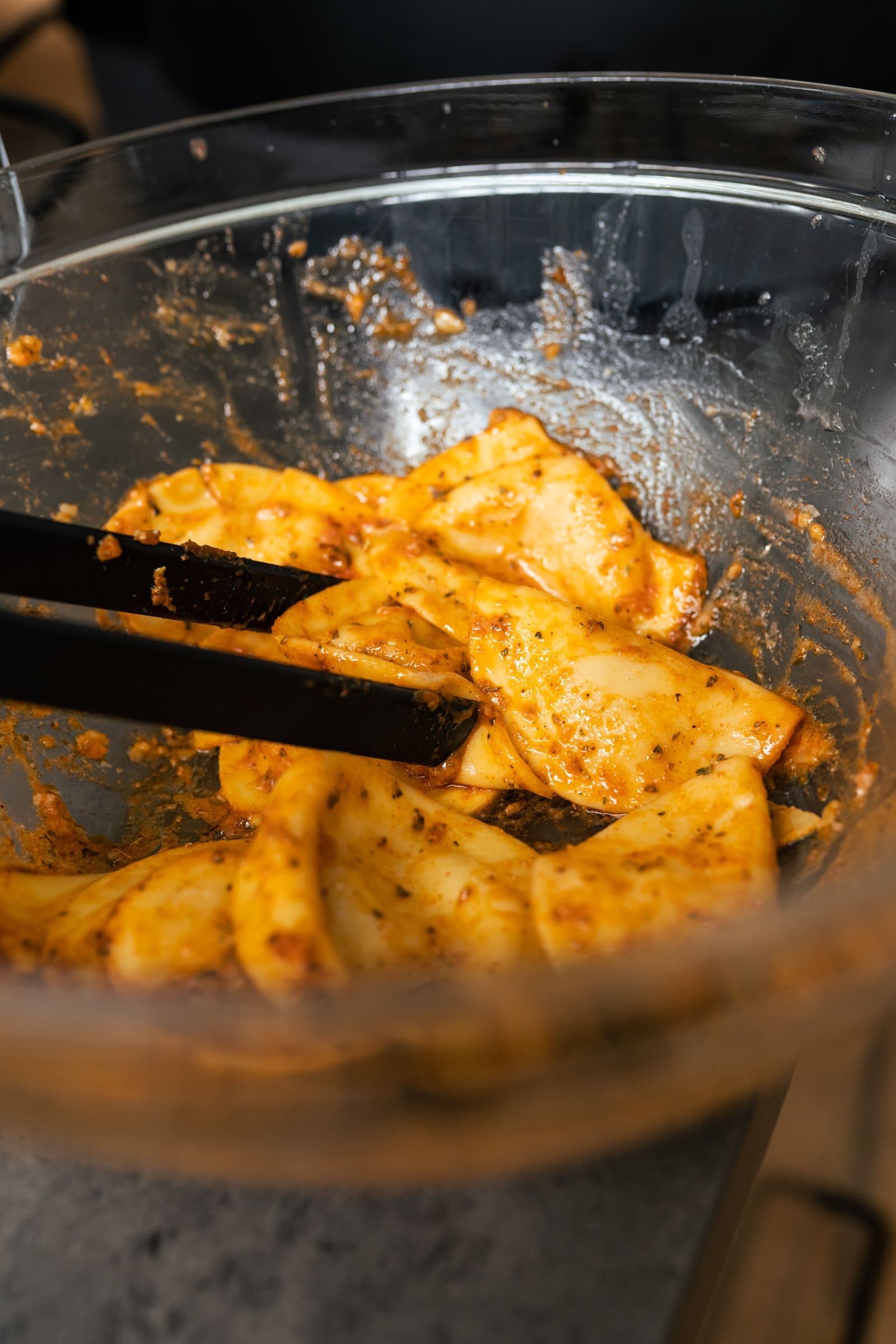 - Vermischt in der Zwischenzeit in einer Schüssel die übrigen Zutaten und benetzt die garen Ravioli in der Schüssel mit der Würzmischung gleichmäßig.
