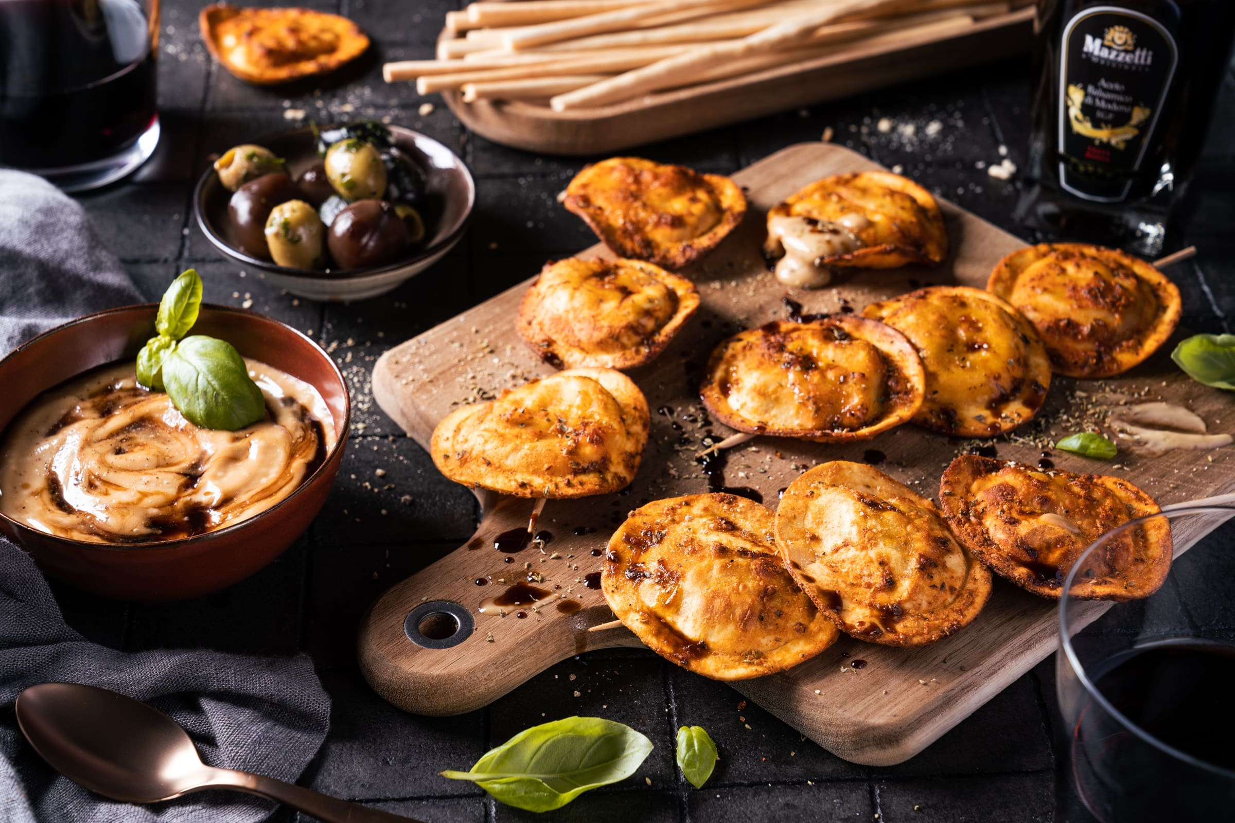 Heute ist für uns ein ganz besonderer Tag. Diejenigen von euch, die schon seit einigen Jahren verfolgen, was wir so an Rezepten entwickeln und mit welchen Partnern wir zusammenarbeiten oder gearbeitet haben, erinnern sich bestimmt an diesen italienischen Partner. Mazzetti l’Originale. Das sind die mit den tollen Variationen an Balsamico Essigen – genau! Wir haben uns so sehr gefreut, dass wir in diesem Jahr die Möglichkeit bekommen haben, erneut mit diesem Herzenspartner zusammen zu arbeiten. Und daher starten wir auch gleich mit dem 1. Stuzzicchini-Rezept. Unseren Ravioli-Chips mit Balsamico-Aioli – der Pasta-Chips Trend mal in anderer Form!