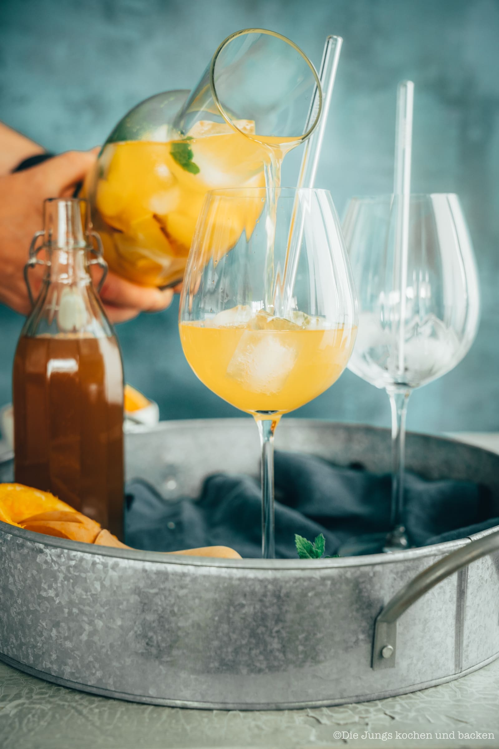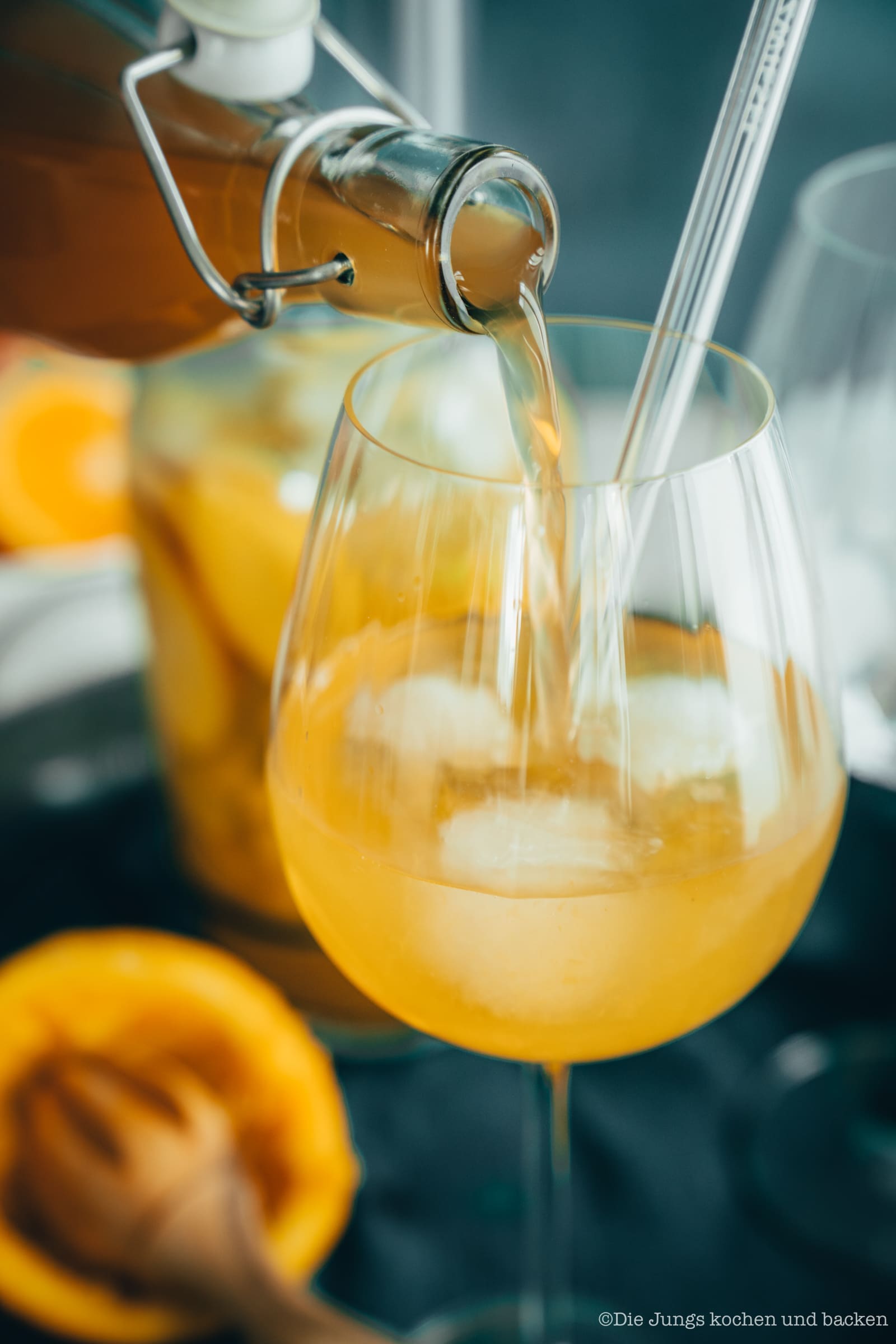 - 1 l kalter Früchtetee gerne Orange, Pfirsich oder Maracuja etc.
