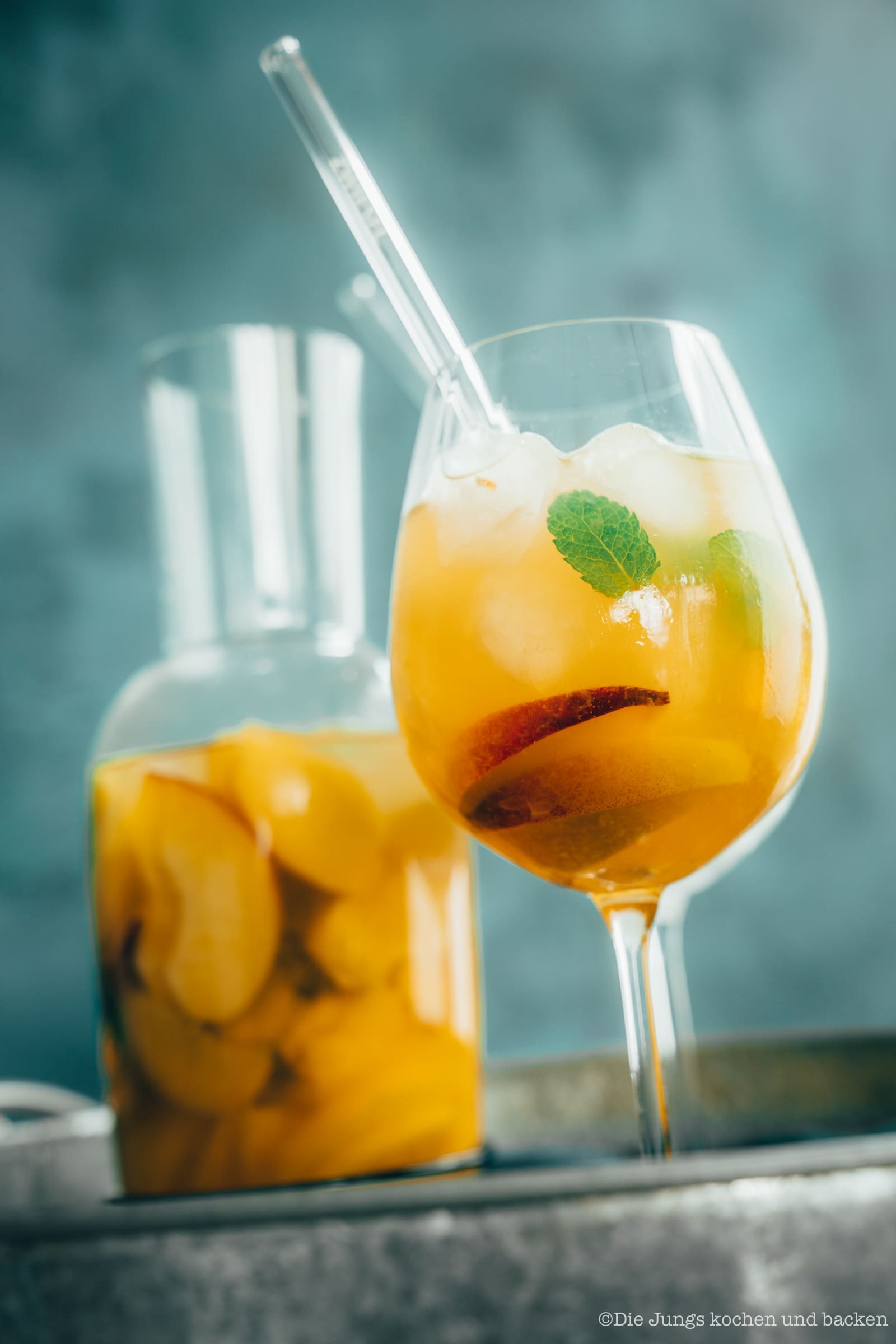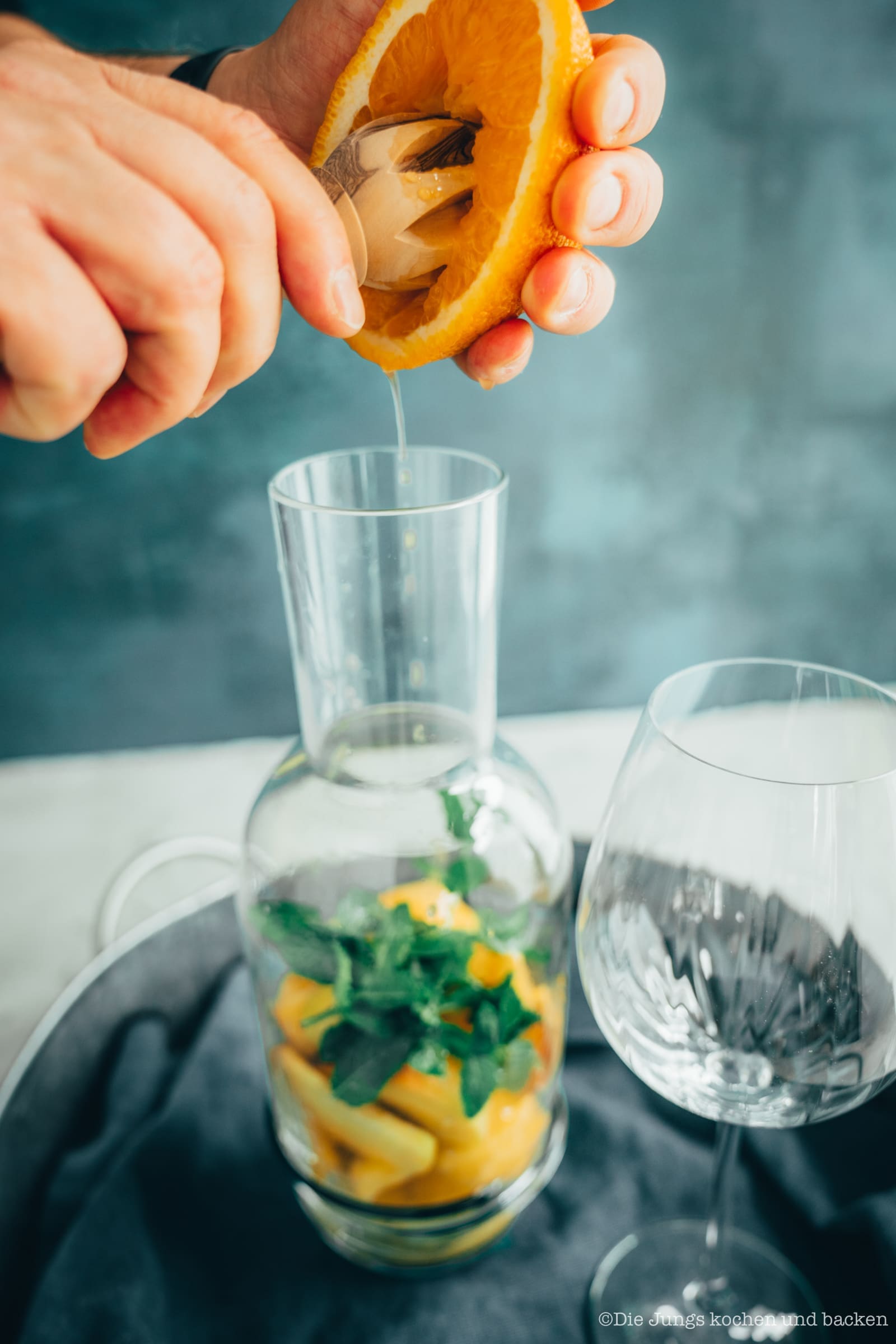 - Schält die Pfirsiche, schneidet sie in Spalten und gebt sie in die Karaffe. Träufelt nun ein wenig Zitronensaft darüber und schüttel alles ein wenig durch, denn so werden die Pfirsiche nicht dunkel. Presst die Orange aus und wascht die Minze. Dann seid ihr mit den Vorbereitungen schon fertig.