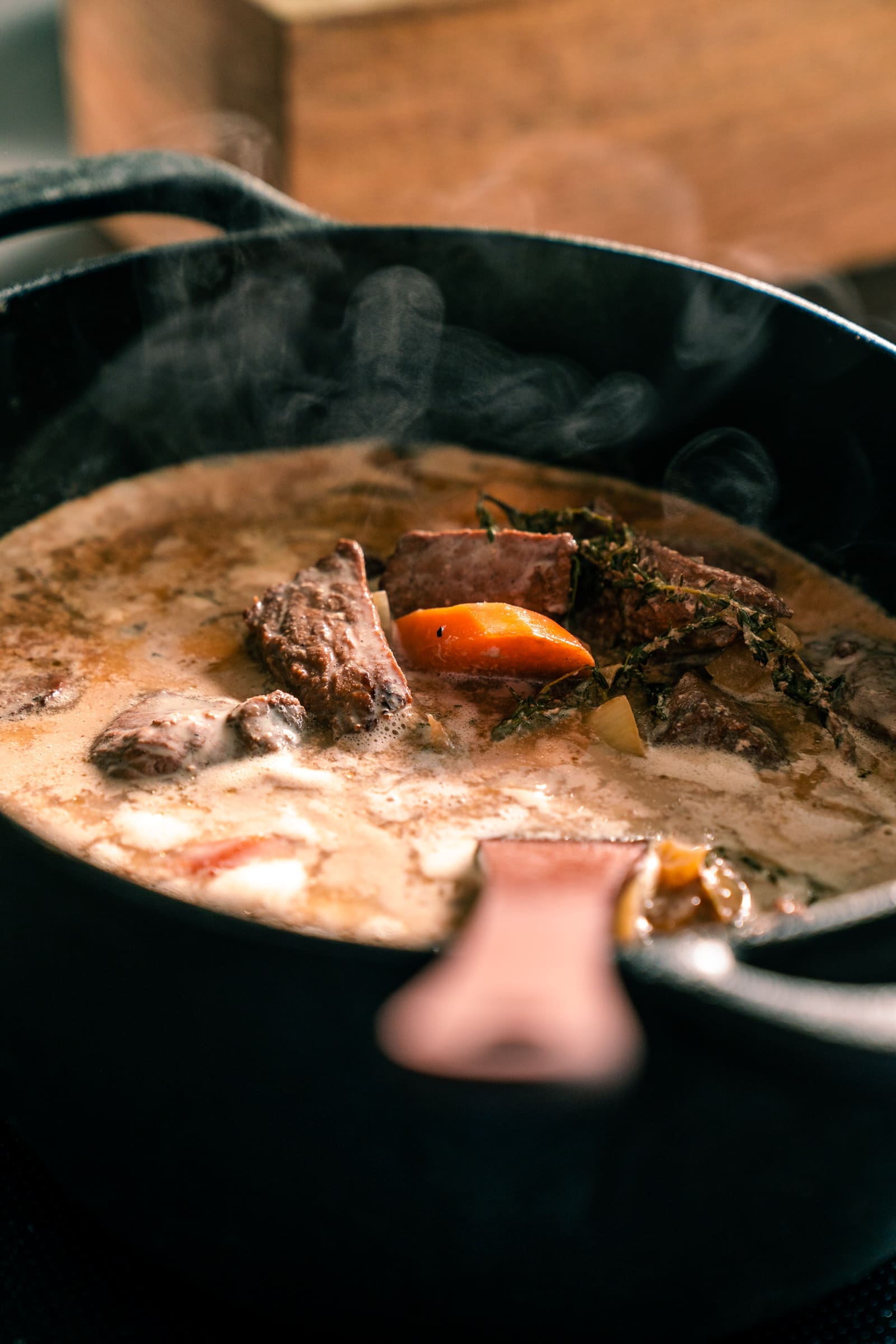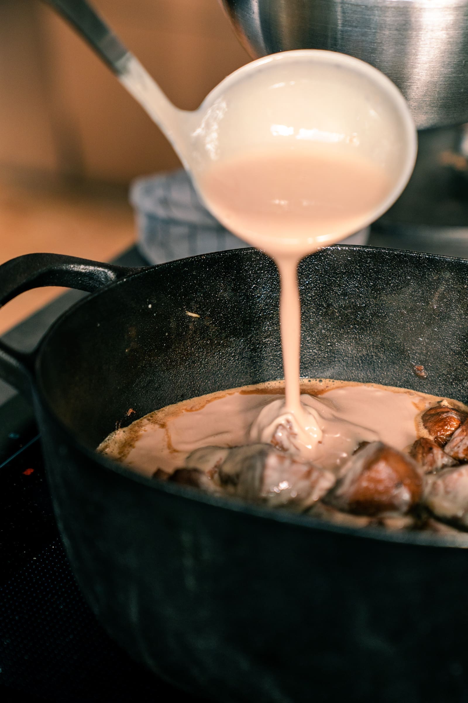 - Bratet danach die Zwiebelwürfel ebenfalls unter Rühren scharf an und gebt die Fleischwürfel und die Marinade dazu. Kocht alles einmal auf, reduziert die Temperatur, so dass das Gulasch leicht köchelt und lasst es bei geschlossenem Deckel für ca. 2 Stunden garen.
