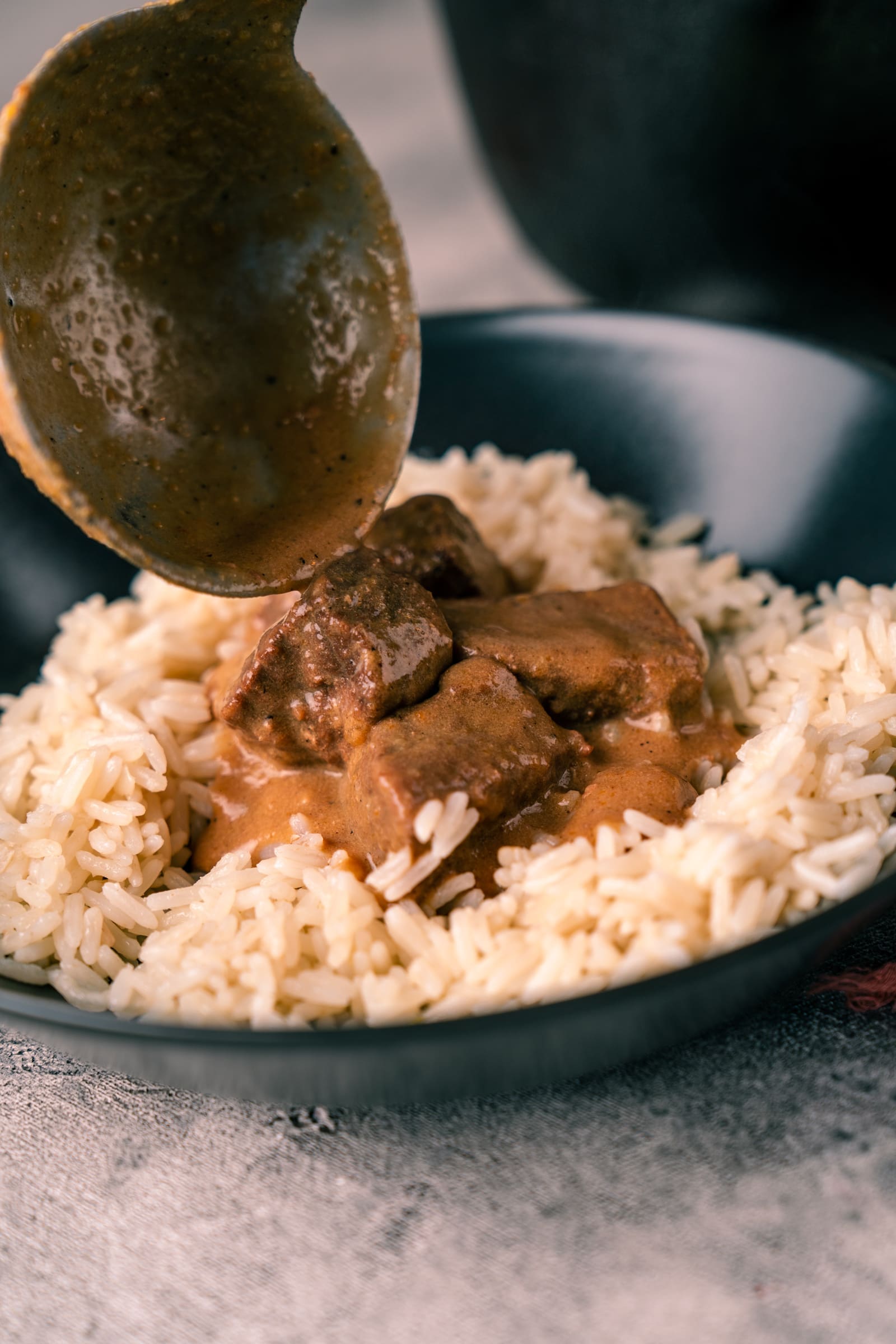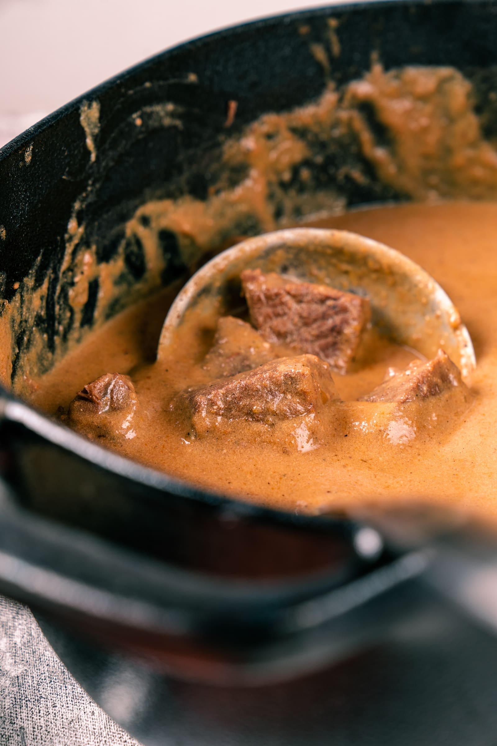 - Nehmt die Fleischwürfel aus der Marinade und tupft sie mit Küchenkrepp gründlich ab. Erhitzt Butterschmalz in einem Topf und bratet die Fleischwürfel in kleineren Mengen von allen Seiten scharf an und gebt sie auf einen Teller.