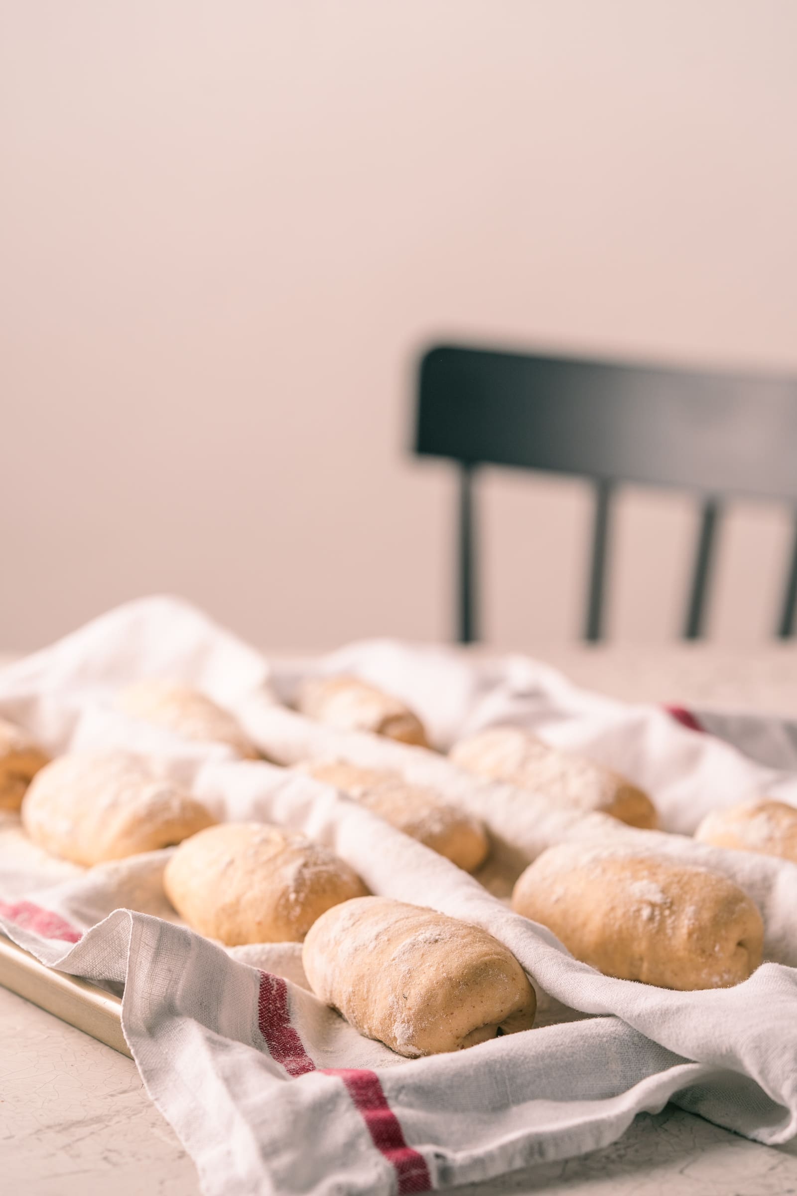 - Zieht und faltet jedes Teigstück von außen in die Mitte und form nach und nach ein Rechteck daraus. Legt es mit der Verschlussseite nach unten auf das bemehlte Tuch. Wenn alle 10 Stück fertig sind, streut ein wenig Mehl über die Rohlinge, legt ein weiteres Tuch darüber und lasst sie für 2 Stunden ruhen und gehen.