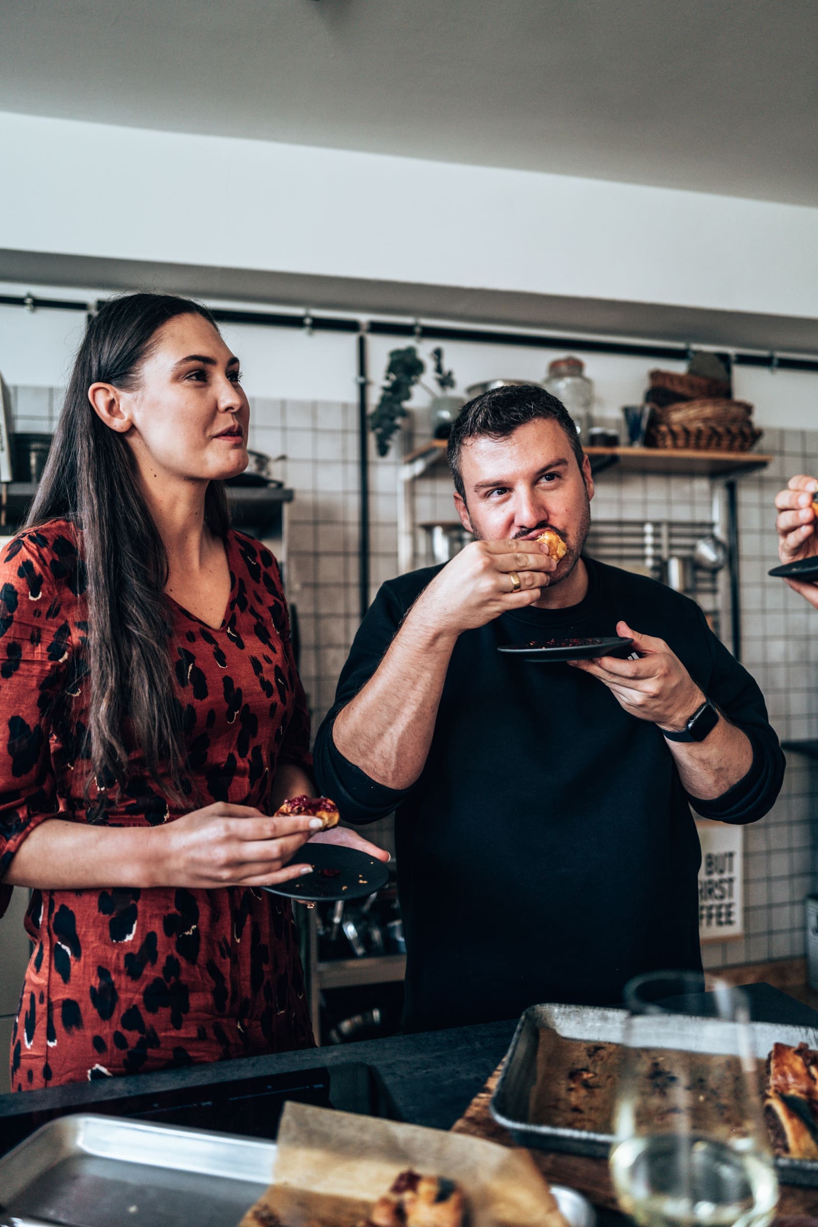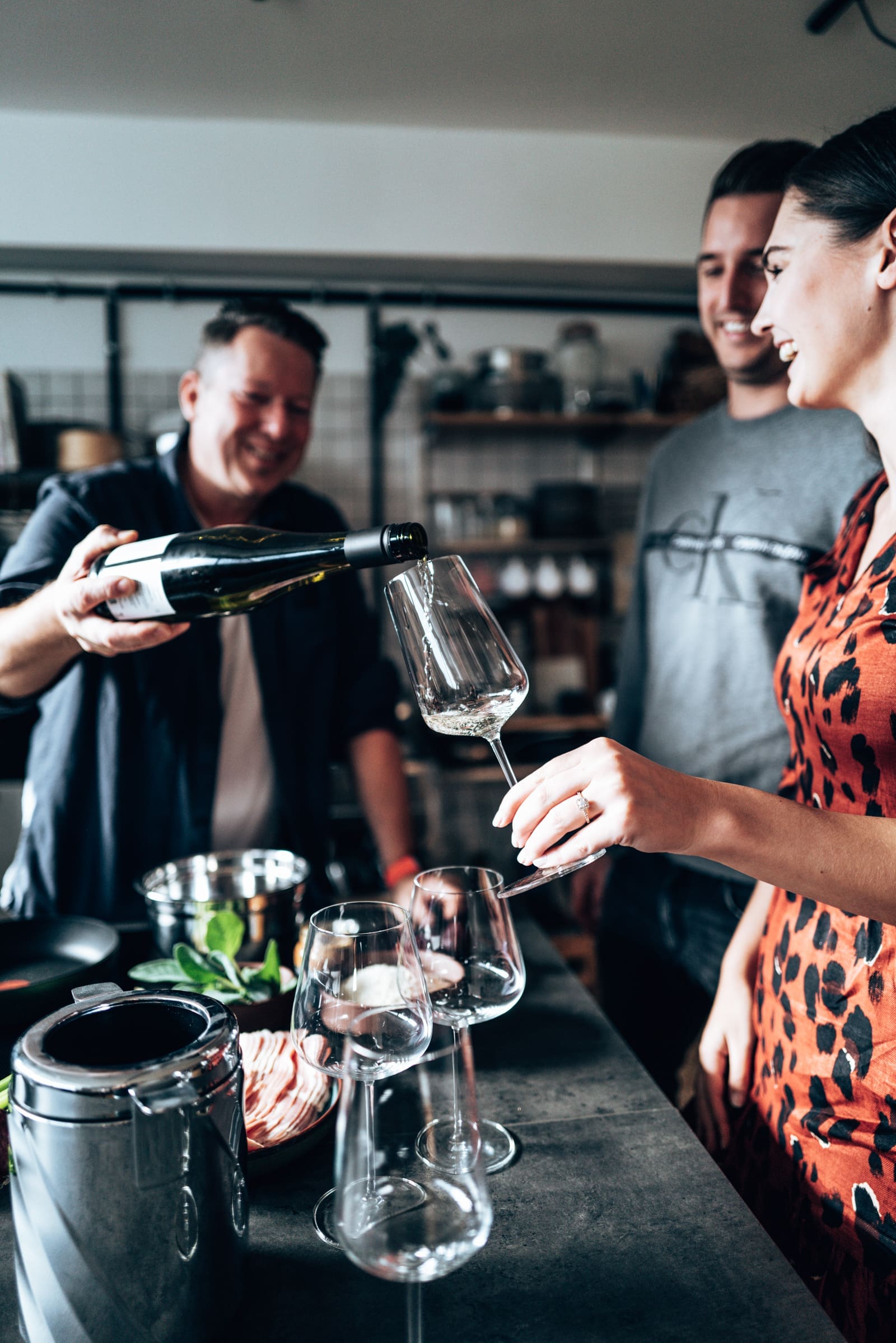 Wie ihr sehen könnt, haben wir uns aber nicht ganz alleine über die kleinen Sausage Rolls hergemacht. Wir hatten liebe Freunde zu Besuch und so war uns klar, dass das bestimmt in einer Küchenparty endet. Beim zusammen Kochen haben wir uns schon mal einen leckeren Gelben Muskateller aufgemacht und angestoßen. Lara und Sebastian haben sich nämlich verlobt und das wollte gefeiert werden!