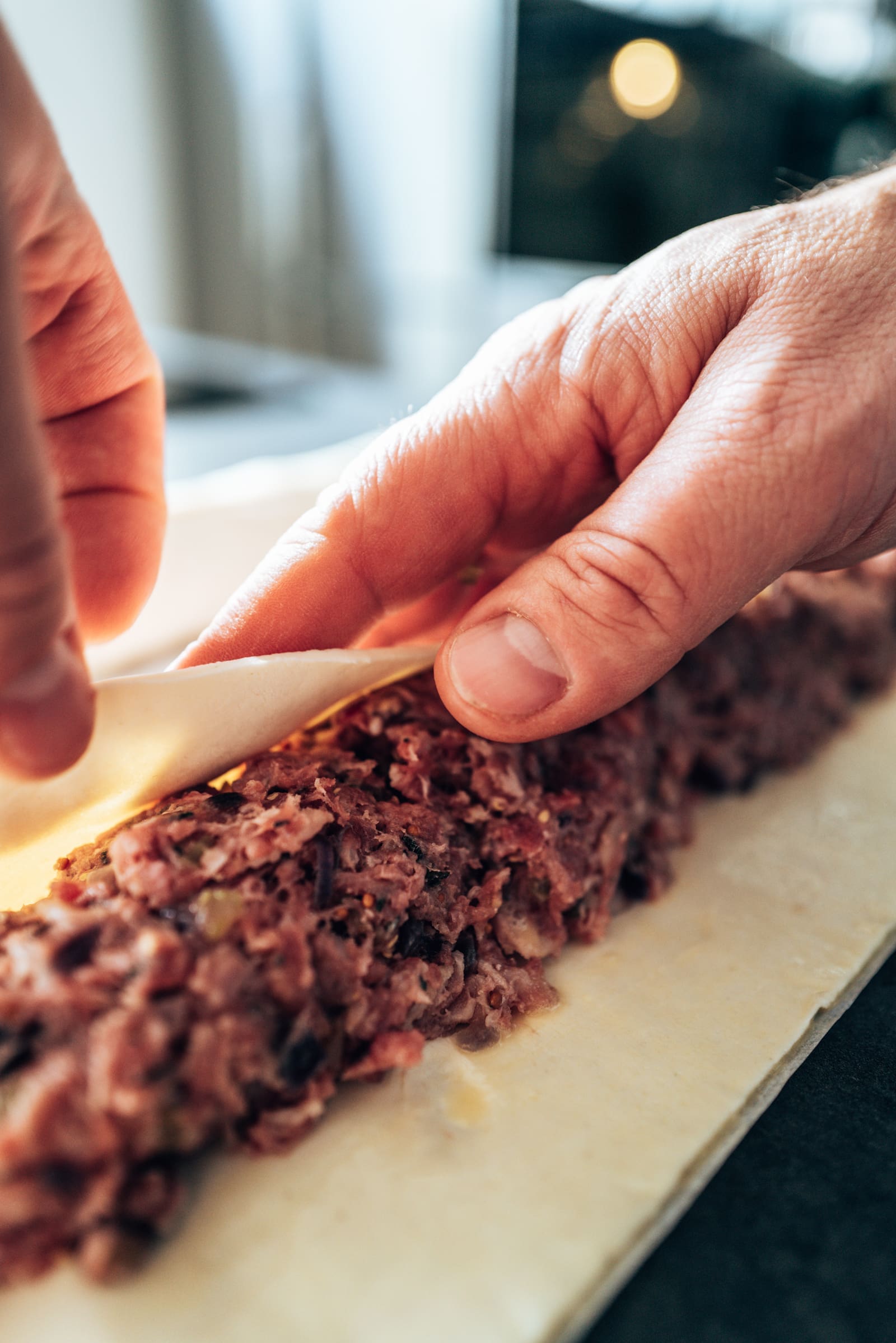 - Breitet den Blätterteig auf eurer Arbeitsfläche auf und halbiert ihn mit einerm scharfen Messer an der langen Seite. Verteilt jeweils die Hälfte der Fleischmixtur als "Rolle" längs in der Mitte der beiden Teigstücke.
