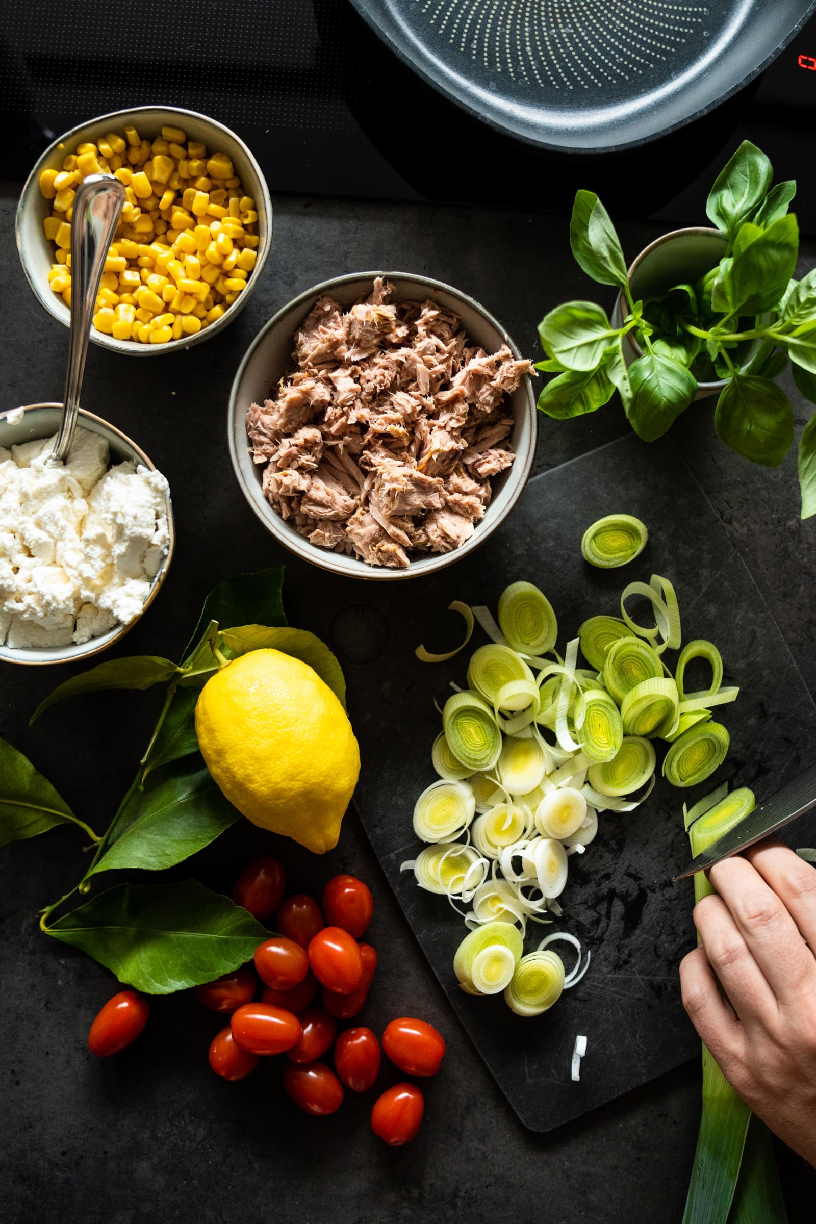 - Ricotta und Thunfisch in die Pfanne geben und alles verrühren. Würzt mit Salz und einer ordentlichen Portion schwarzem Pfeffer.100 g Ricotta, 200 g Thunfisch