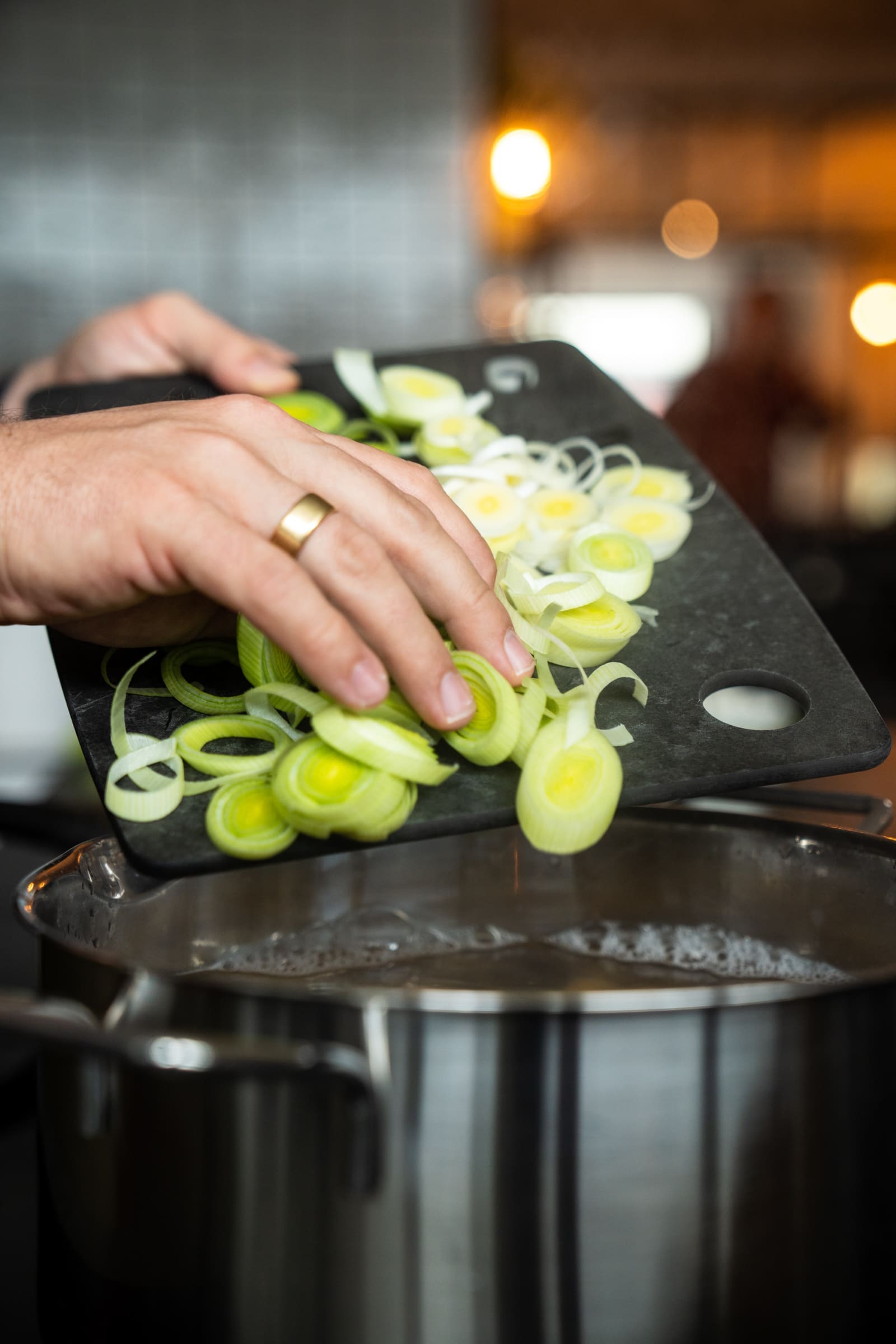 - Schneidet den Lauch in dünne Scheiben. Bringt einen großen Topf Wasser zum Kochen und gebt die Nudeln und den Lauch hinein. Kocht die Nudeln nach Packungsanleitung al dente.300 g Pasta, 1 Stange Lauch
