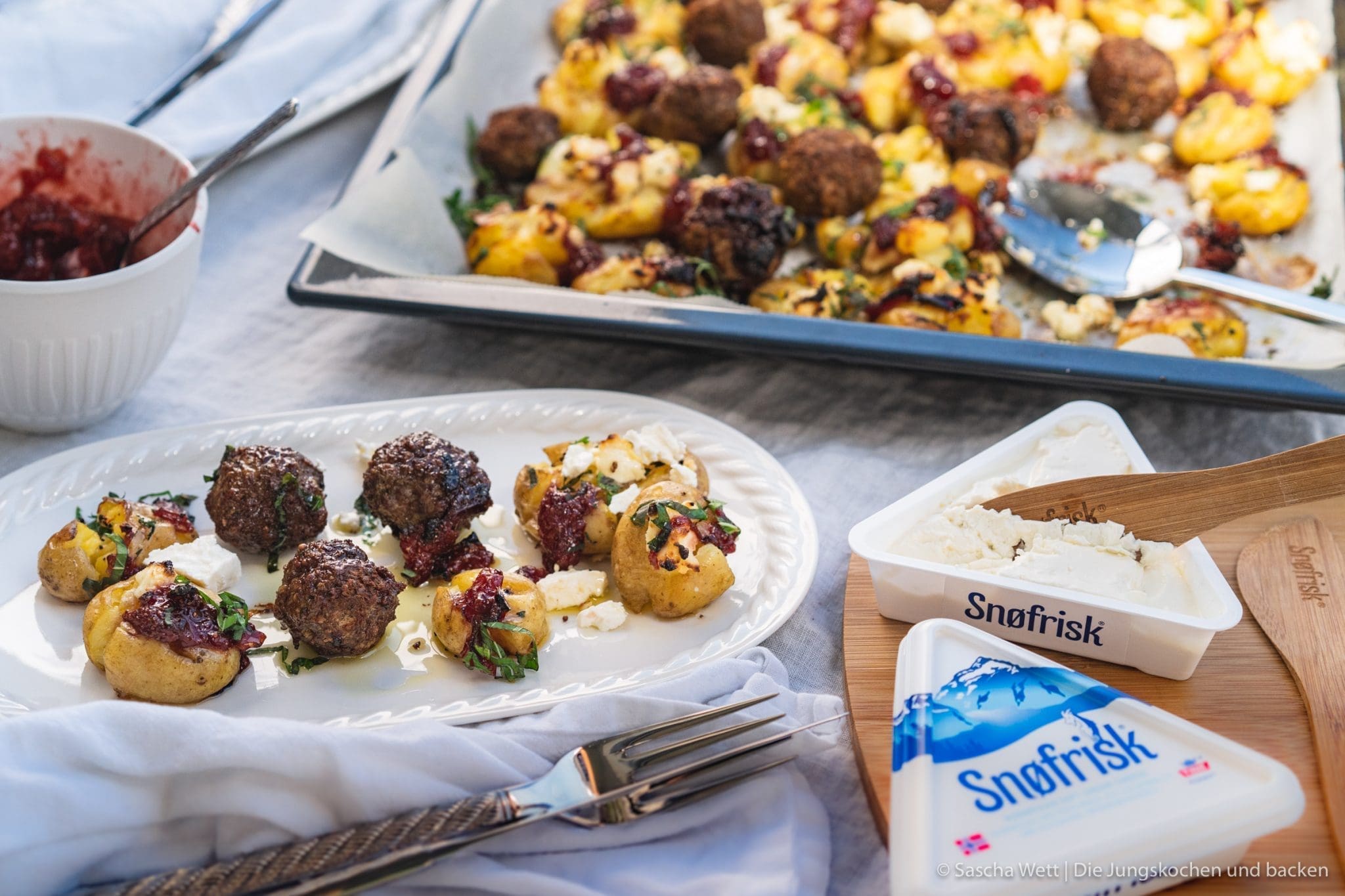 Smashed Potatoes mit Ziegenfrischkäse, Lammhackbällchen & Erdbeerchutney