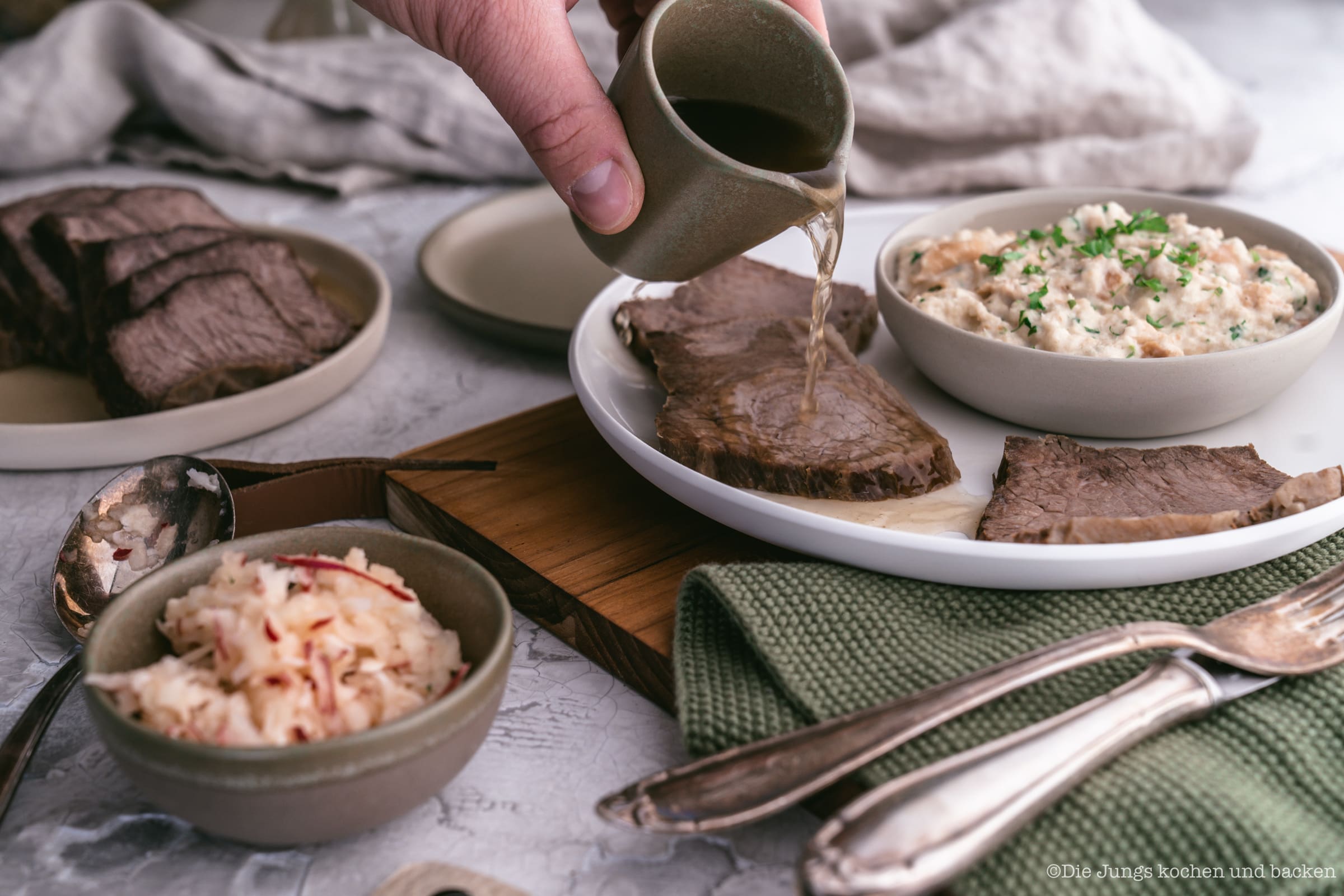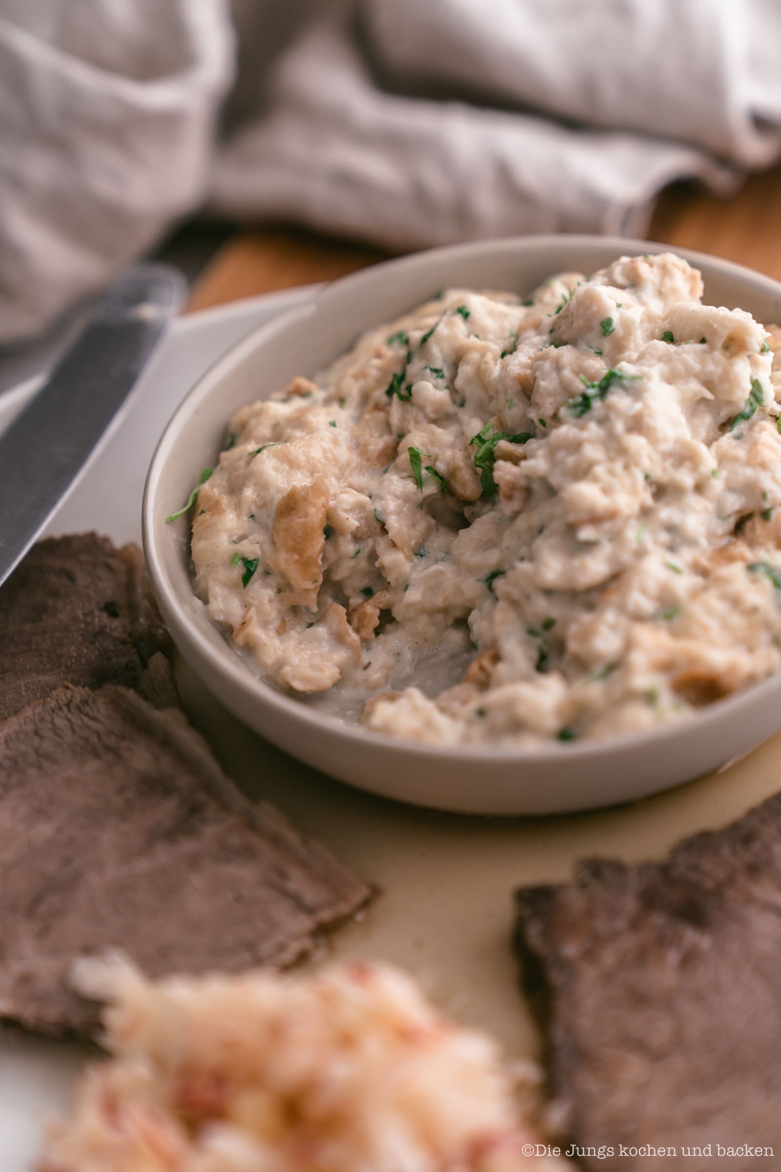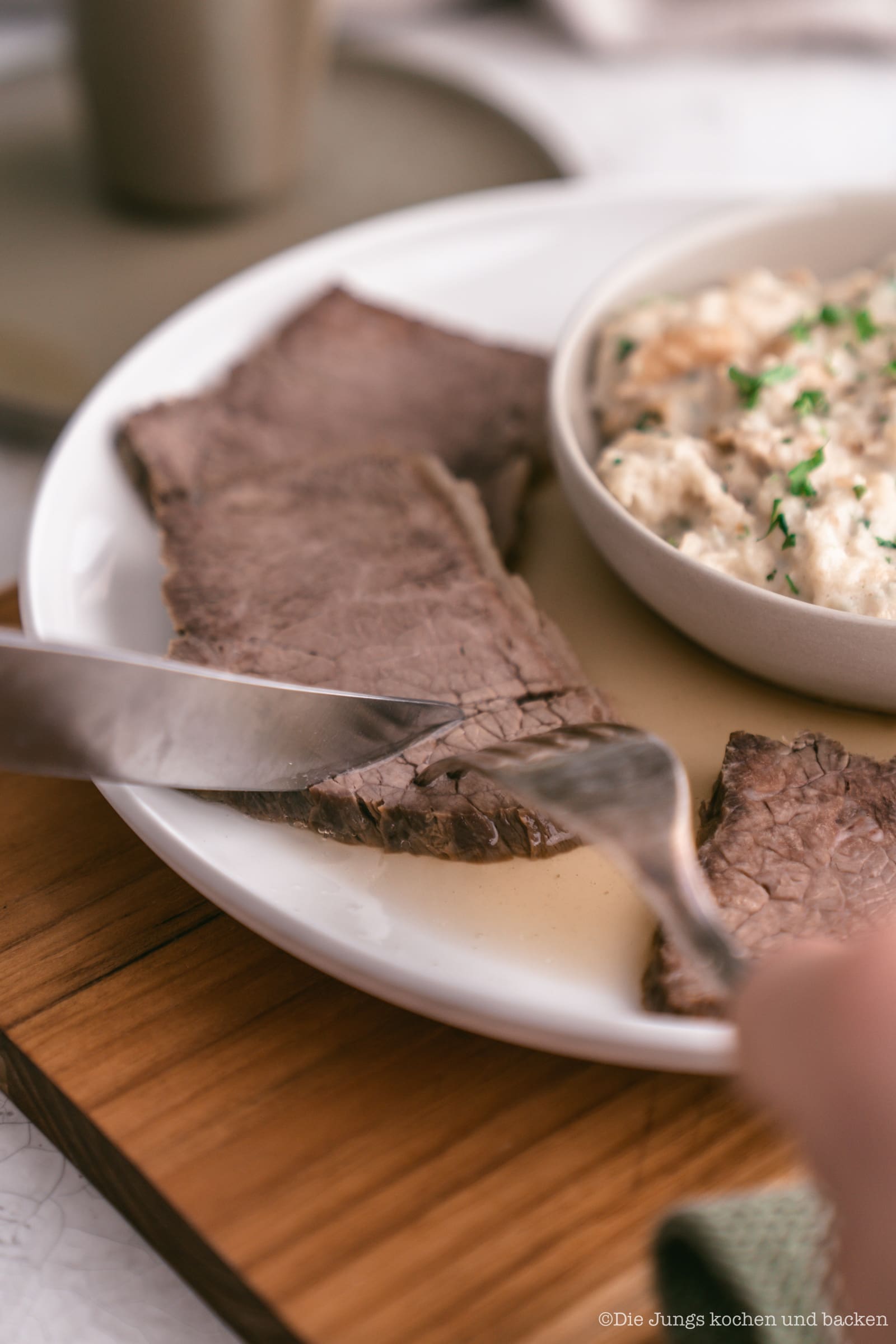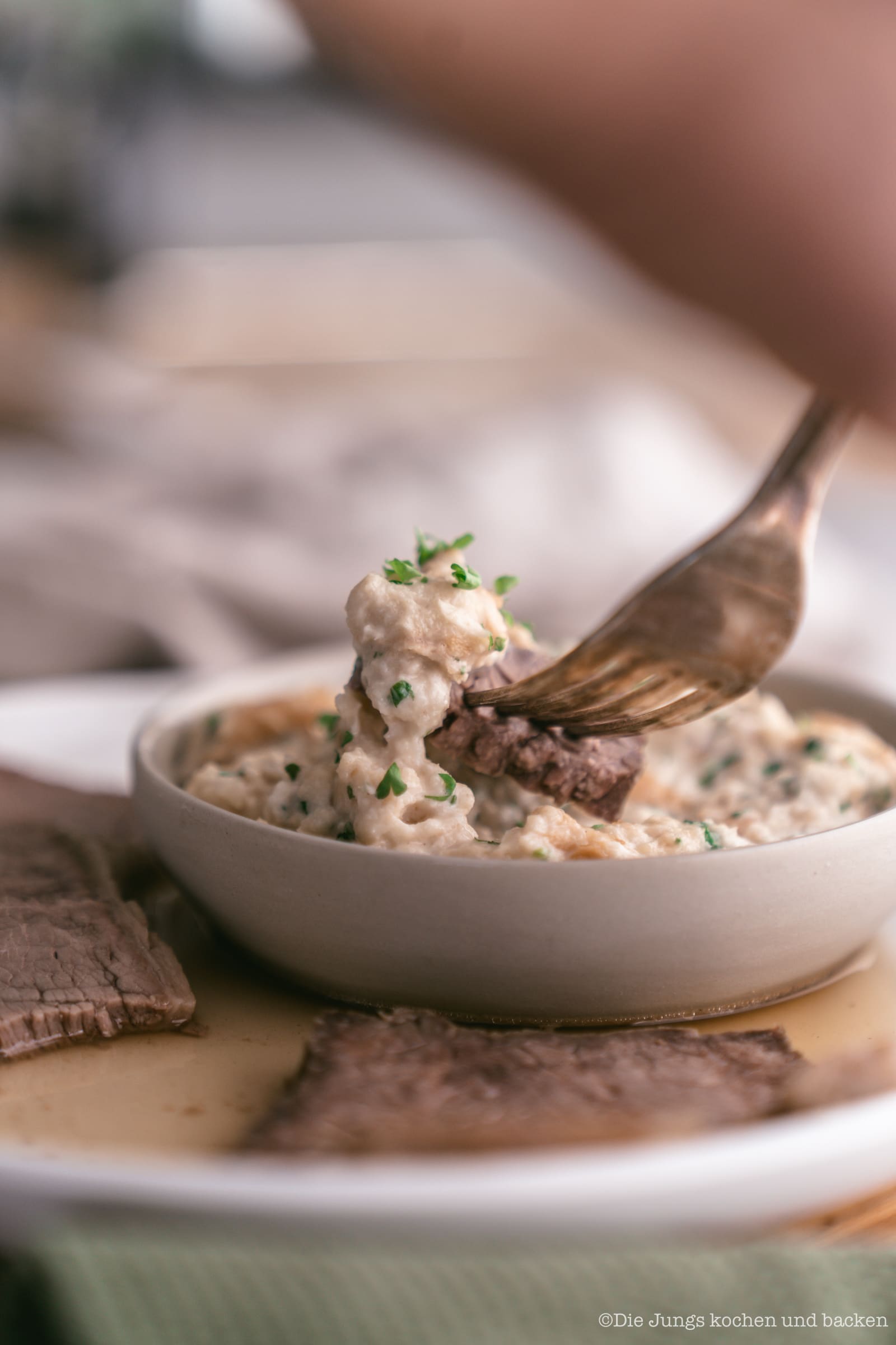 Als erstes ist da natürlich die Rinderbrühe, die beim Kochen des Tafelspitz quasi als Nebenprodukt entsteht. Die haben wir zu Hause früher nie dazu gegessen, sondern separat als Vorspeise verputzt. Dann haben wir einen super saftigen und fruchtigen Apfelkren zubereitet. Das ist schon ein scharfer Knaller und für mich genau das Richtige. Aber das Highlight von Sascha ist definitiv der Semmelkren. Unfassbar lecker! Das, was auf unserem Teller dann noch fehlt, ist die “Altwiener Schnittlauchsauce”. Aber die werden wir euch auch noch demnächst einmal zeigen, denn wir finden, dass die auch zu vielen anderen Gerichten perfekt passt und nicht zwangsläufig zum Tafelspitz serviert werden muss.