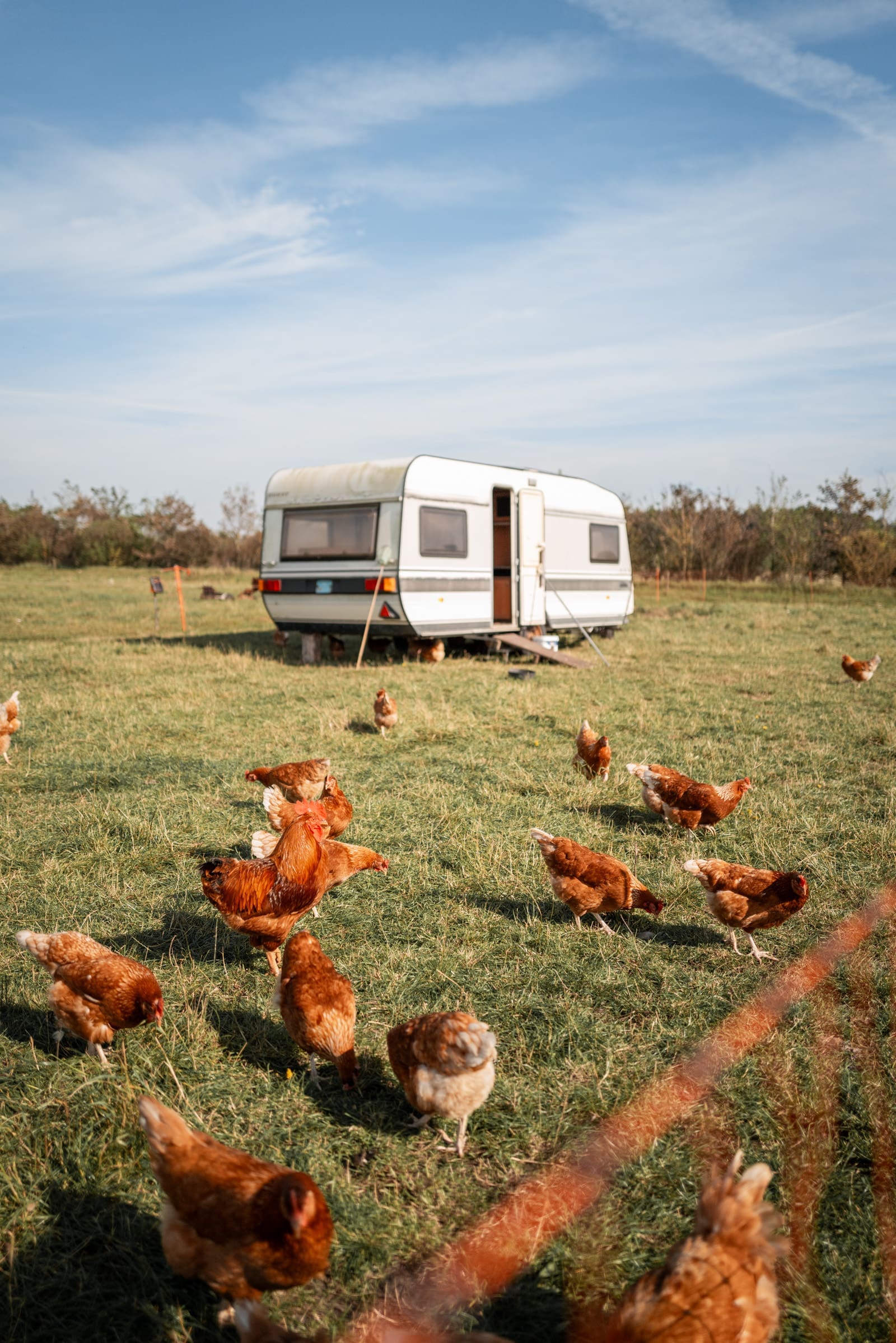 - Als erstes kommen Hühner auf ein Stück Feld. Diese düngen dann auf natürliche Weise und lassen das Gras sprießen.