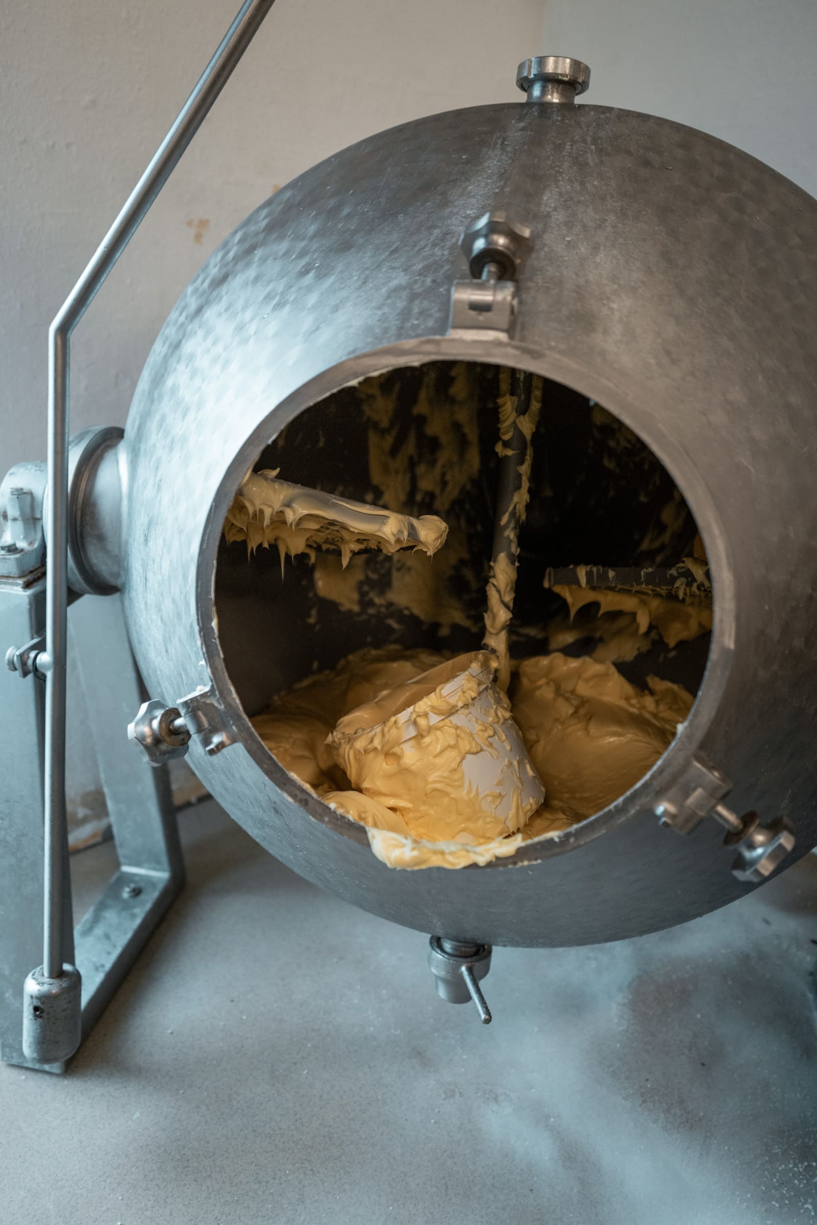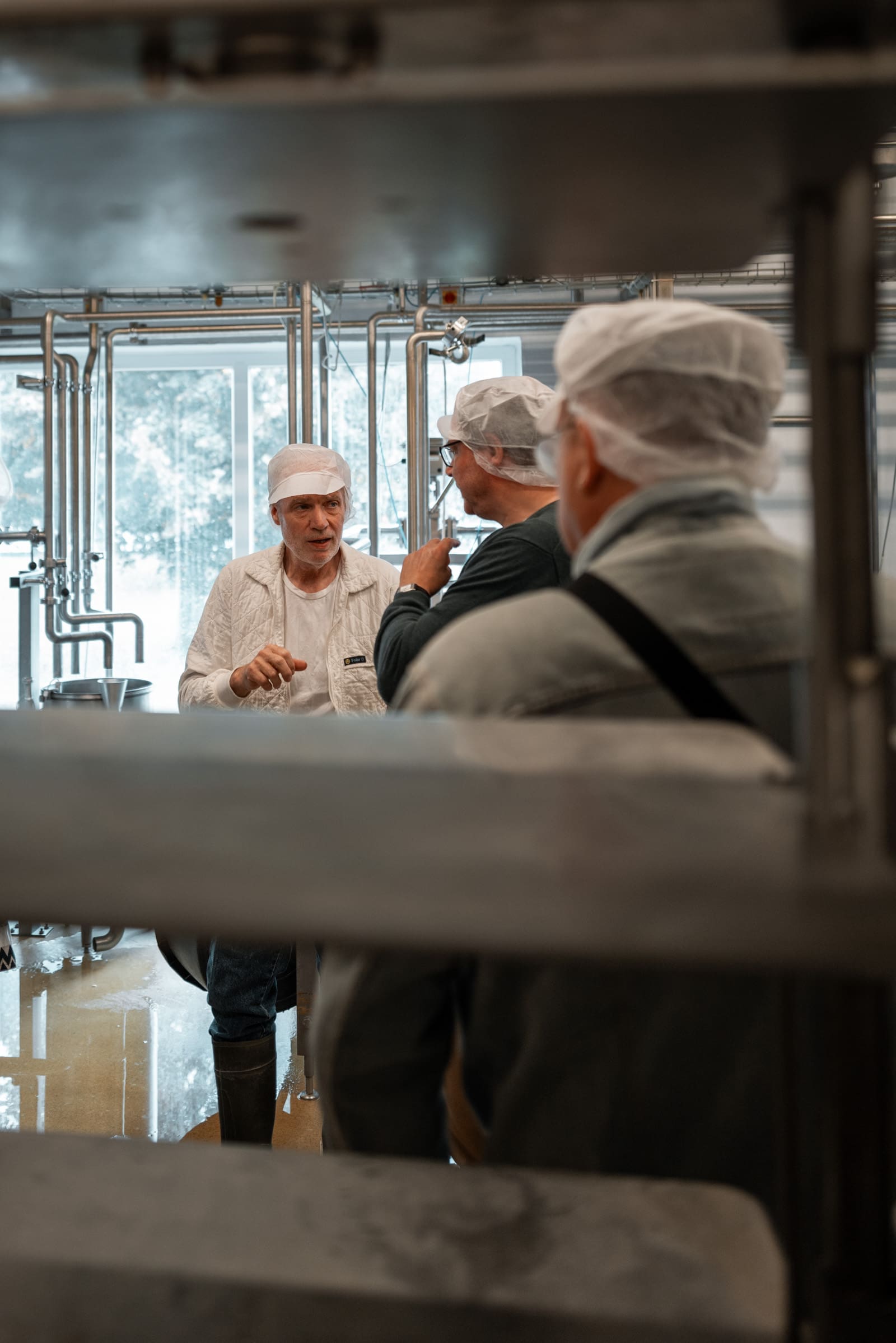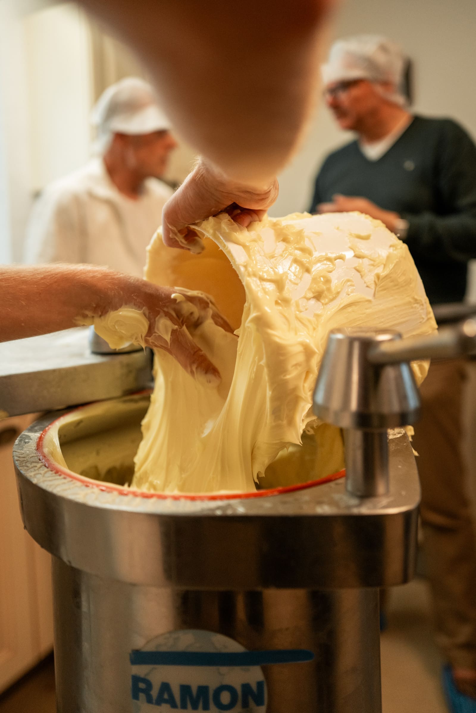 Nördlich von Brønderslev liegt die unscheinbare Hofmolkerei Sønderhaven, ein Ort, der preisgekrönten Käse und andere Milchprodukte herstellt, und das aus eigener Milch – das ist eine echte Besonderheit, denn nur noch wenige Molkereien greifen auf Milch aus eigener Produktion zurück. Als wir dort ankamen, war die Vorfreude schon sehr groß, denn wir lieben Käse und waren gespannt darauf, die Produktion hautnah zu erleben. Dort gab es auch eine waschechte Überraschung für uns, denn in einem Produktionsraum war ein riesiger “Betonmischer” zu sehen, der prall gefüllt mit Butter war. Preben, der Molkereichef, verriet uns ganz nebenbei, dass ihre Butter auch im Noma, einem der besten Restaurants der Welt, verwendet wird. Wow, das hat uns total beeindruckt! SPOILER ALERT: Nachdem wir sie probiert haben, wundert uns das nicht!