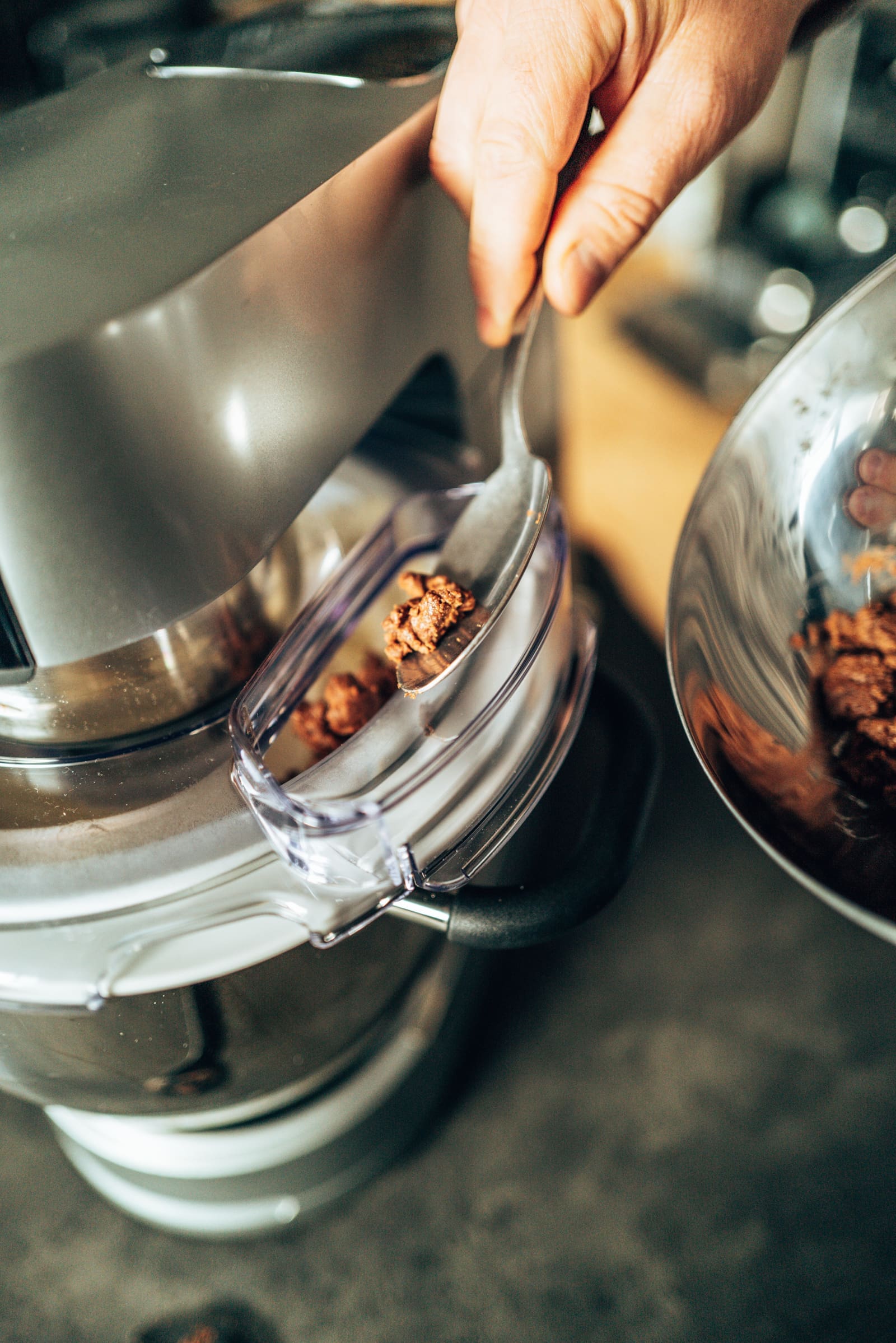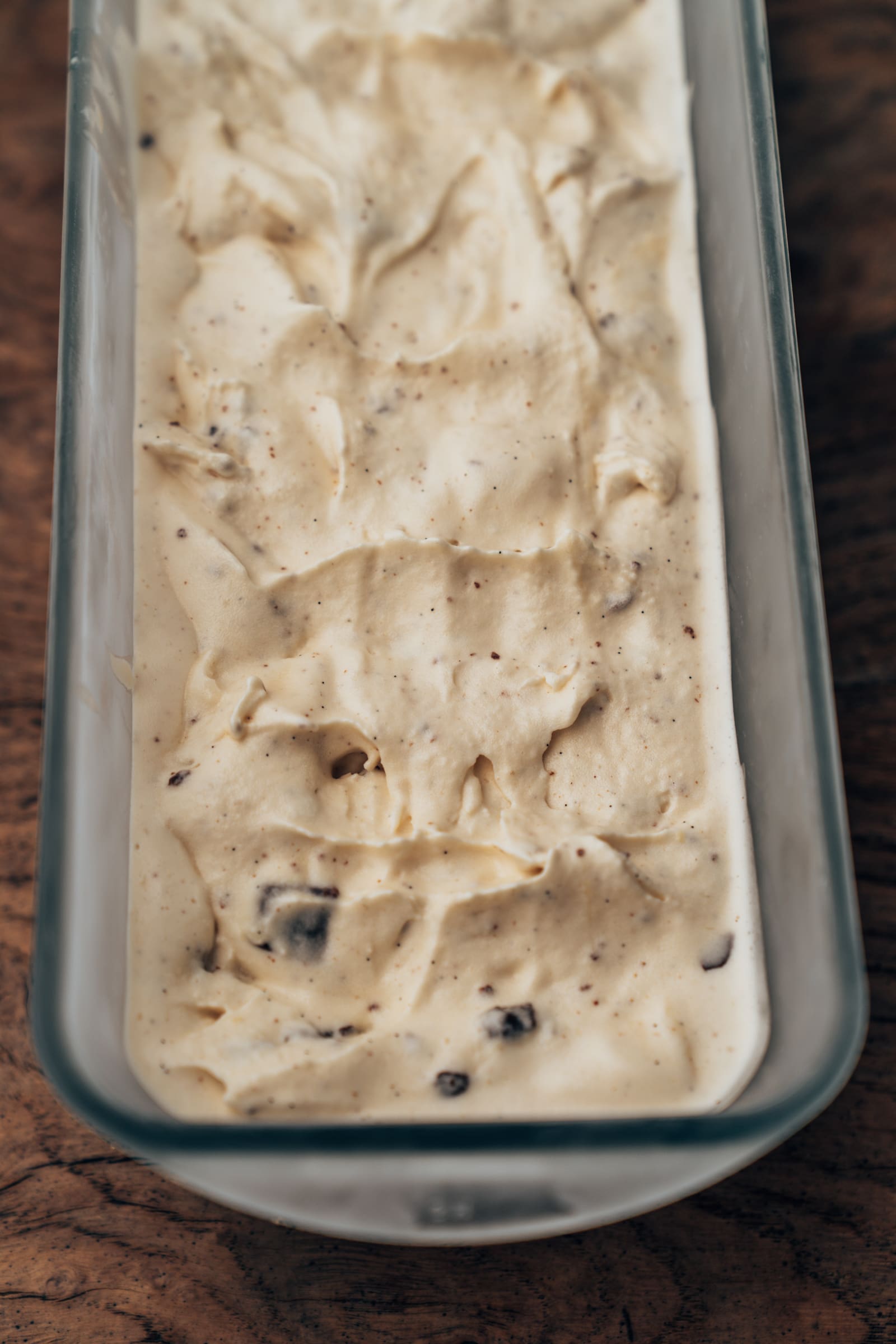 - Nach den 30 Minuten gebt die Schokolade zur Eismasse, lasst die Masse in der Maschine weitere 15 Minuten zum Gefrieren rühren und füllt sie in einen luftdichten Behäter ab, den ihr sofort einfriert.