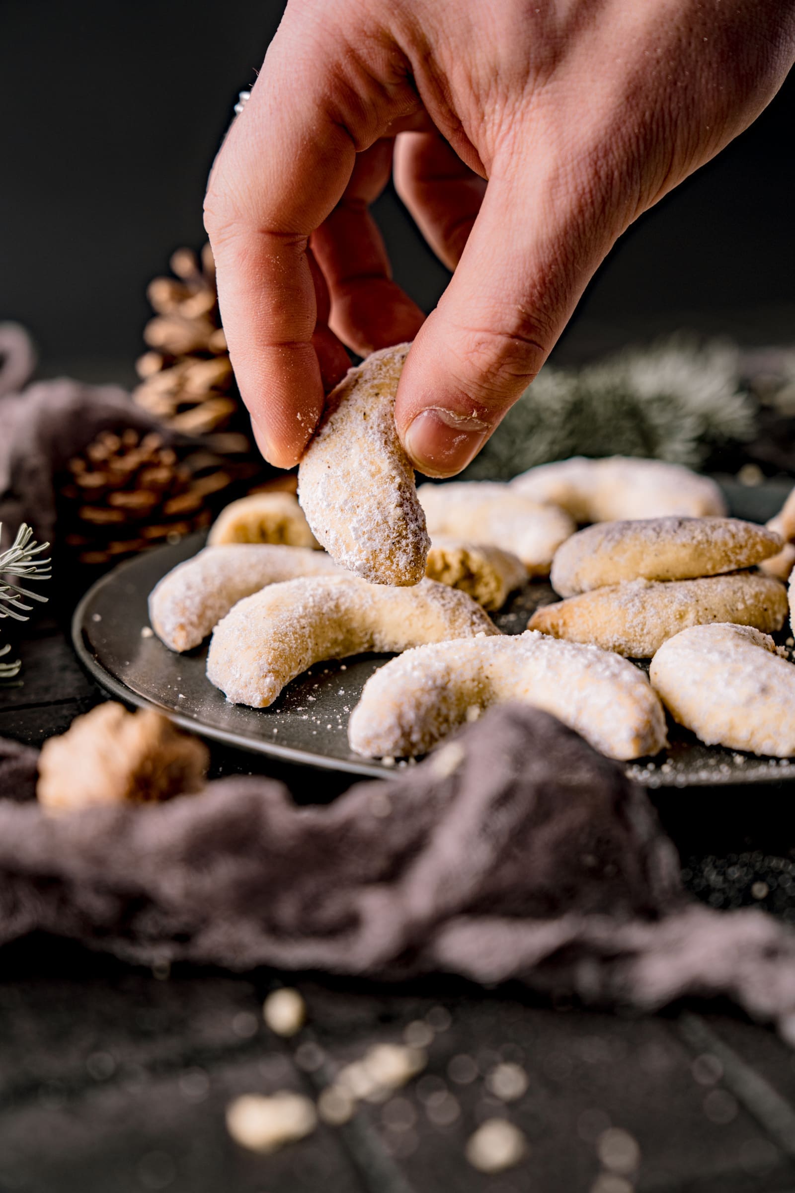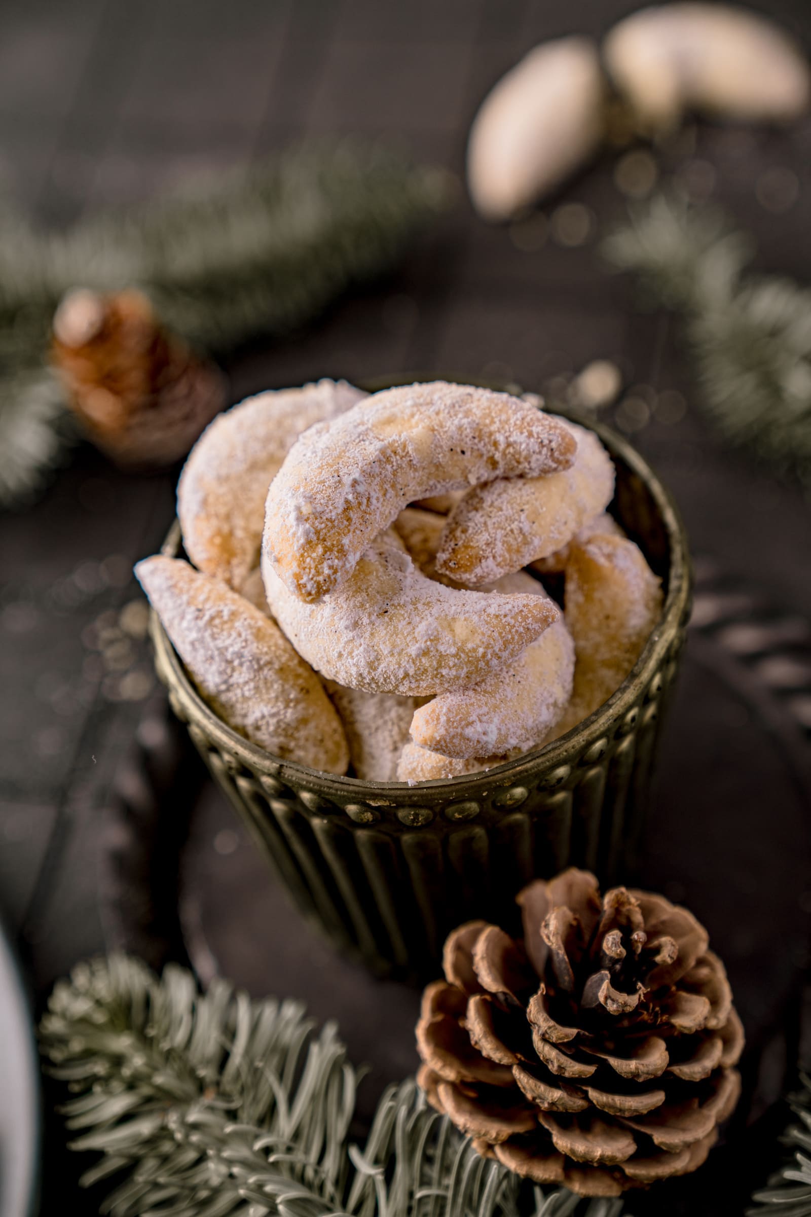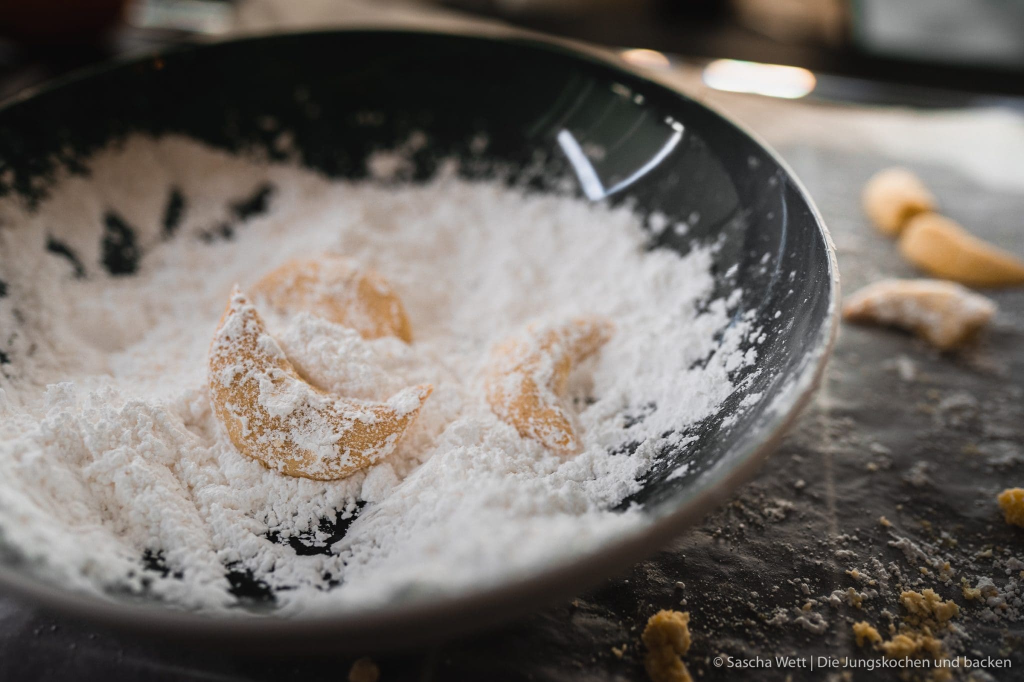Bei den meisten Plätzchen greifen wir, ihr werdet es euch denken können, auf Familienrezepte zurück. Mal von meiner und mal von Torstens Familie. Aber komischerweise haben wir bei den Vanillekipferln keines dieser Rezepte genutzt. Wir haben uns durch Bücher, Zeitschriften und das Internet gewühlt und haben uns so Stück für Stück unser eigenes Rezept gebastelt. Zum Glück haben wir die gleiche Vorstellung von “perfekten” Vanillekipferln. Ganz hell, super mürbe und zartschmelzend im Mund! Man muss sie ganz vorsichtig anfassen, sonst brechen sie auseinander, dann sind sie nach unserem Geschmack. Also haben wir immer wieder am Rezept geschraubt und Unmengen an Vanillekipferln gebacken. Aber Plätzchen kommen schon irgendwie weg. Keine Sorge. Auf jeden Fall haben wir lange an unseren ersten Kipferln herumexperimentiert, bis sie genau so waren, wie wir sie am liebsten mögen …Weihnachtsbäckerei