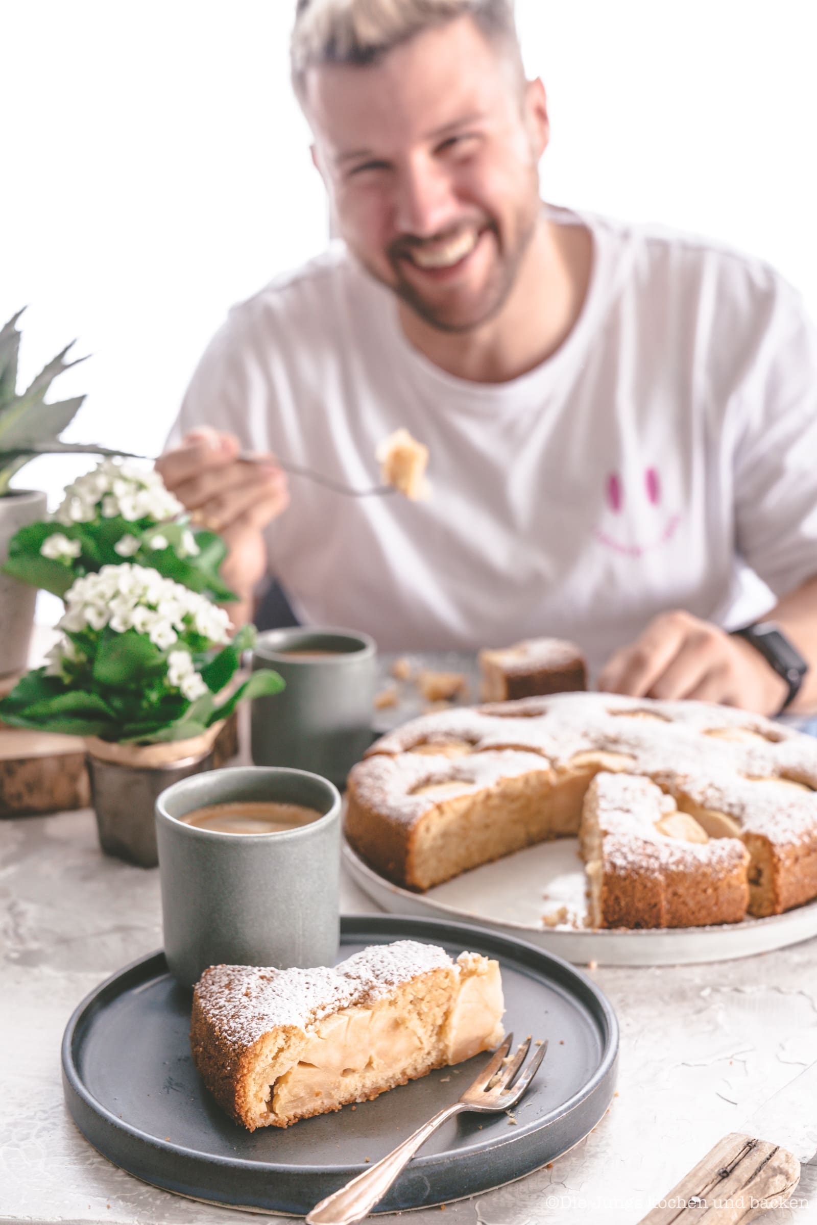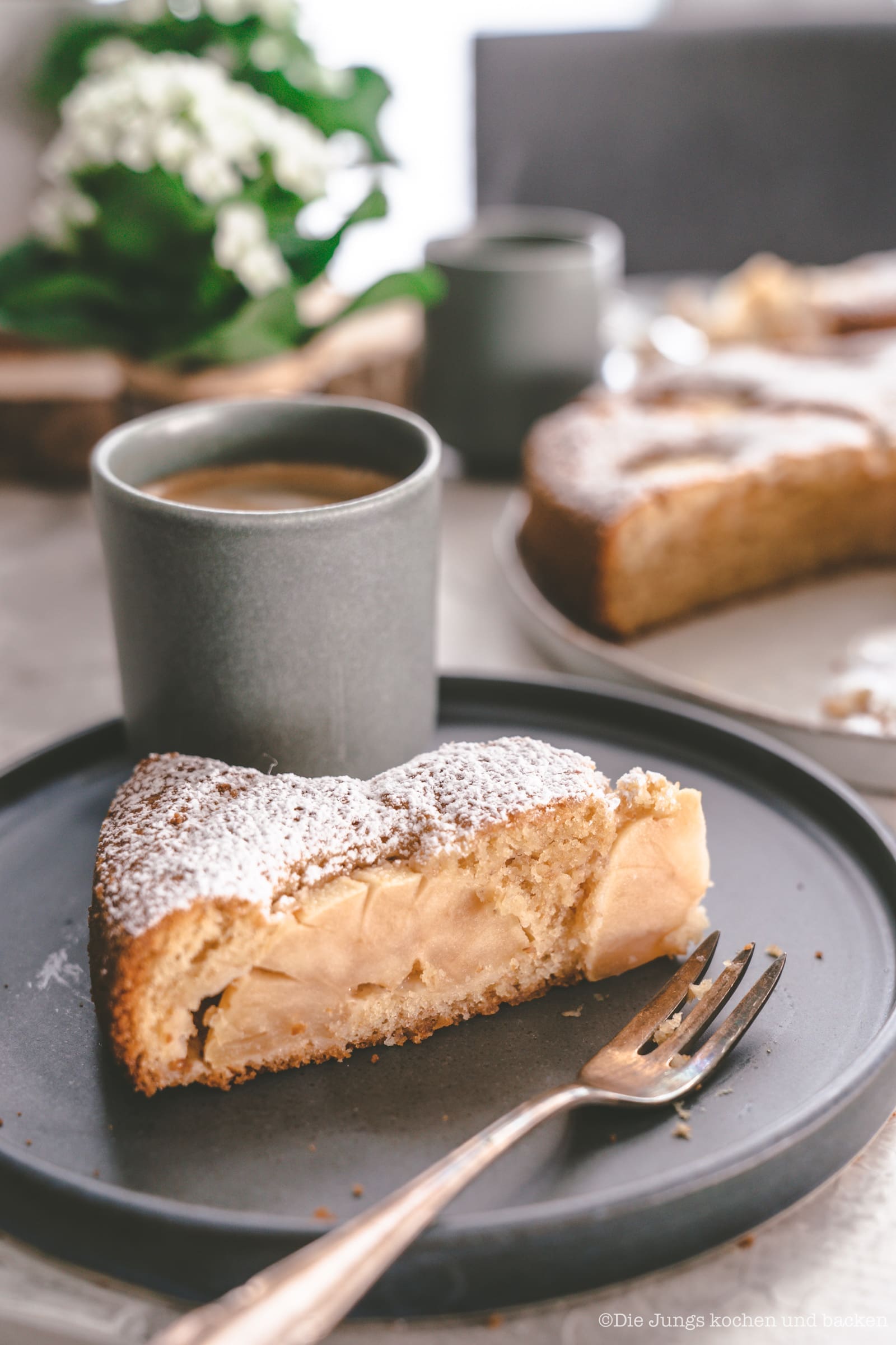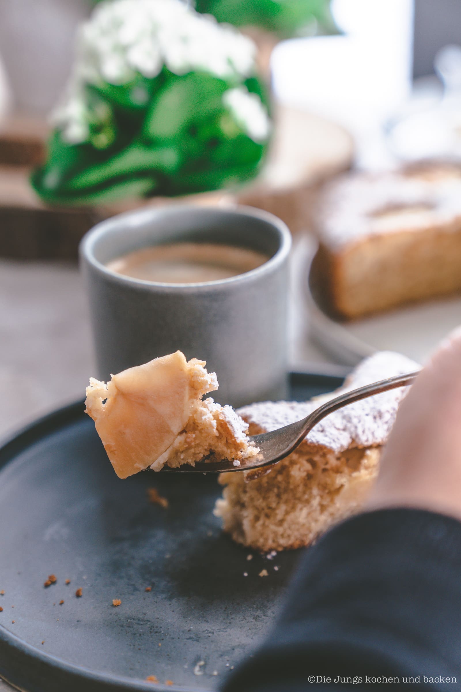 Der Kuchen schmeckt fast so, wie früher. Das liegt an der Kombi aus feinem gebackenen Teig mit dem versenkten Apfel. Aber dazu kommen leicht nussige Aromen und auch ein nur leicht festerer Biss, der den Kuchen aber nicht fest und trocken macht. Er ist genauso saftig, wie früher bei Oma Lore. Versenkter Apfelkuchen mit Vollkornmehl? Ich bin auf jeden Fall totaler Fan davon geworden und wir werden ihn für die alte Dame ganz bald einmal so backen. Mal schauen, was sie dazu sagen wird.